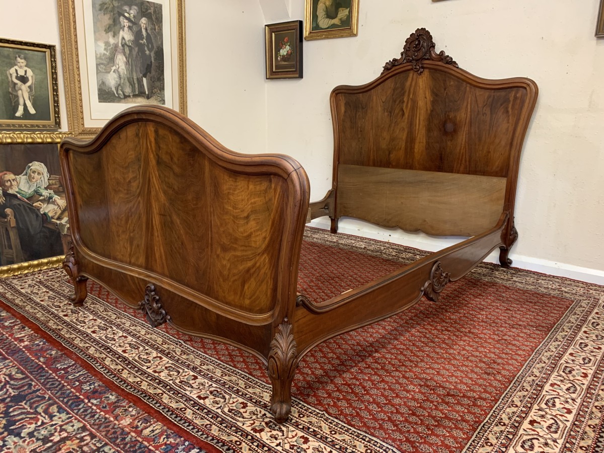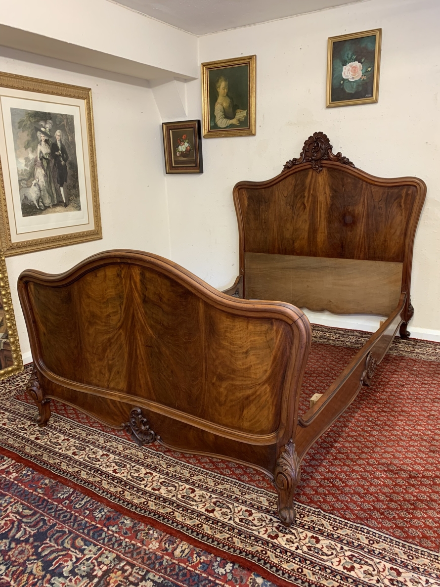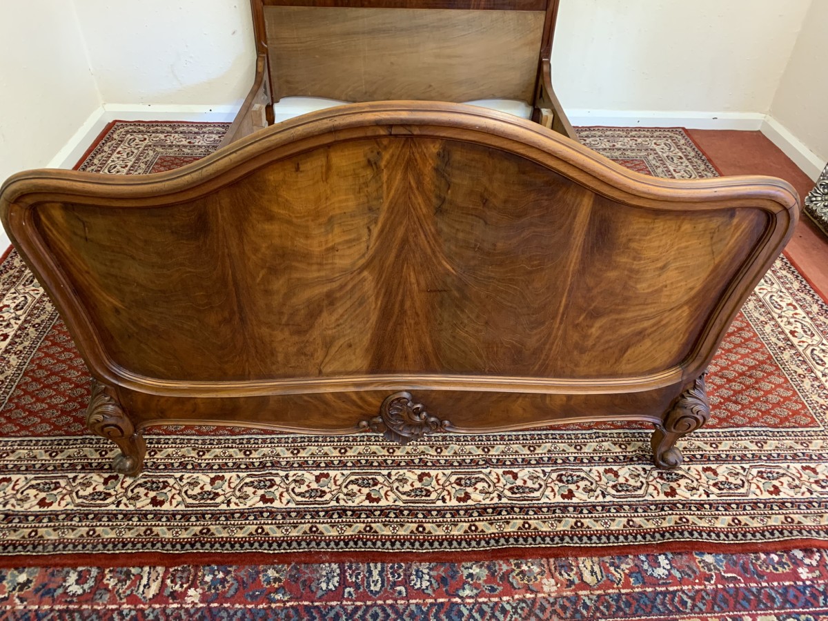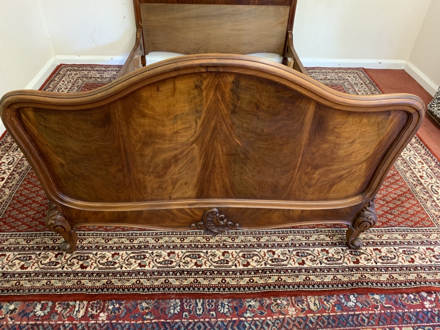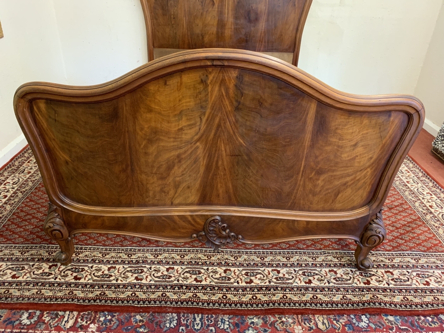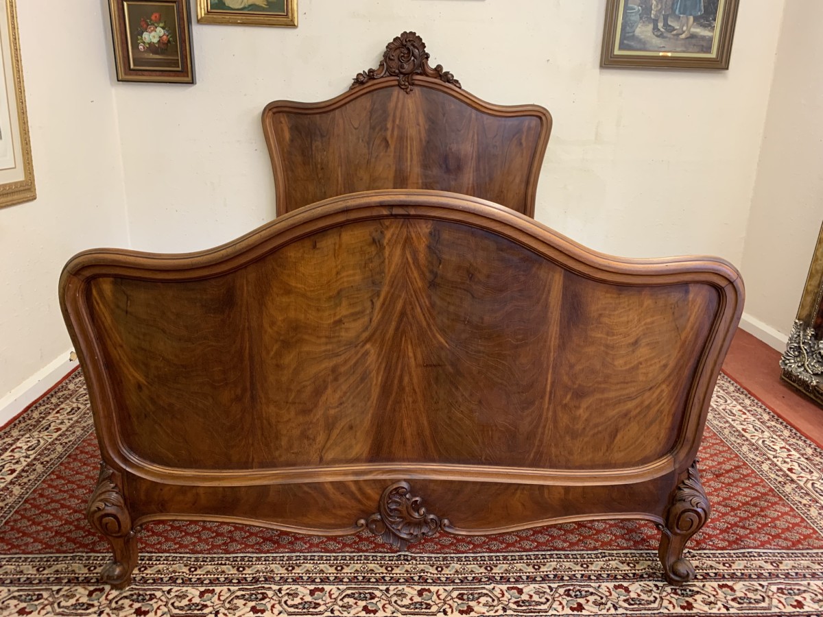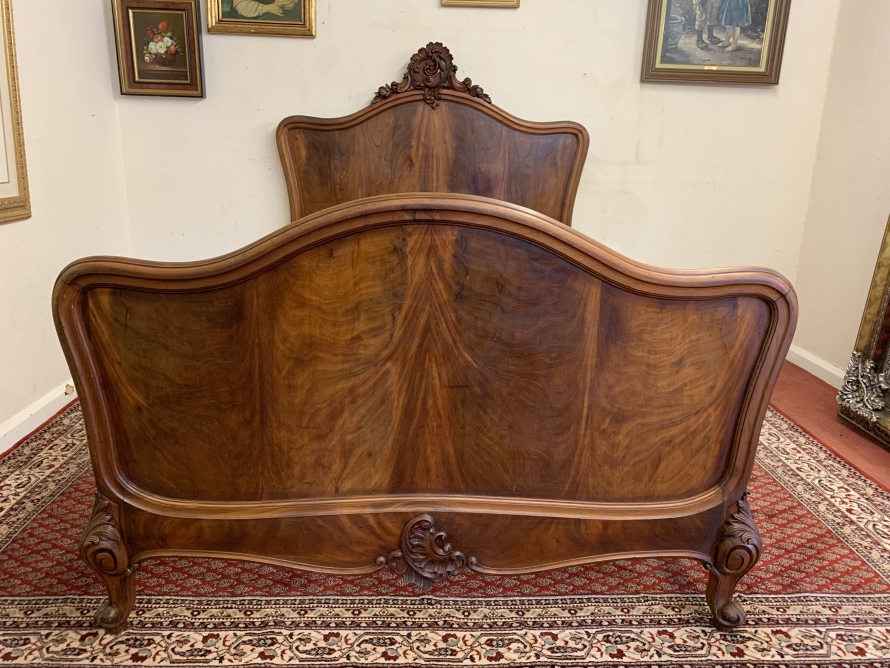 This fabulous quality French antique bed dates circa 1880. The headboard rises to a stunning central carving. Having shaped footboard with carving to the base, shaped side rails, this fantastic bed stands on four impressive carved cabriole legs.