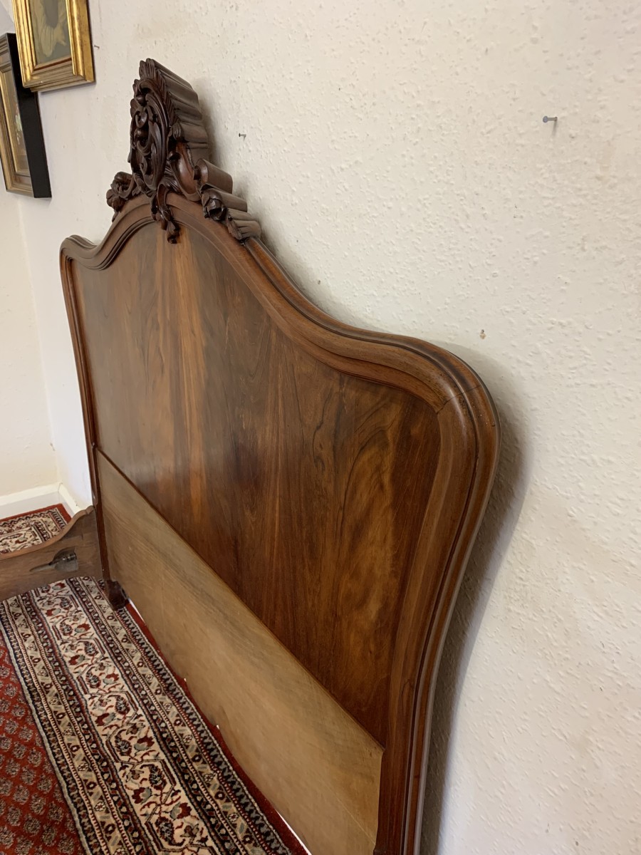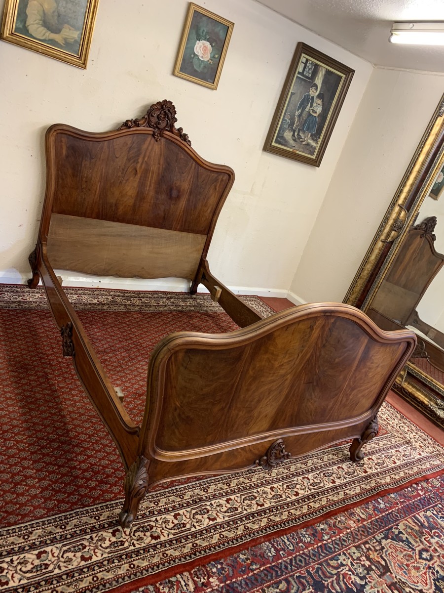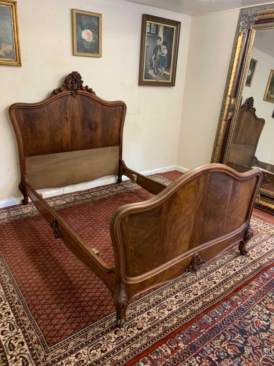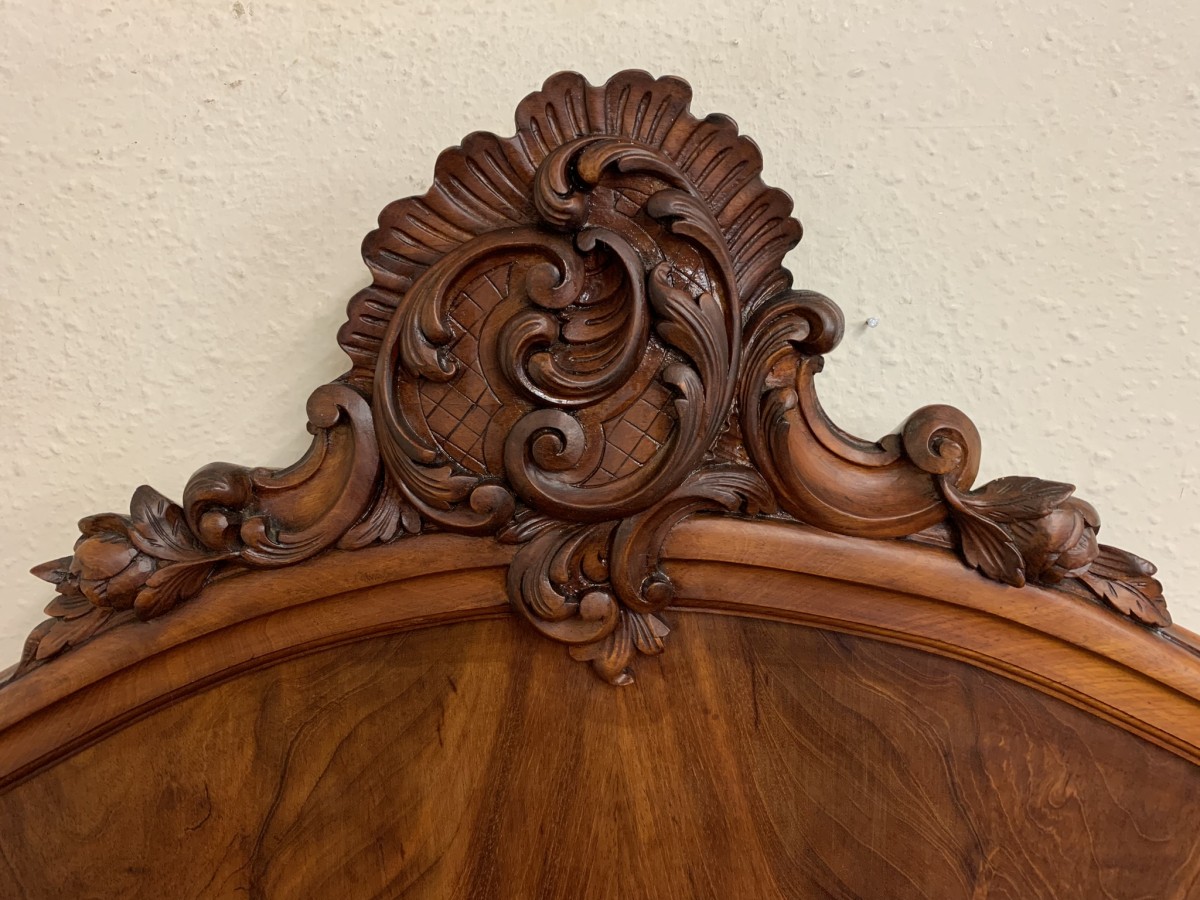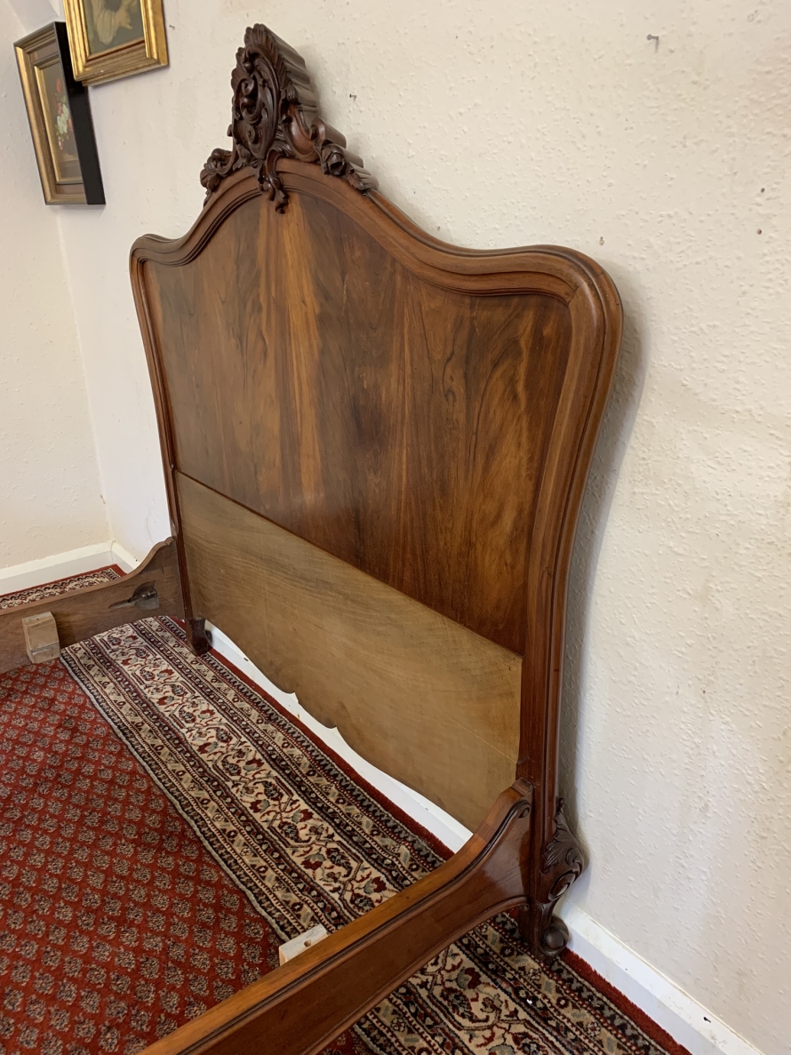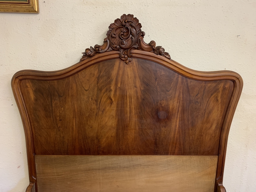 This fabulous quality French antique bed dates circa 1880. The headboard rises to a stunning central carving. Having shaped footboard with carving to the base, shaped side rails, this fantastic bed stands on four impressive carved cabriole legs.