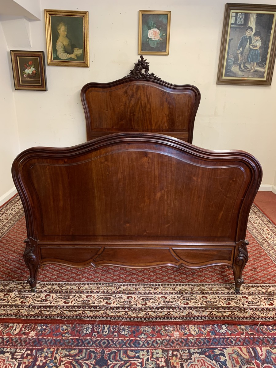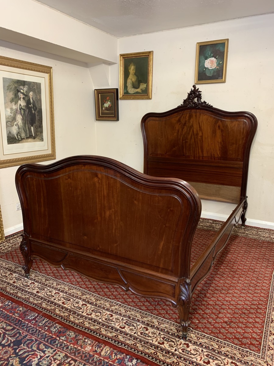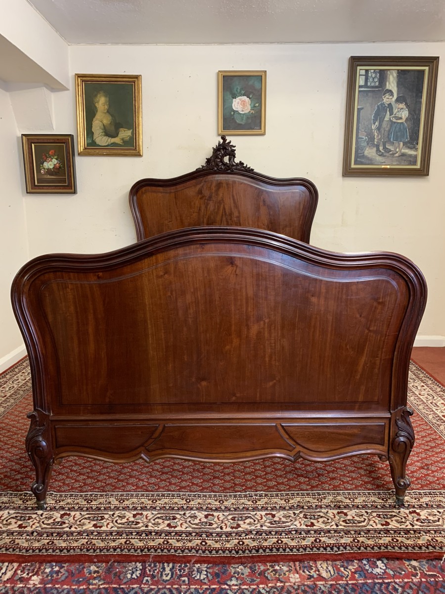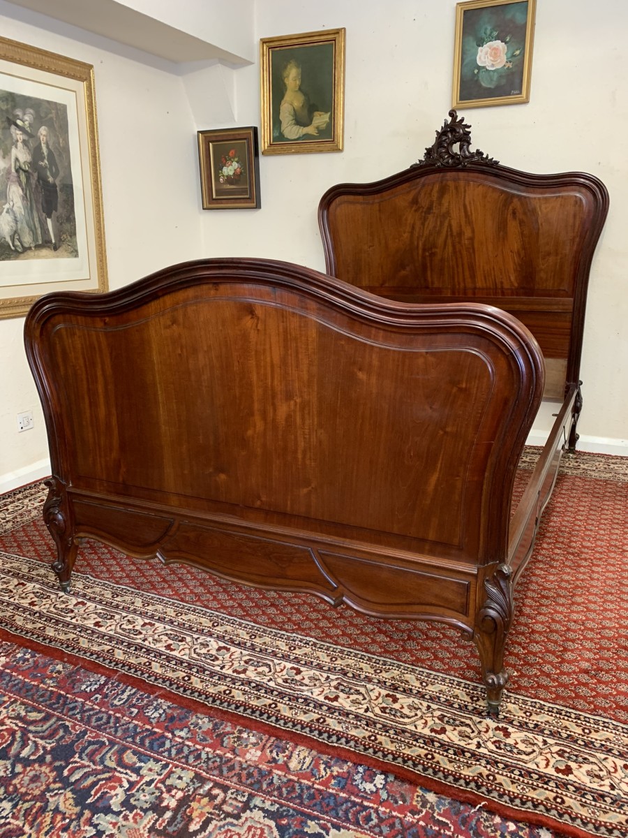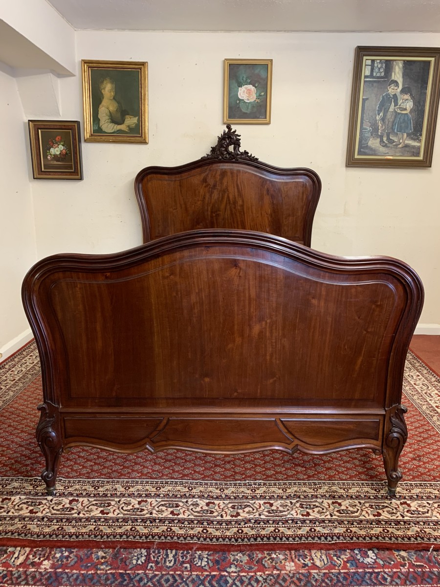 This fabulous bed dates circa 1880. The headboard rises to a fantastic central carving, there is a shaped panel below. The footboard also has a shaped panel. The the bed has shaped side rails and stands on four carved cabriole legs on original brass casters.