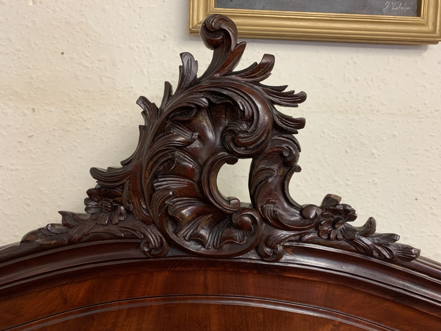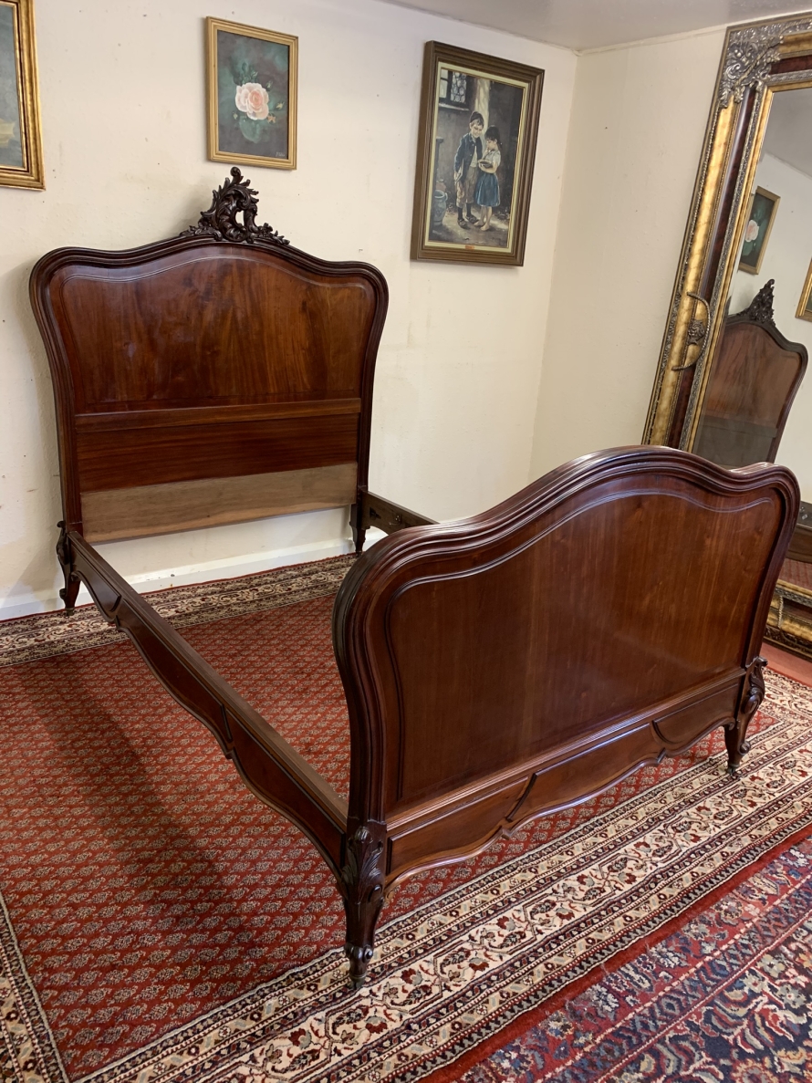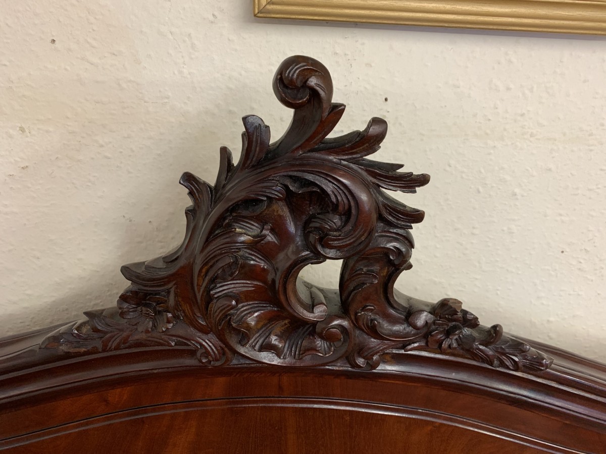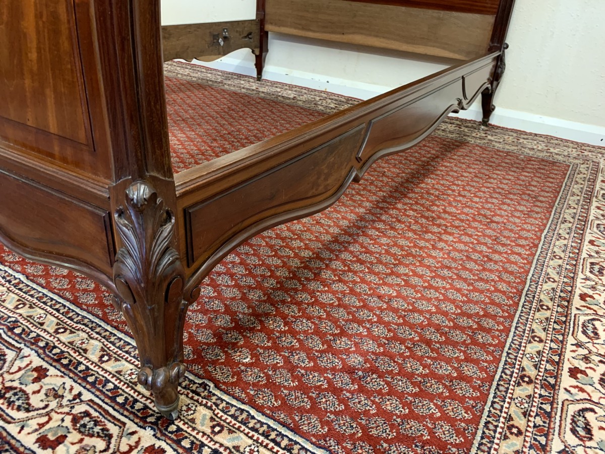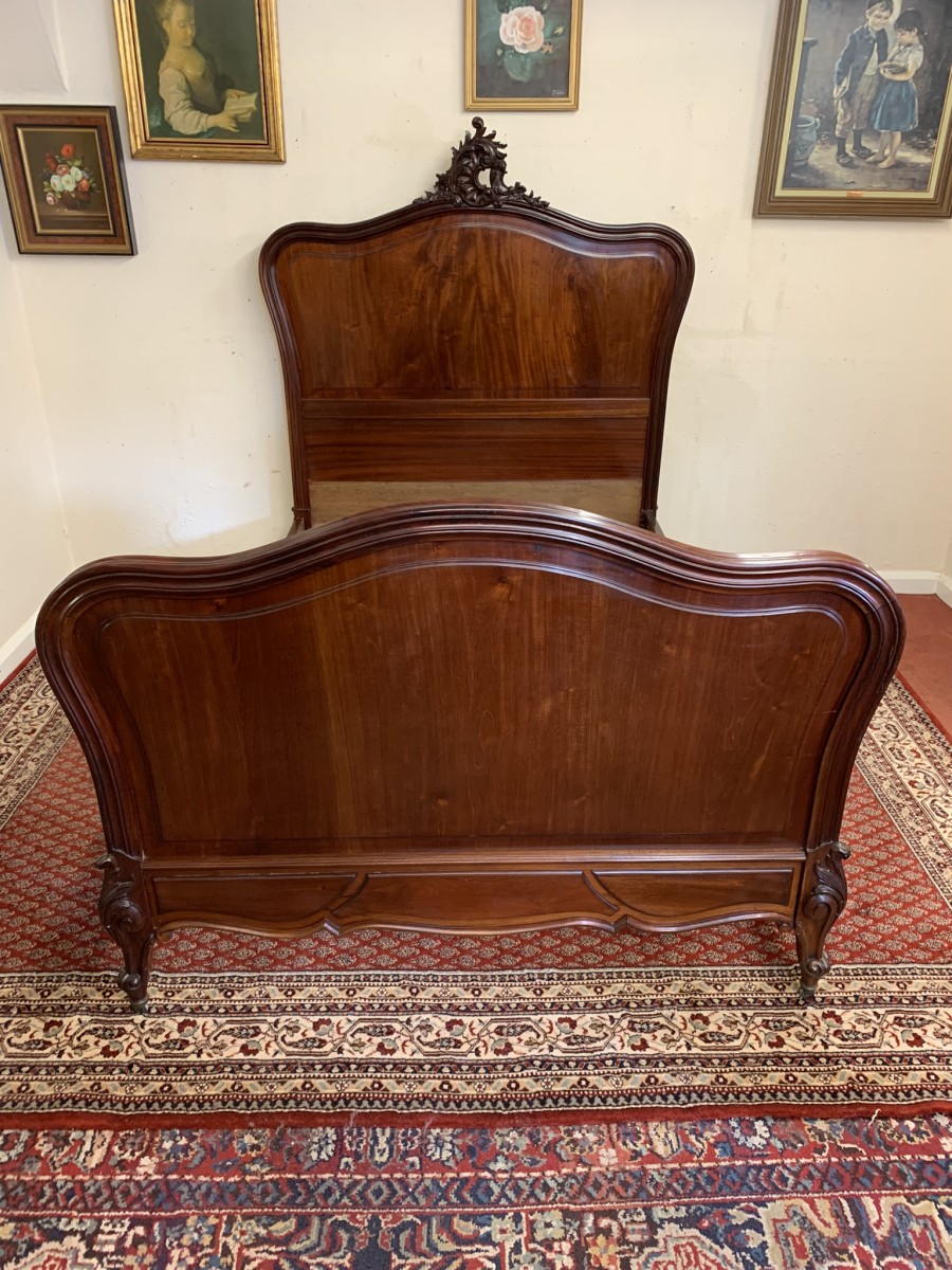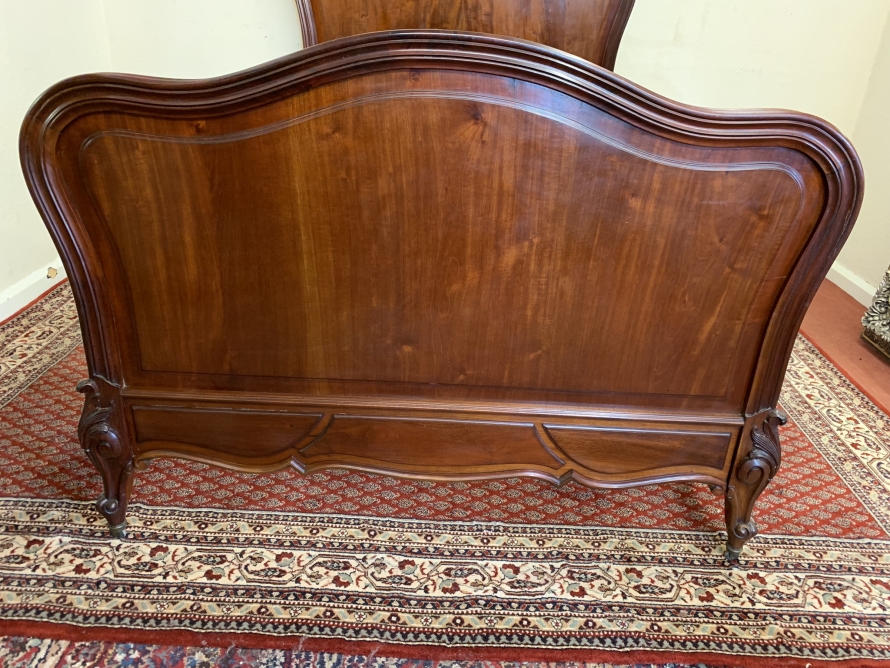 This fabulous bed dates circa 1880. The headboard rises to a fantastic central carving, there is a shaped panel below. The footboard also has a shaped panel. The the bed has shaped side rails and stands on four carved cabriole legs on original brass casters.
