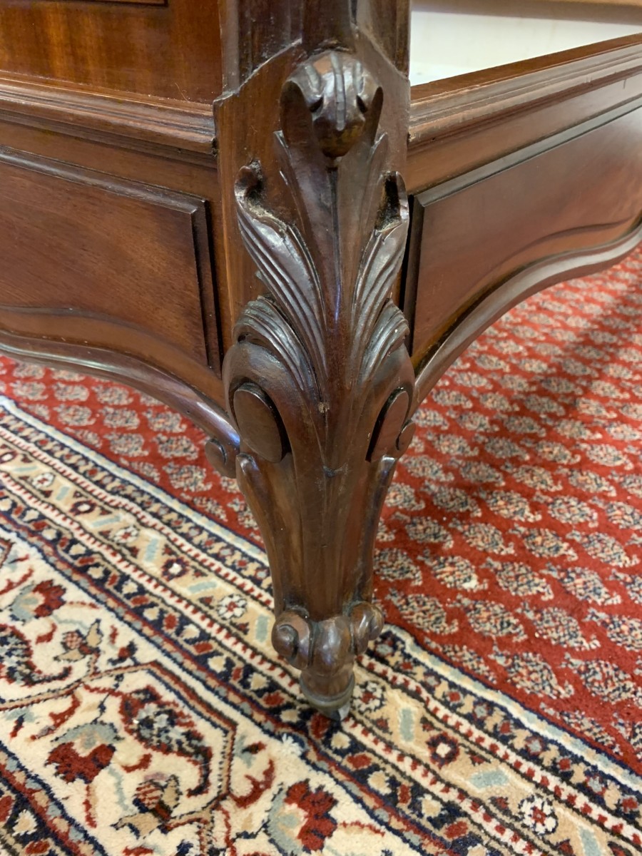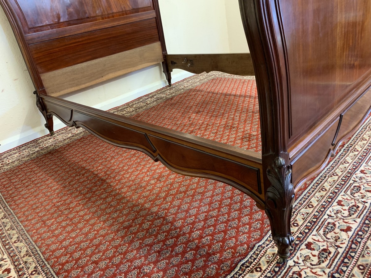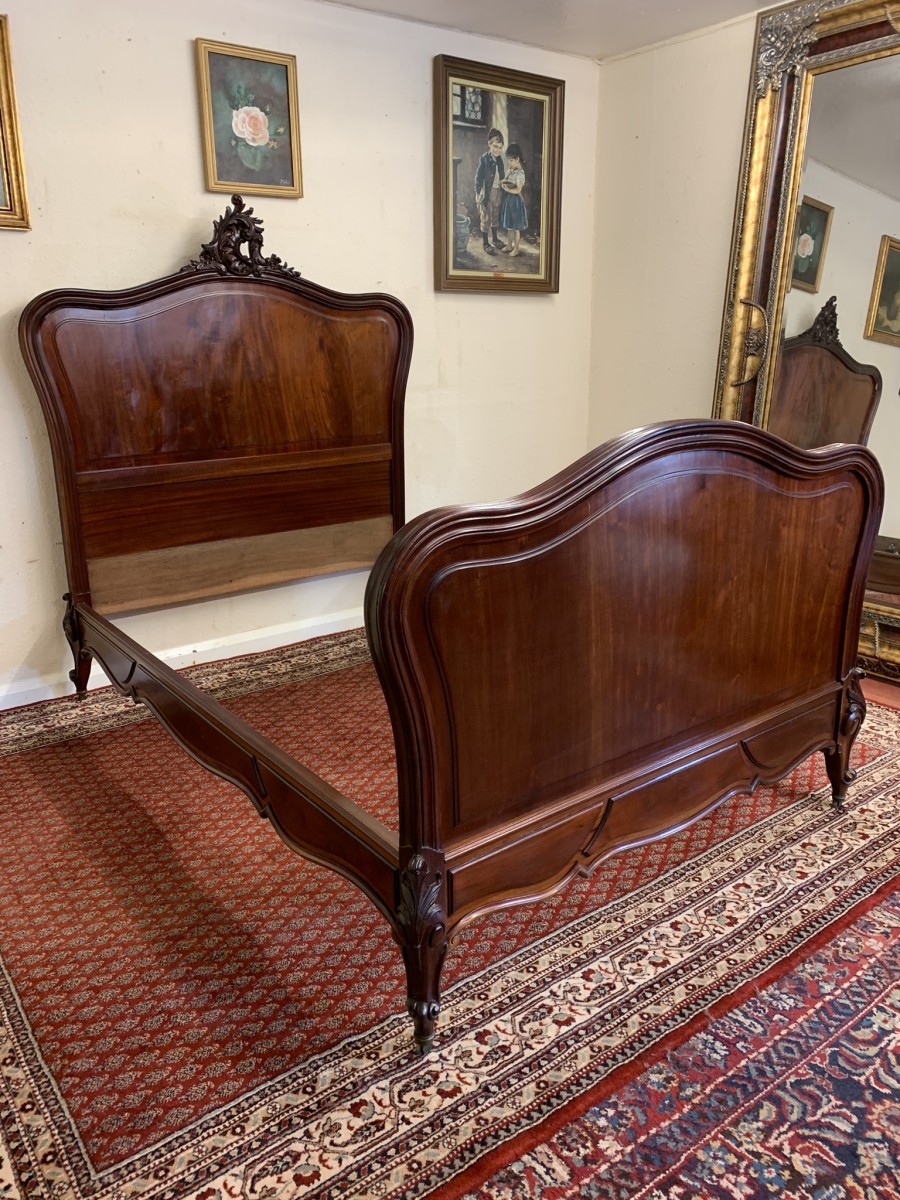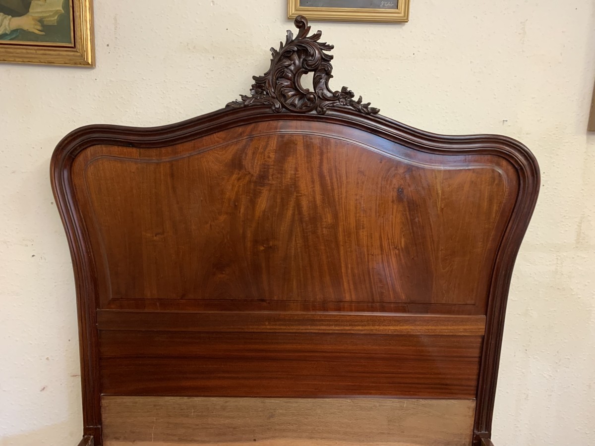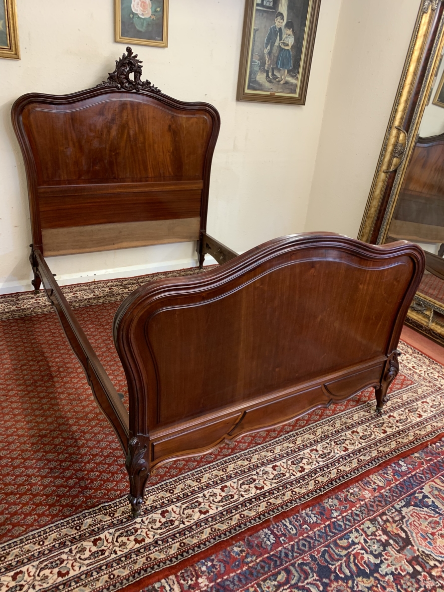 This fabulous bed dates circa 1880. The headboard rises to a fantastic central carving, there is a shaped panel below. The footboard also has a shaped panel. The the bed has shaped side rails and stands on four carved cabriole legs on original brass casters.