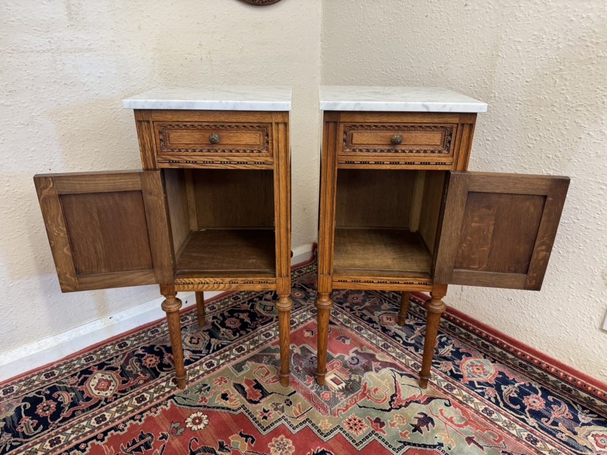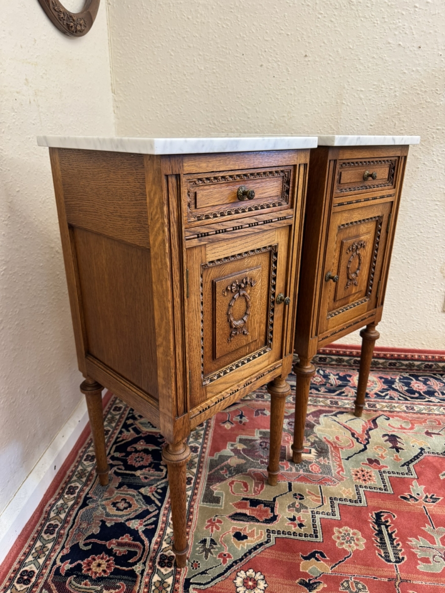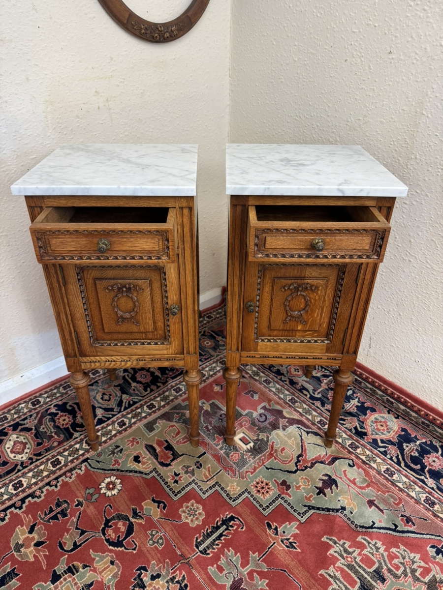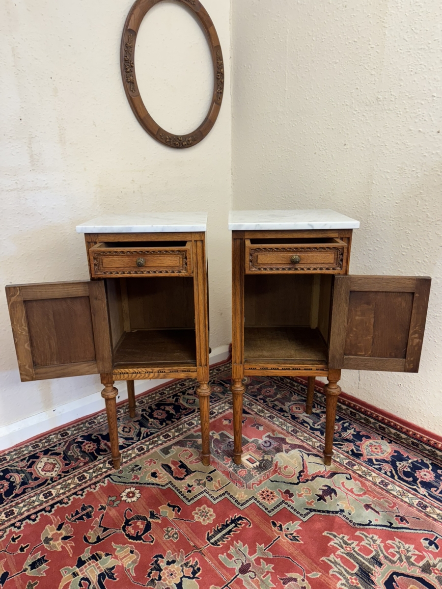These fine bedside cabinets date circa 1900. The carrara white marble top sits above a carved drawer, the drawer has a ornate gilt brass handle, below is a carved recessed panelled cupboard door, the door also has a gilt brass ornate handle. The doors open to reveal storage. Recessed panelled sides and standing on four elegant turned legs.