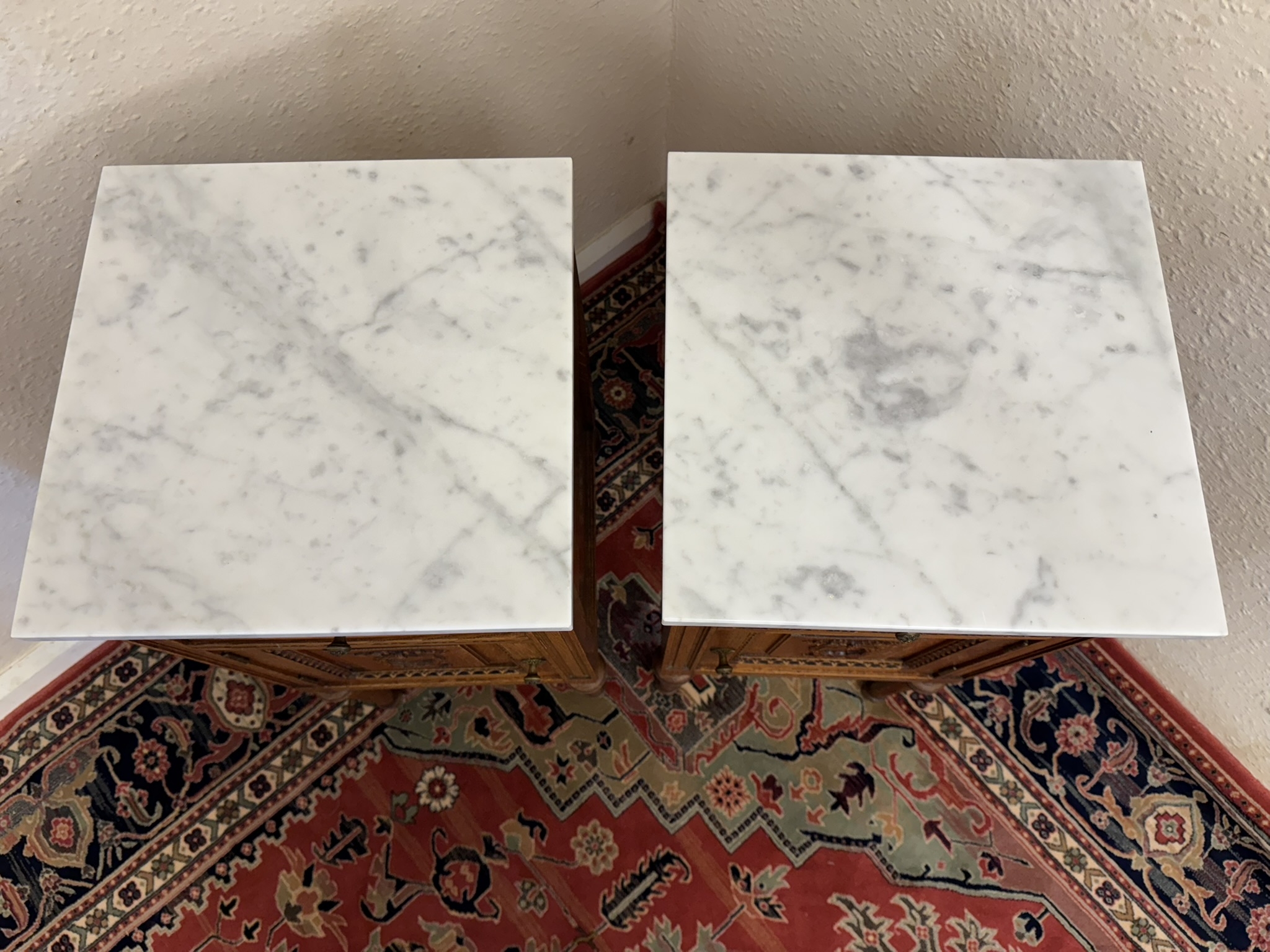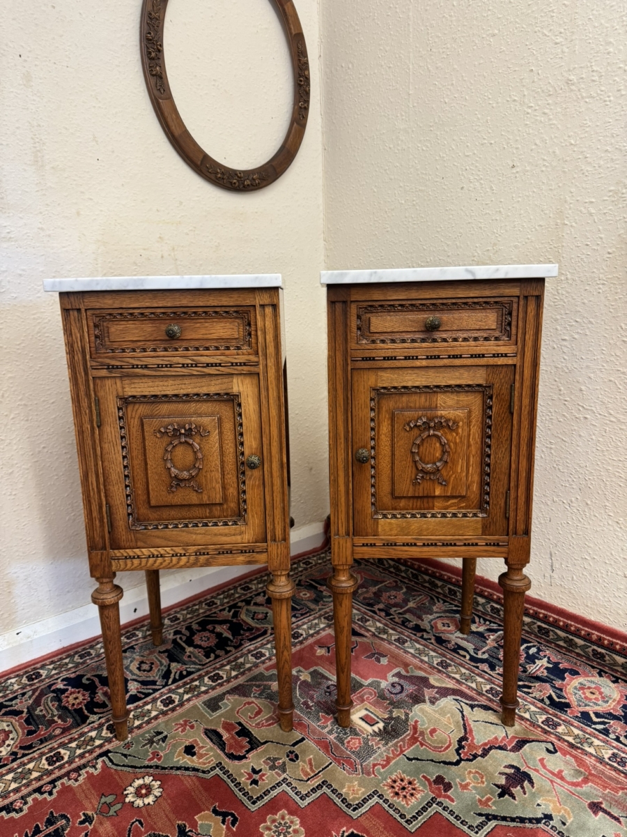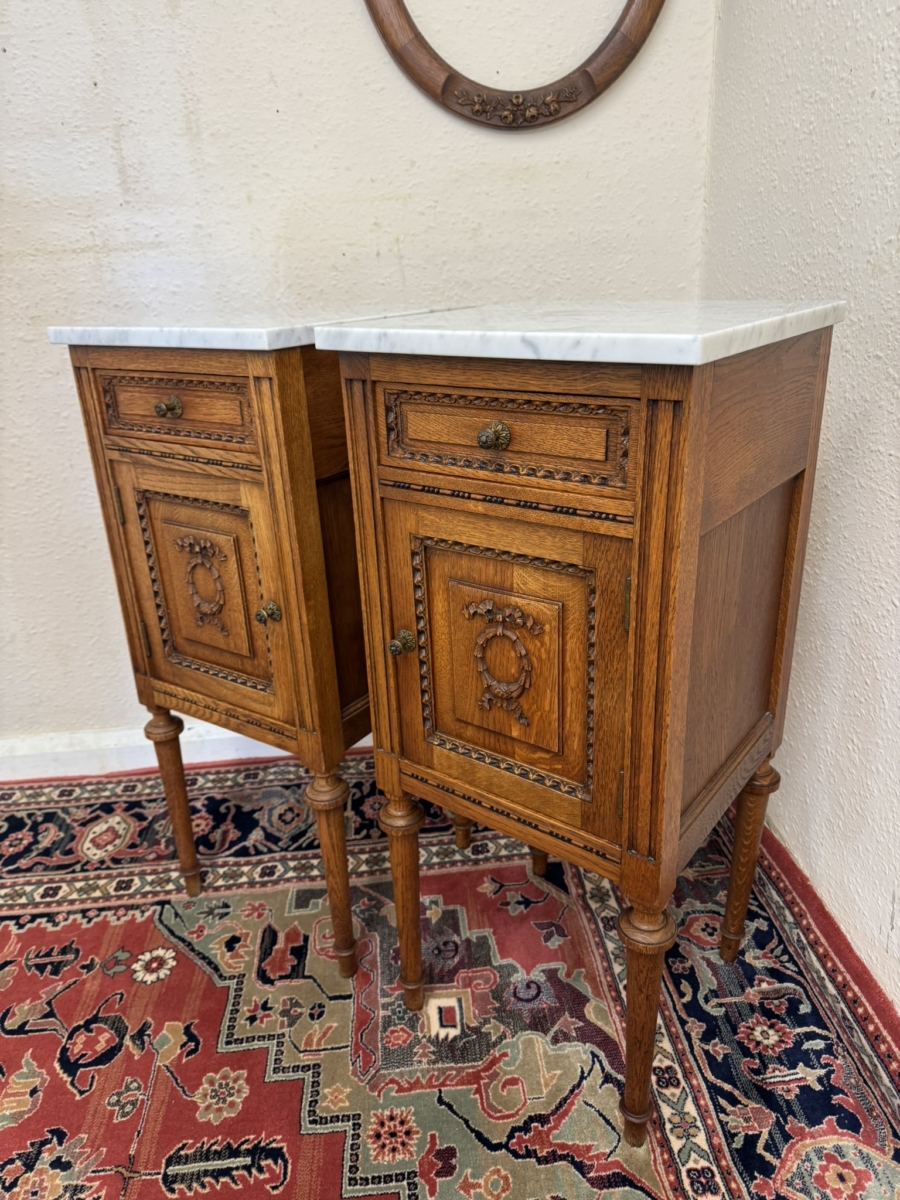 These fine bedside cabinets date circa 1900. The carrara white marble top sits above a carved drawer, the drawer has a ornate gilt brass handle, below is a carved recessed panelled cupboard door, the door also has a gilt brass ornate handle. The doors open to reveal storage. Recessed panelled sides and standing on four elegant turned legs.