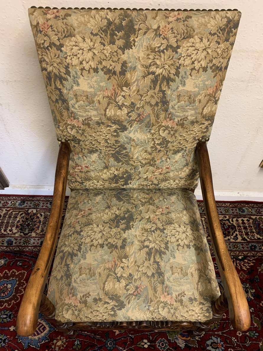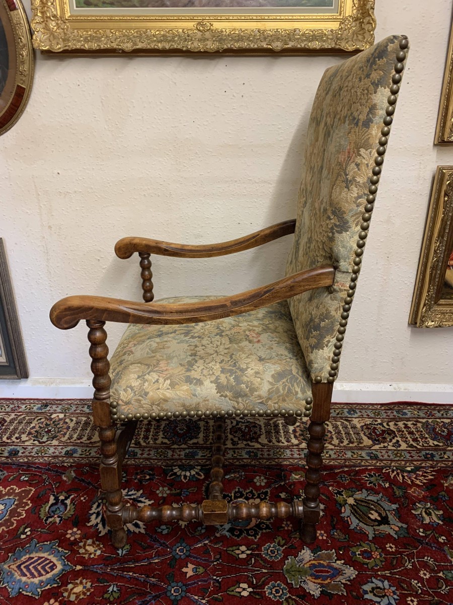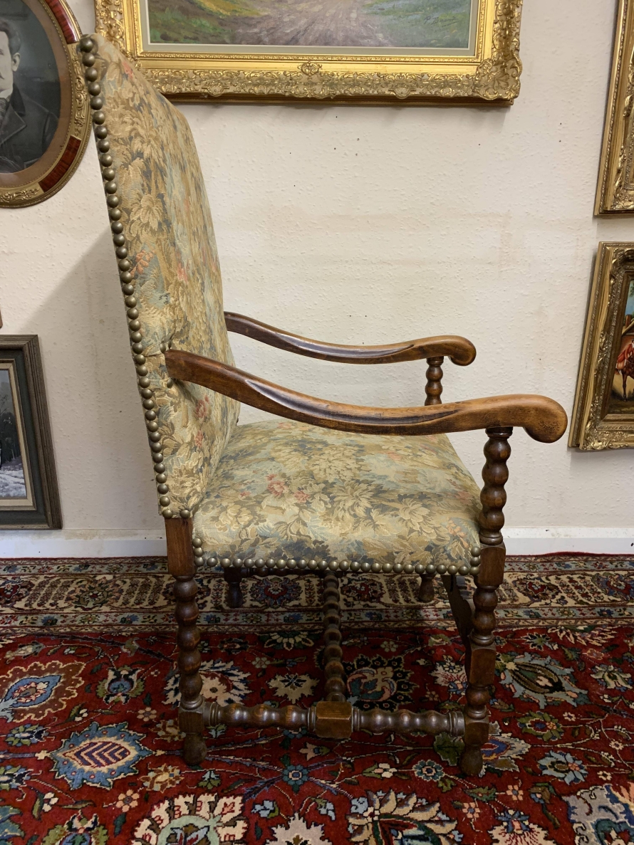 This large armchair has a cushioned upholstered back and seat with brass studded decoration. The shaped arms sit on bobbin supports. The chair sits on four bobbin legs connected by bobbin turned stretcher supports having carved decoration to the front.