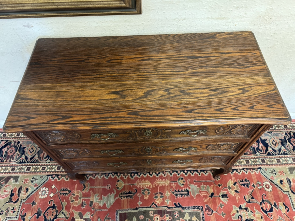 This great chest which dates circa 1920 is in excellent condition. The slightly shaped front sits above three ornately carved drawers, each of the drawers having a pair of gilt brass handles. Recessed panelled sides, shaped skirt with decorative central carving and standing on two carved cabriole shaped legs to the front.