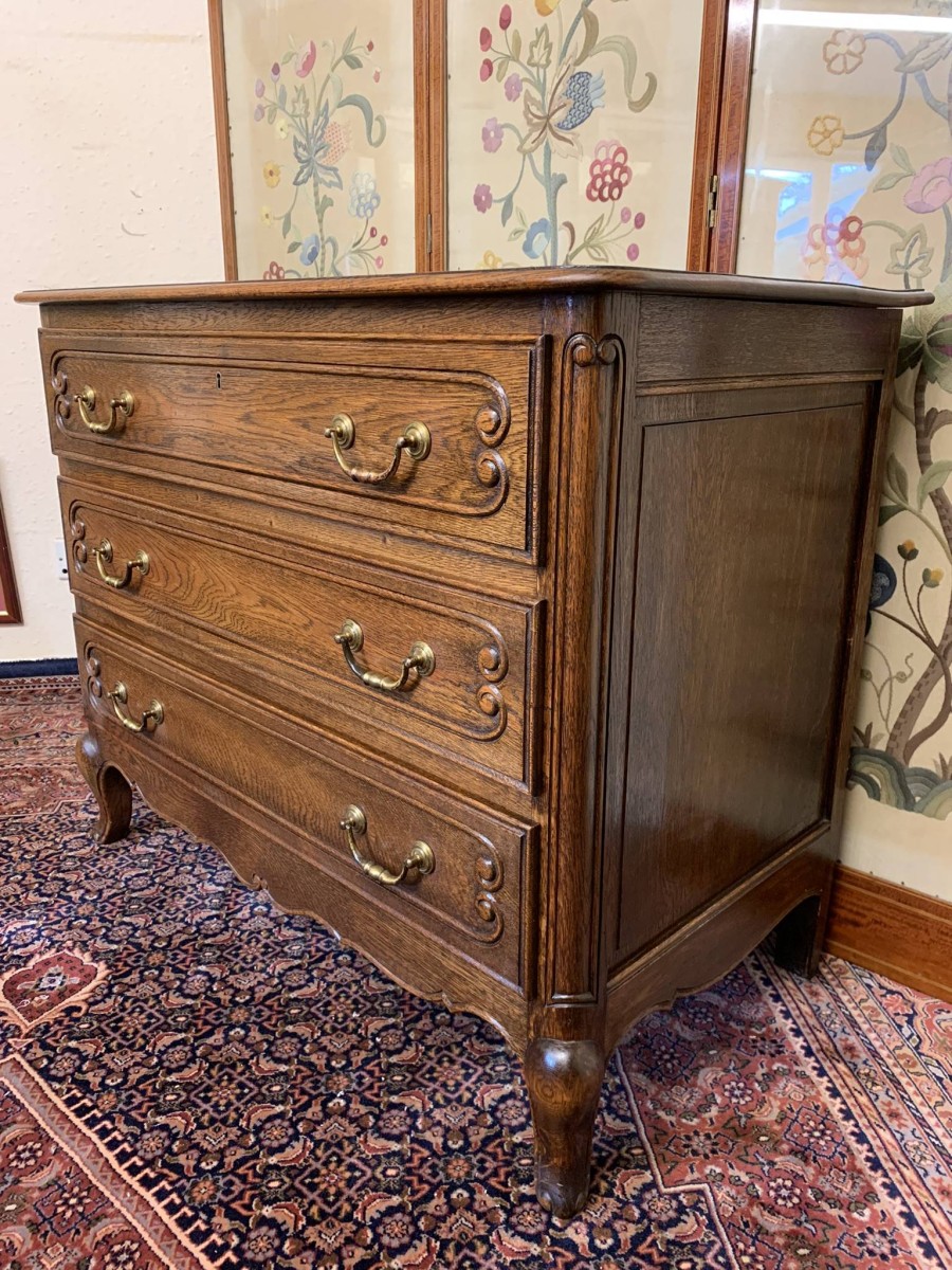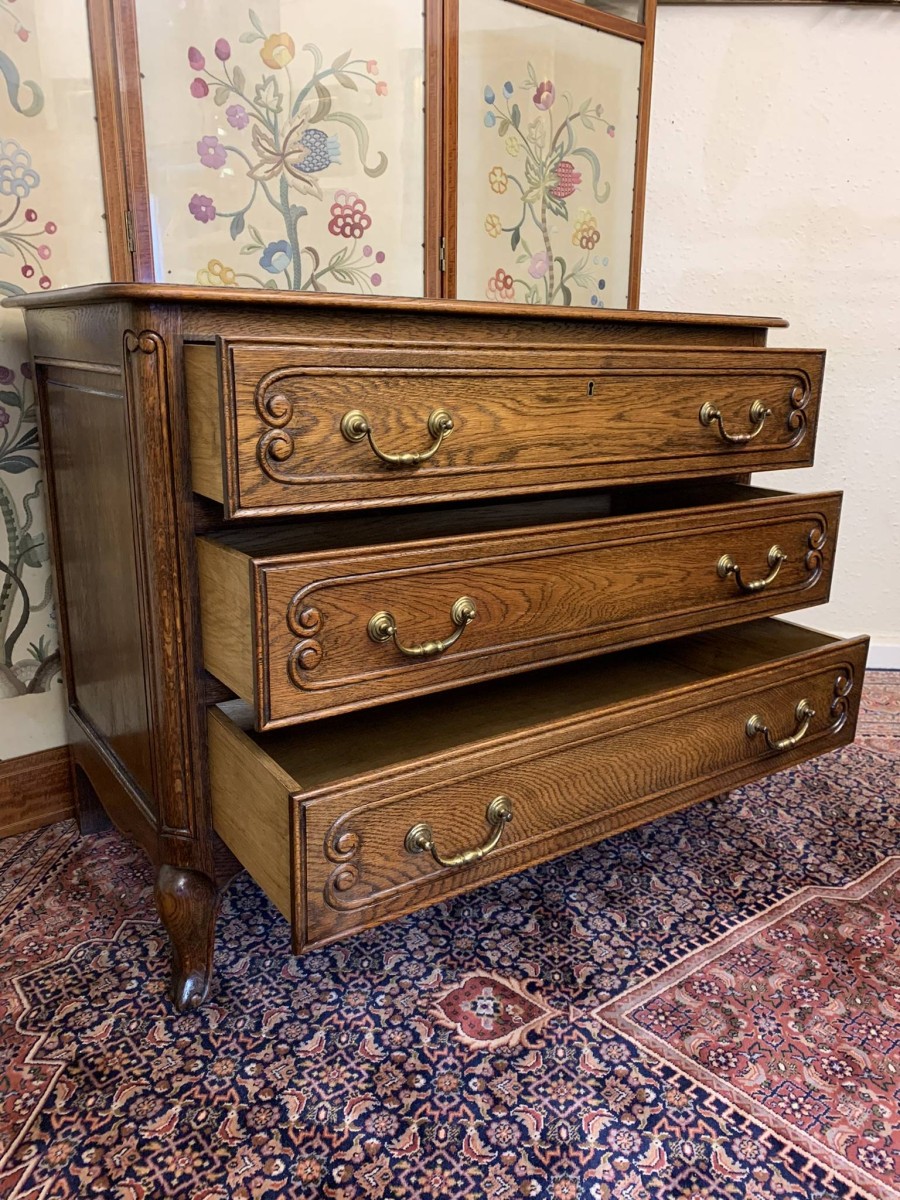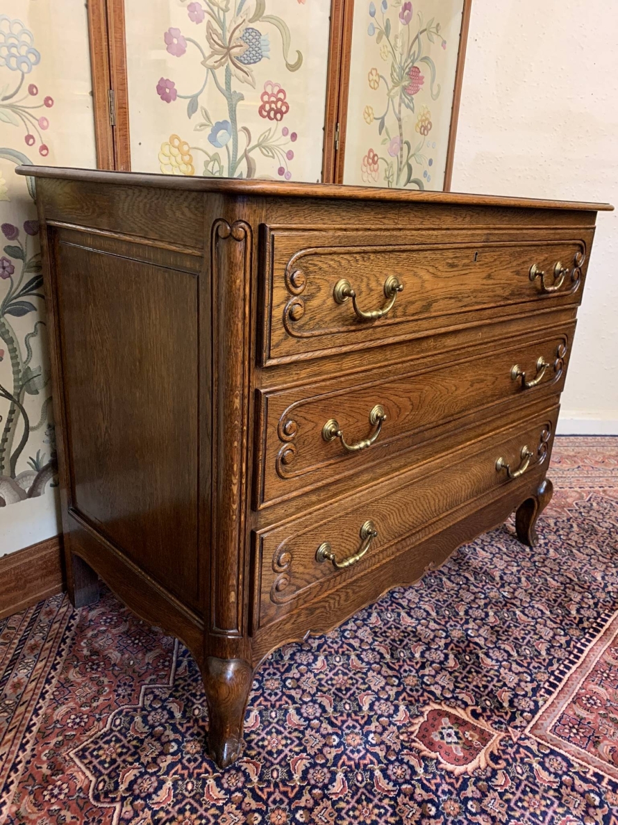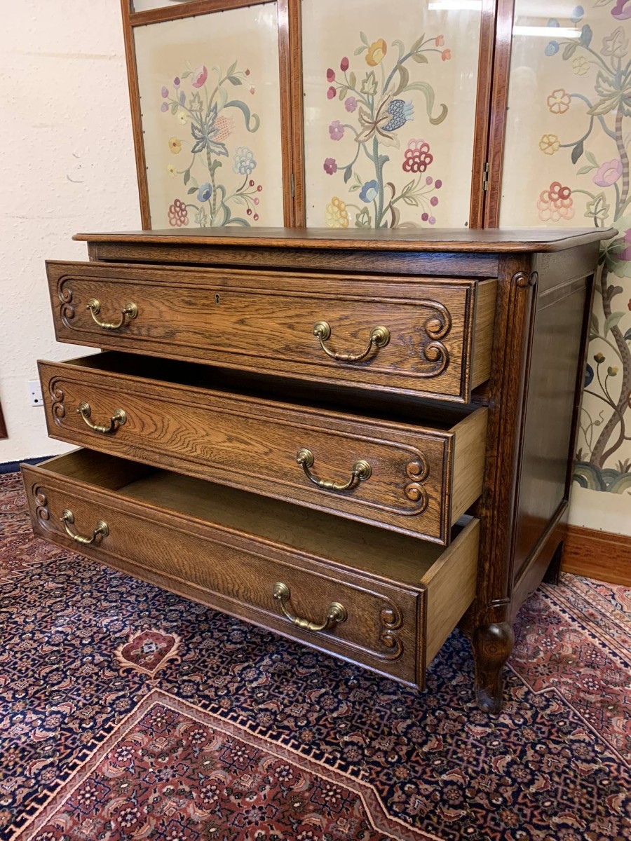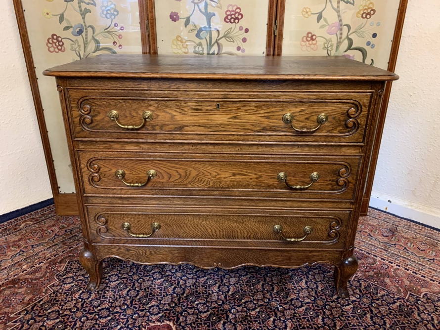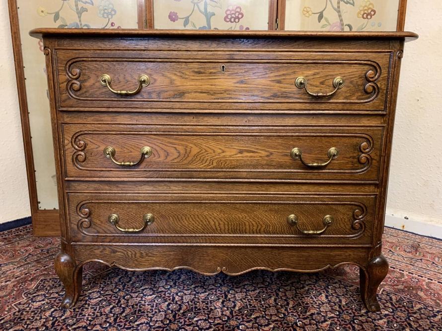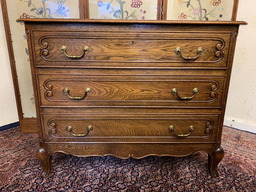 In excellent condition and made entirely in solid oak. The oversailing top has rounded corners to the front. Below are three carved drawers, each drawer has a pair of brass handles. Recessed panelled sides, shaped skirt this super French chest of drawers stands on carved cabriole shaped legs to the front.