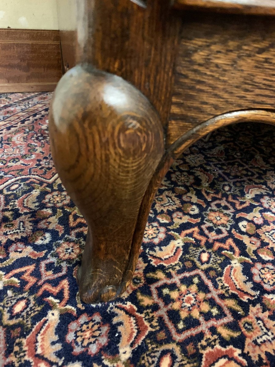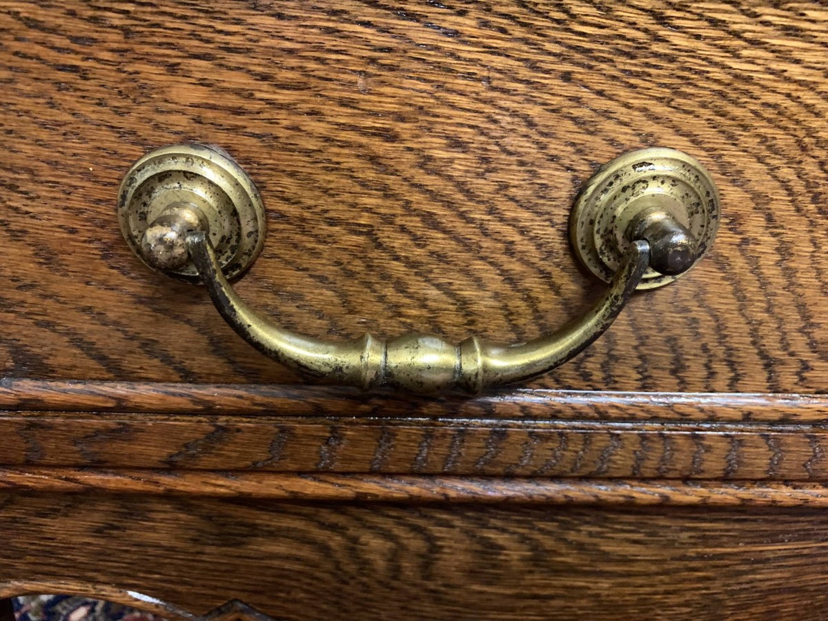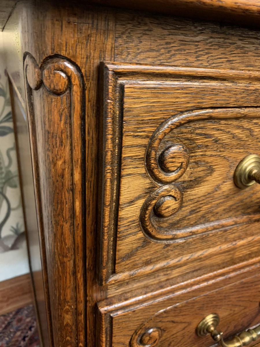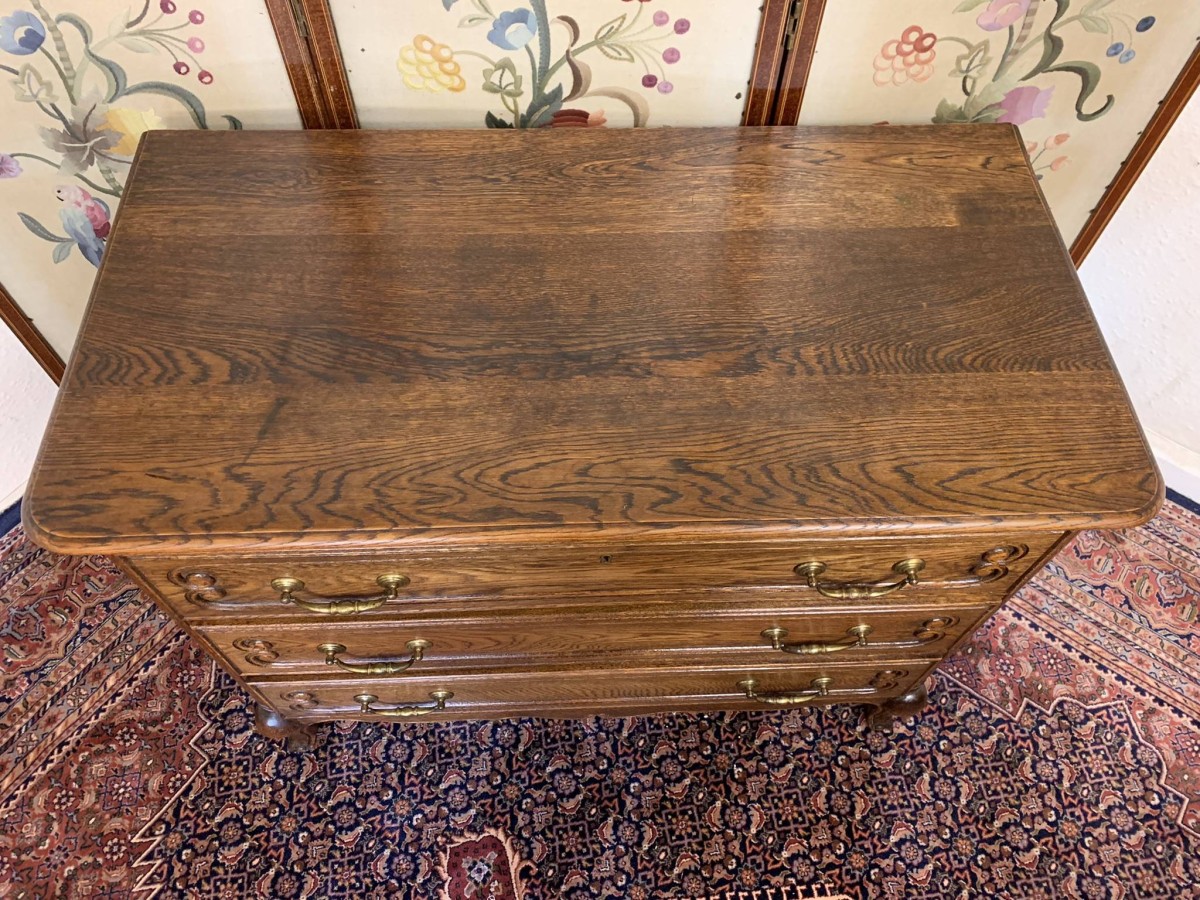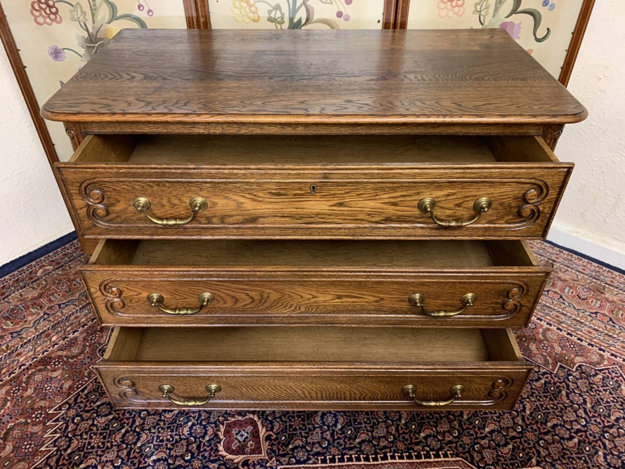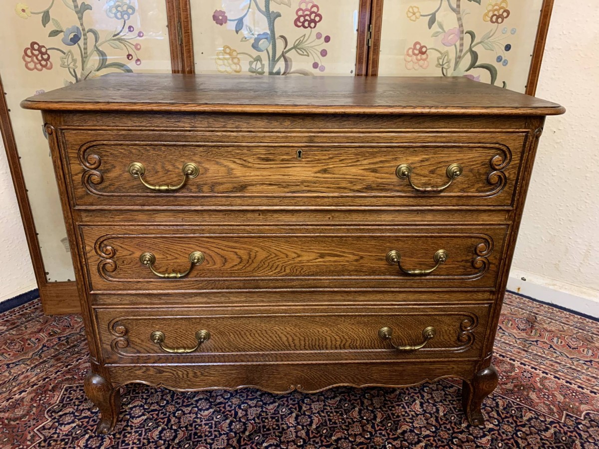 In excellent condition and made entirely in solid oak. The oversailing top has rounded corners to the front. Below are three carved drawers, each drawer has a pair of brass handles. Recessed panelled sides, shaped skirt this super French chest of drawers stands on carved cabriole shaped legs to the front.