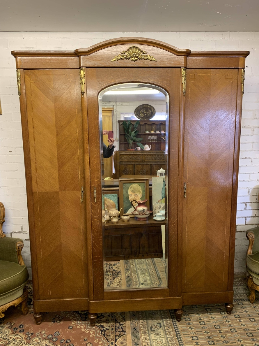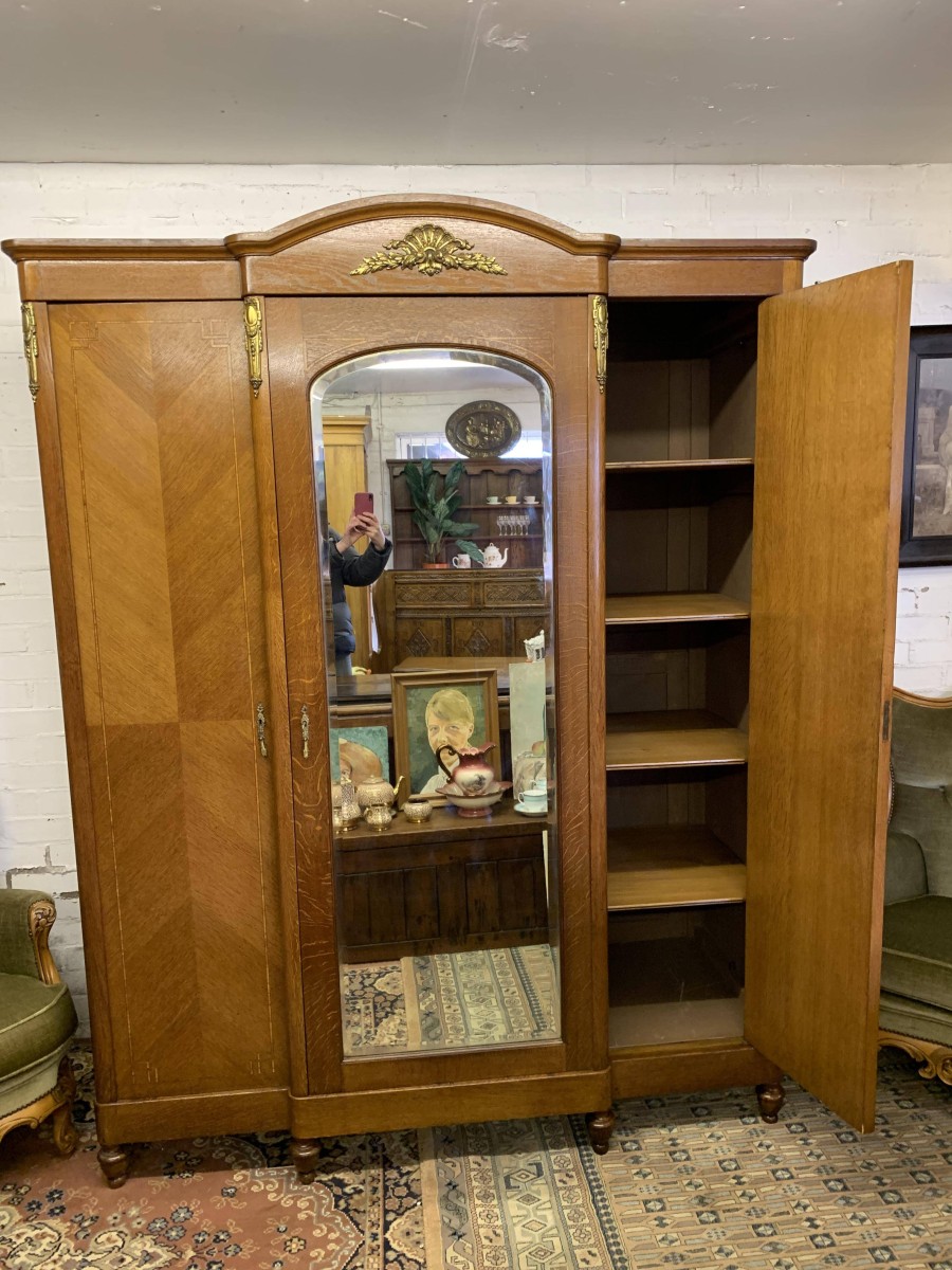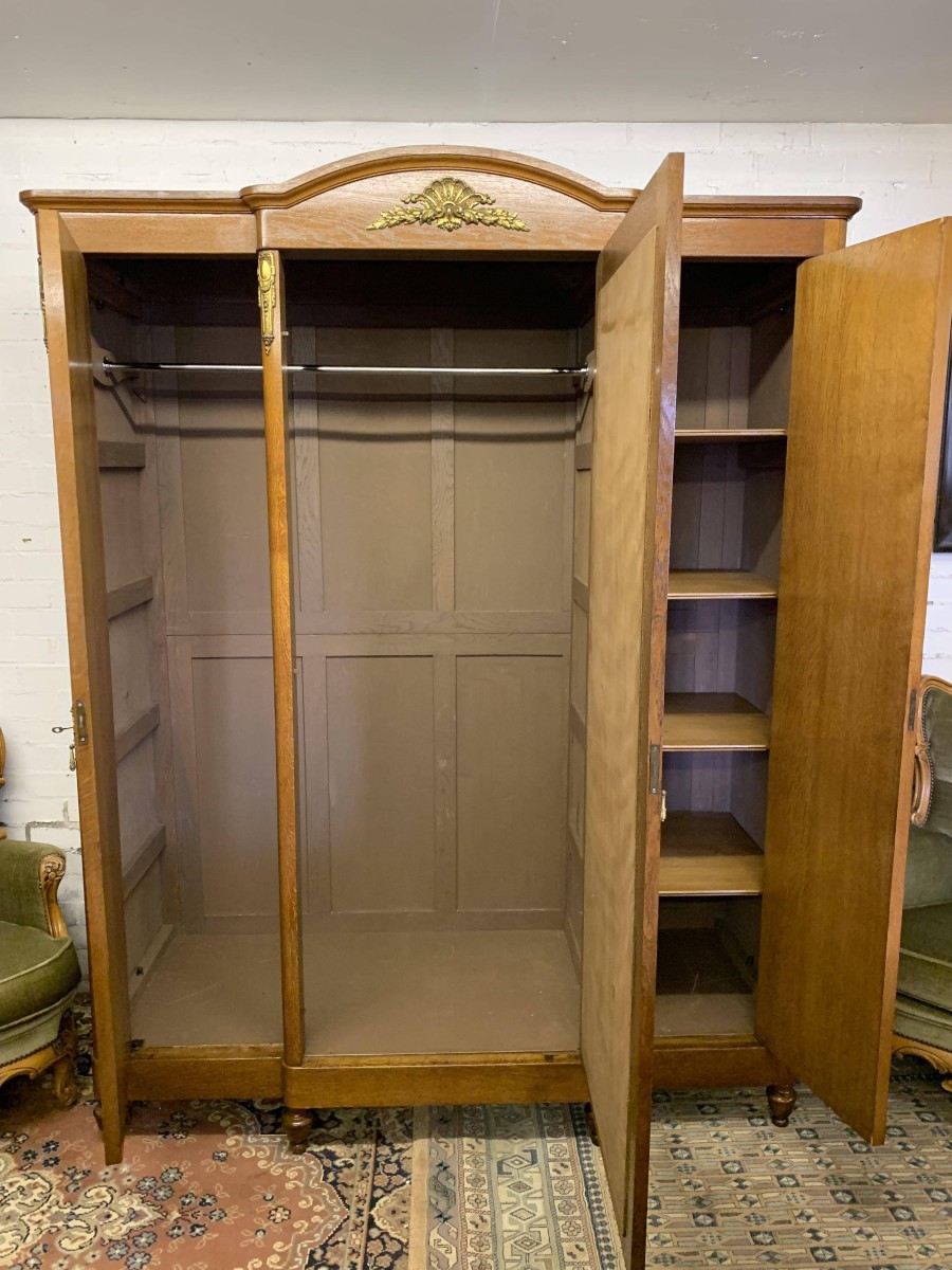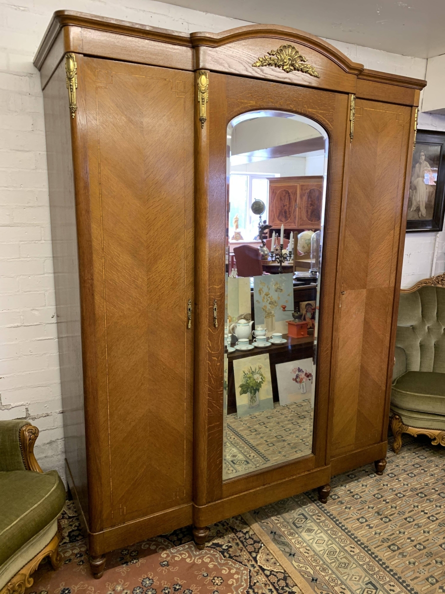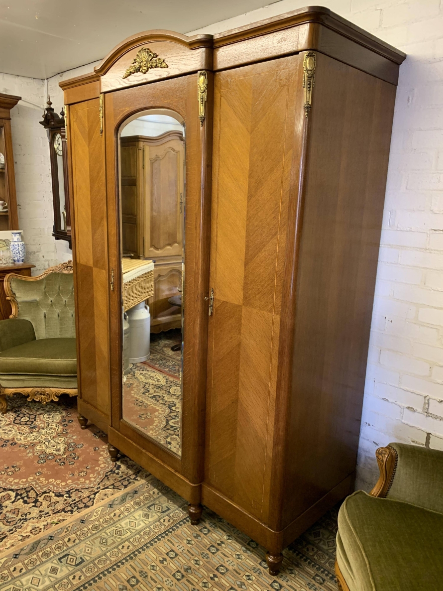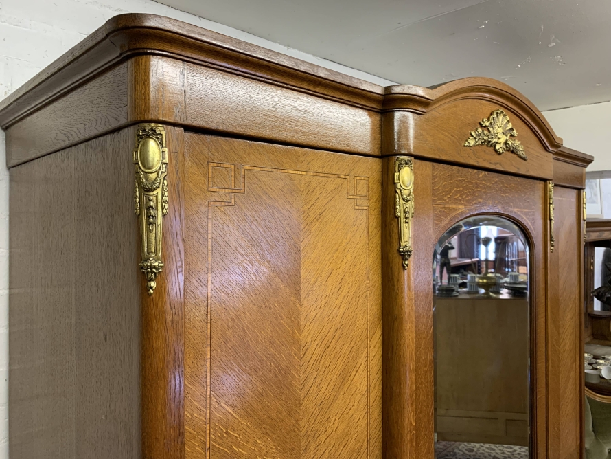 The shaped oversailing top has central gilt decoration. Below is a central brakefront lockable mirrored door, the door having inlaid decoration, gilt mounts to the sides, brass escutcheon, drop handle. The central mirror door is flanked by a pair of inlaid doors. The left-hand door and central mirror door open to reveal a hanging rail. The right-hand door opens to reveal four removable shelves. Having a plinth base this fabulous armoire stands on four turned feet to the front.