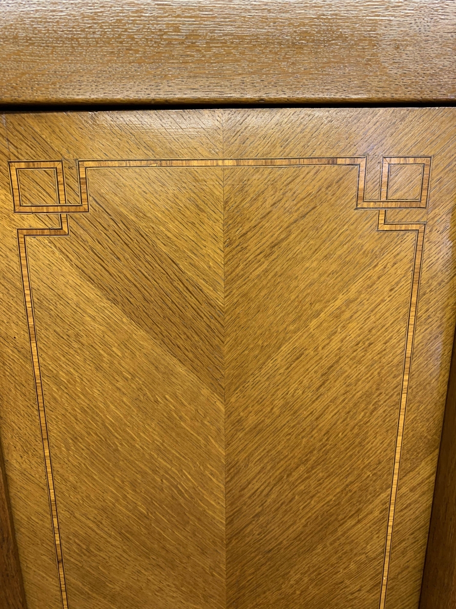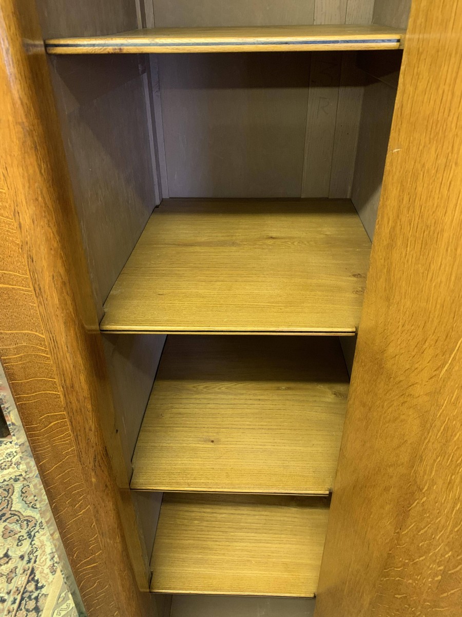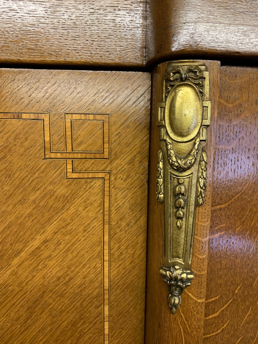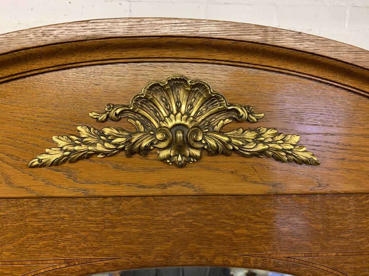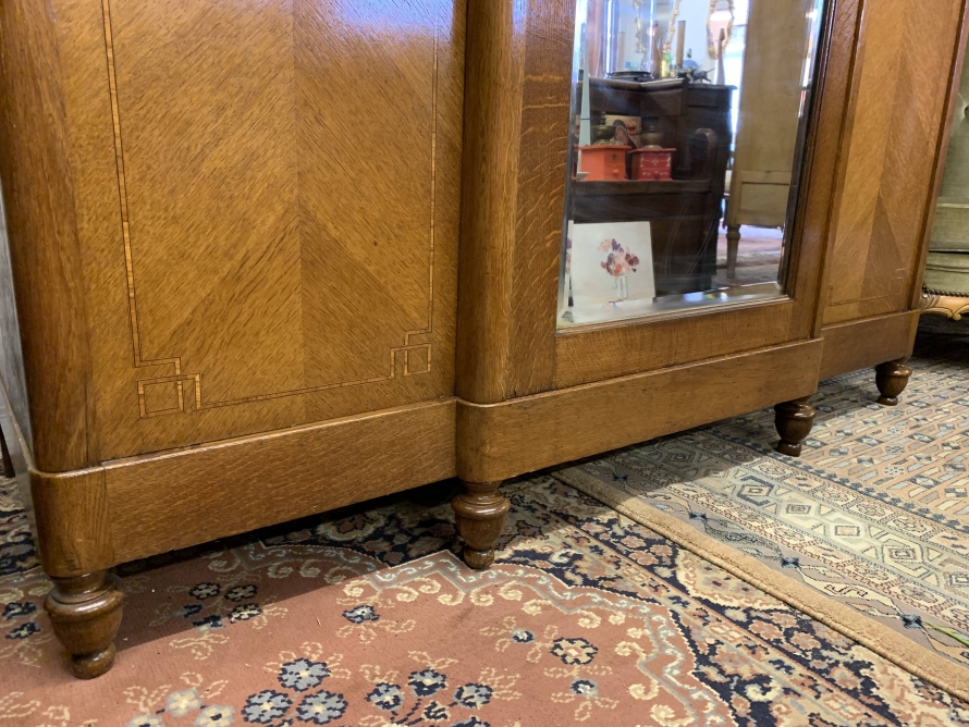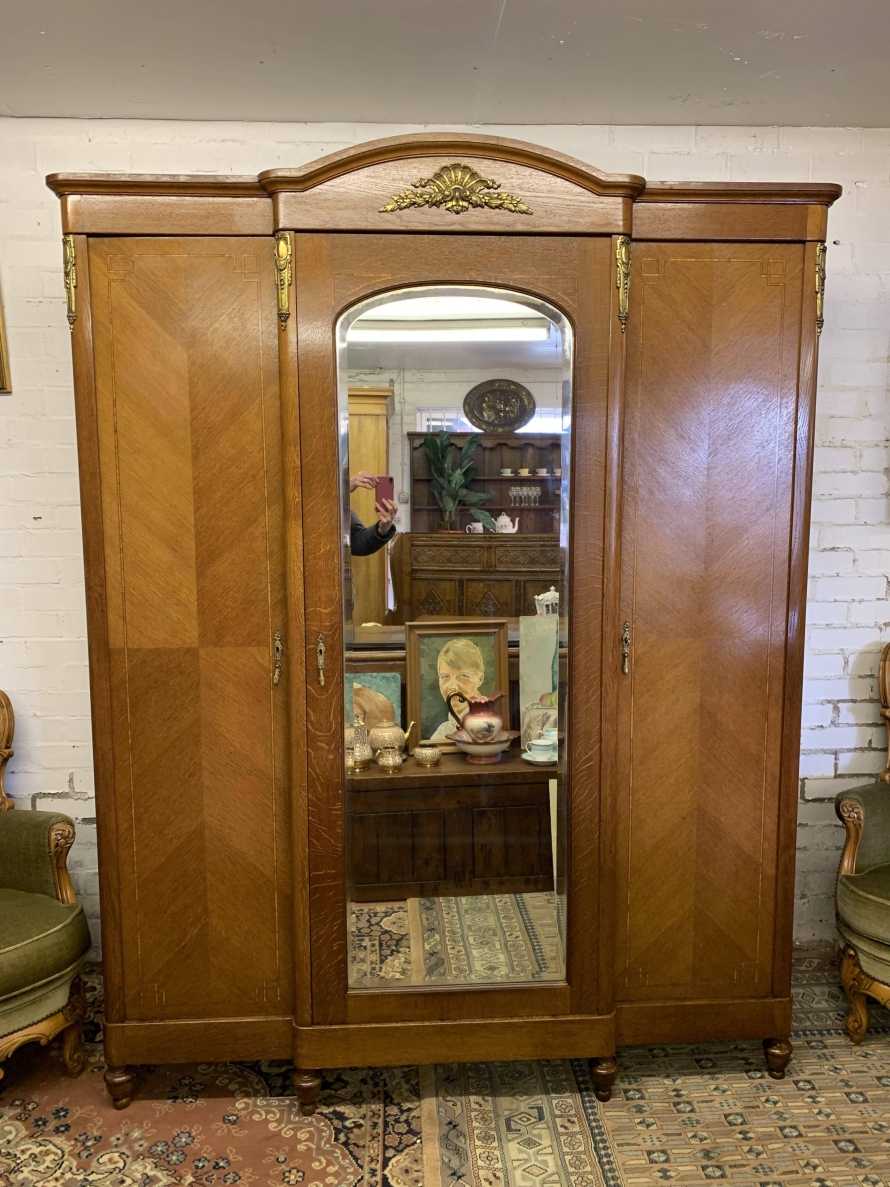 The shaped oversailing top has central gilt decoration. Below is a central brakefront lockable mirrored door, the door having inlaid decoration, gilt mounts to the sides, brass escutcheon, drop handle. The central mirror door is flanked by a pair of inlaid doors. The left-hand door and central mirror door open to reveal a hanging rail. The right-hand door opens to reveal four removable shelves. Having a plinth base this fabulous armoire stands on four turned feet to the front.