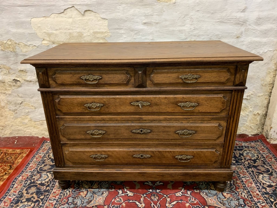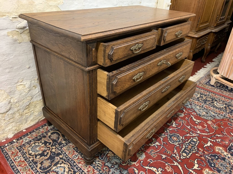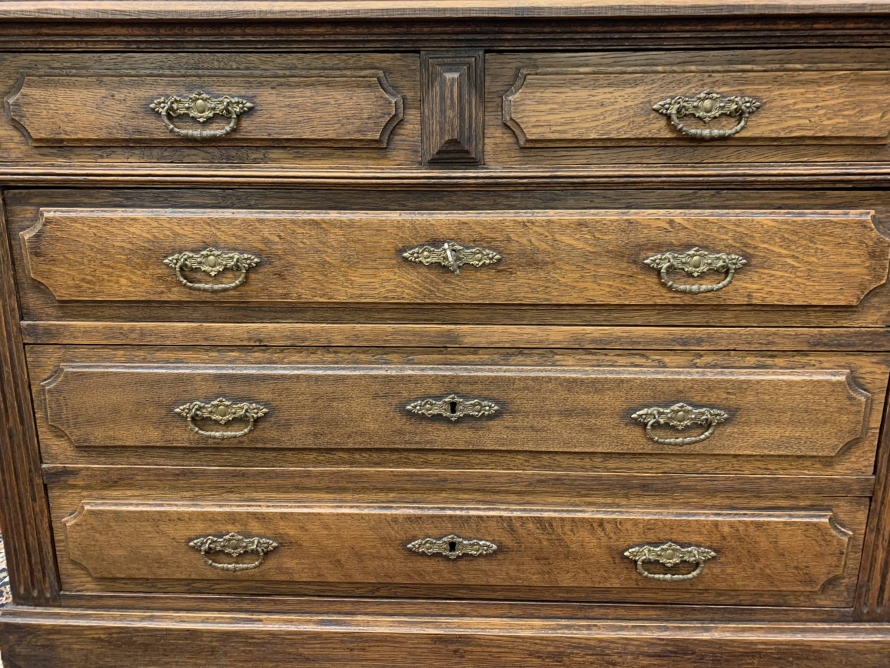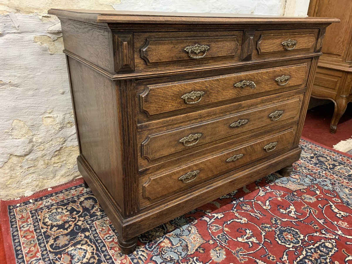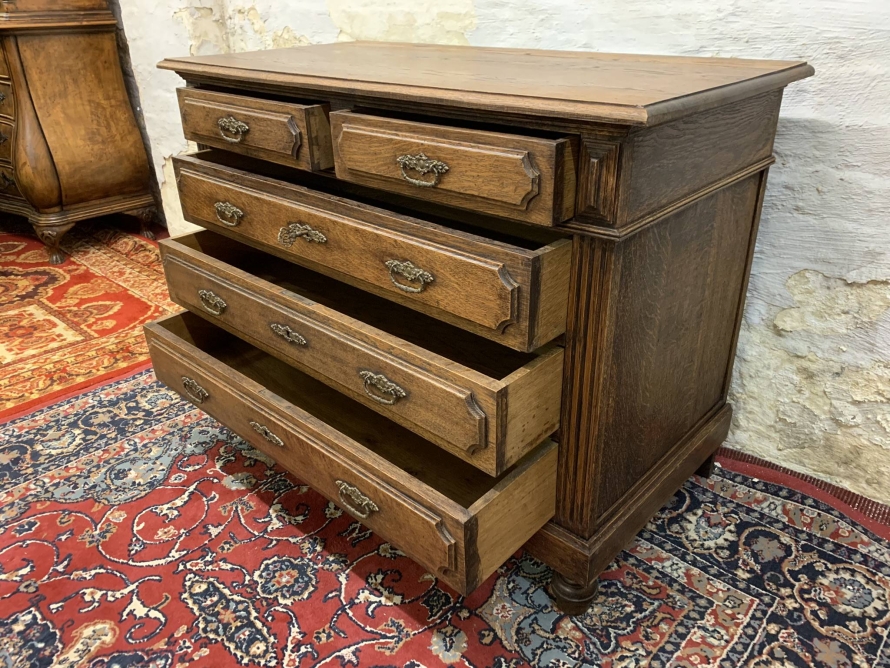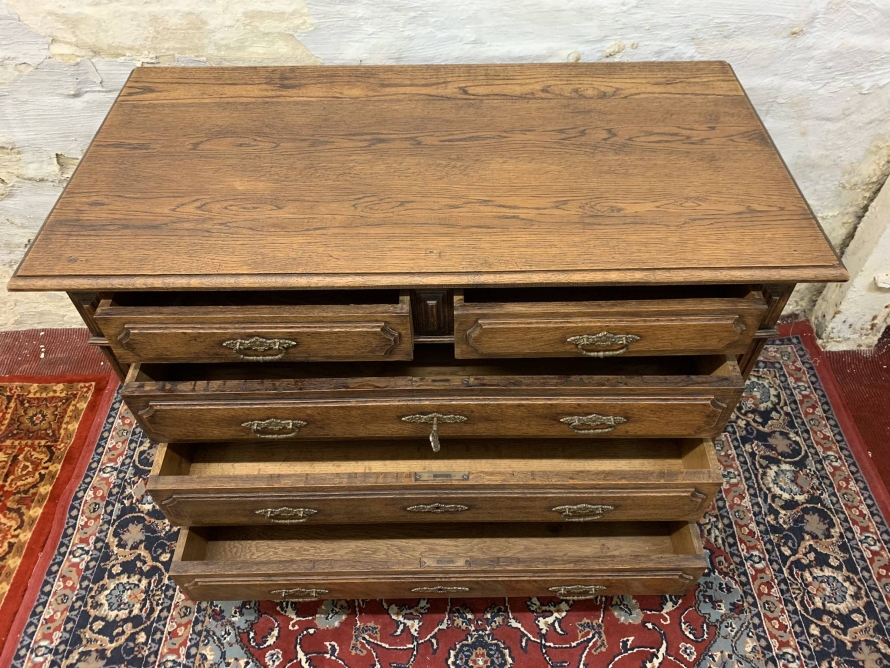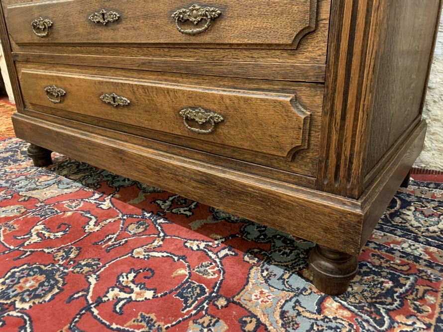 Made entirely in solid oak this French chest is in superb condition. The oversailing top sits above two short drawers, each drawer having a decorative brass handle. Below are three long lockable drawers, each drawer having a pair of brass handles. Recessed panelled sides this fabulous antique French chest stands on two turned feet to the front.