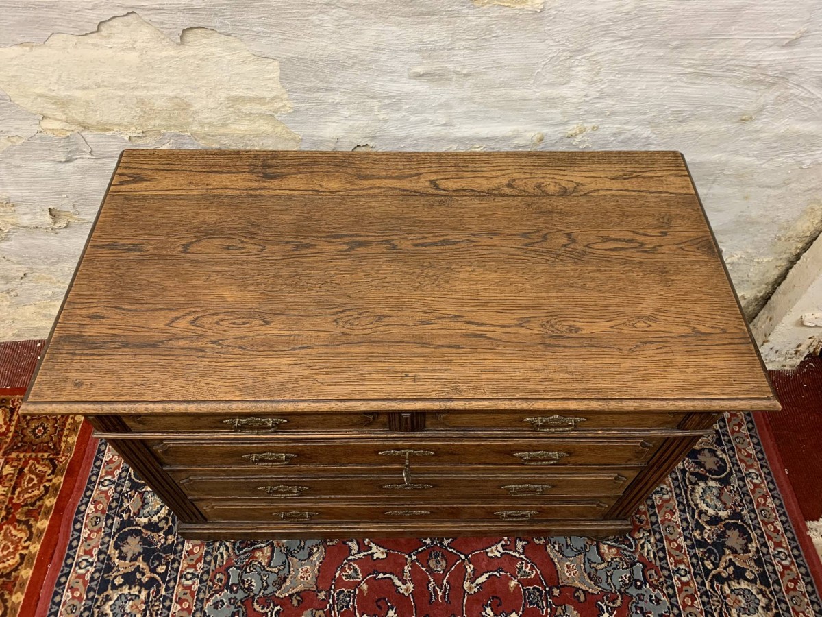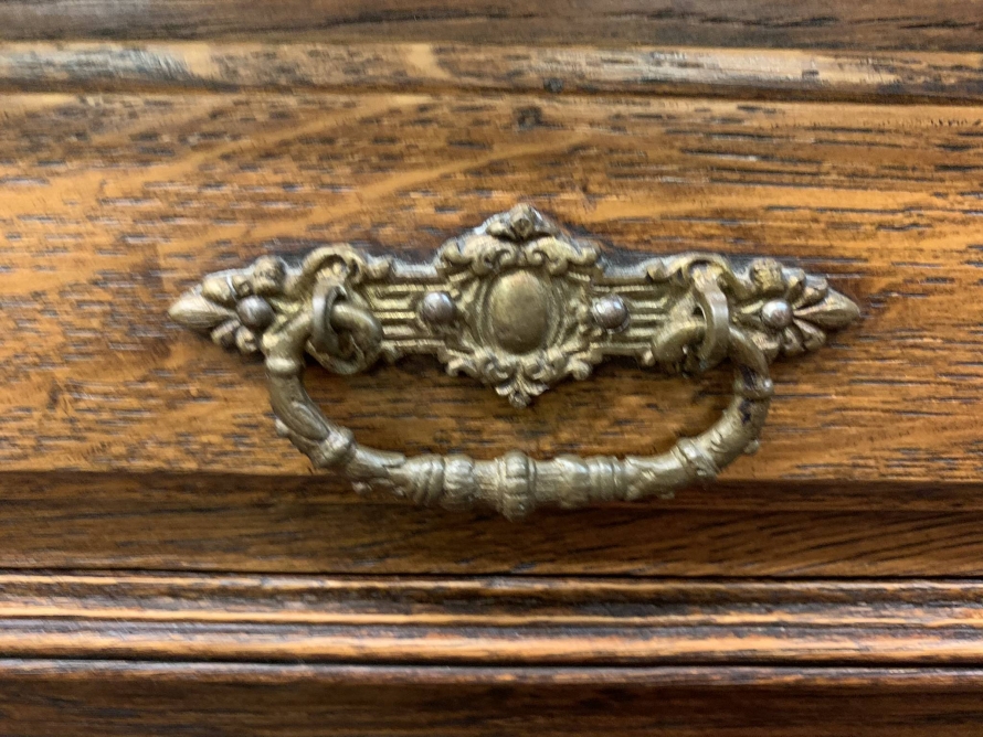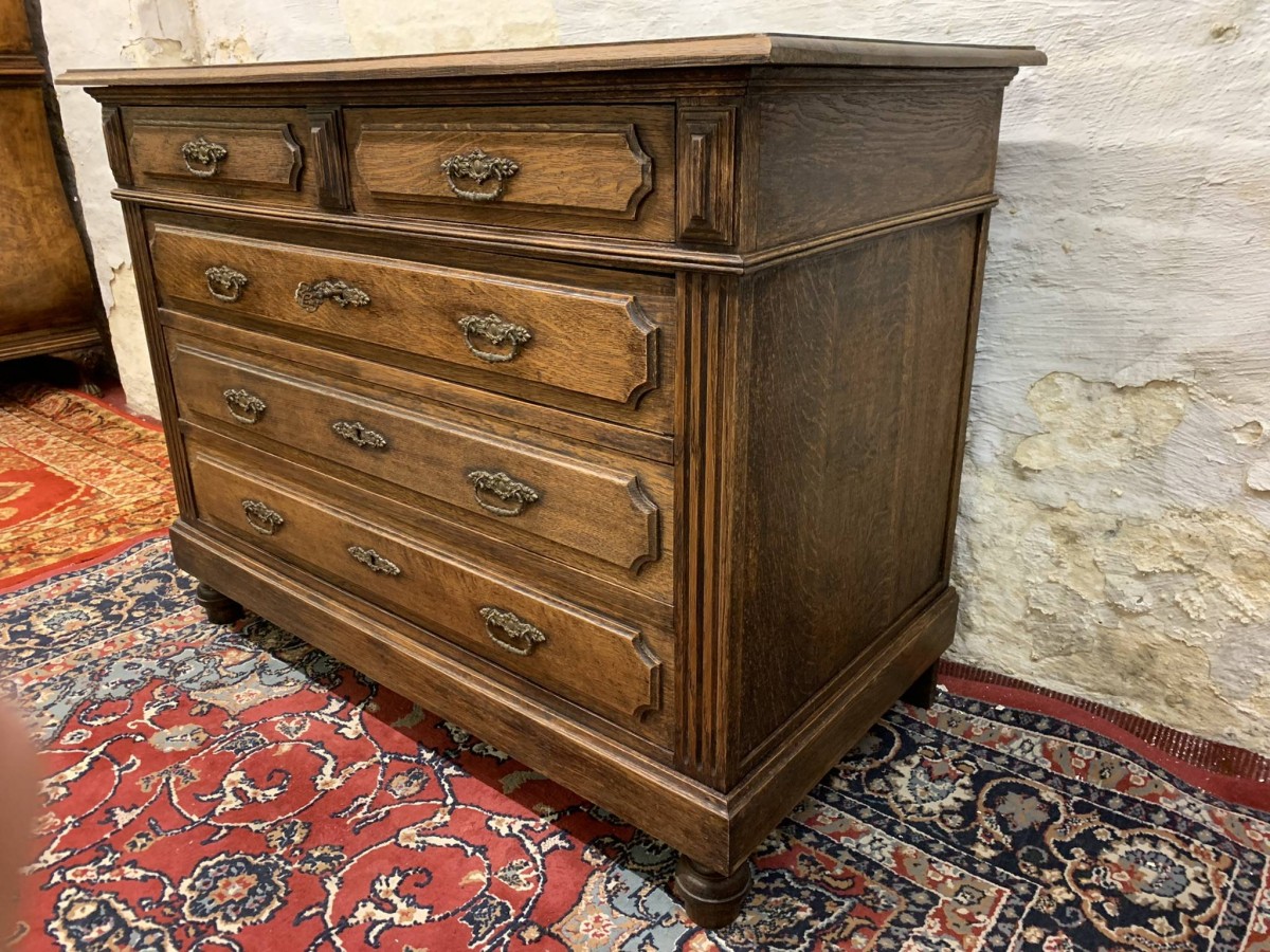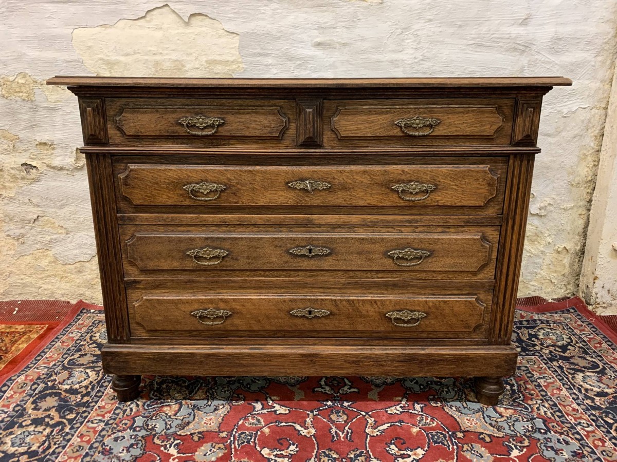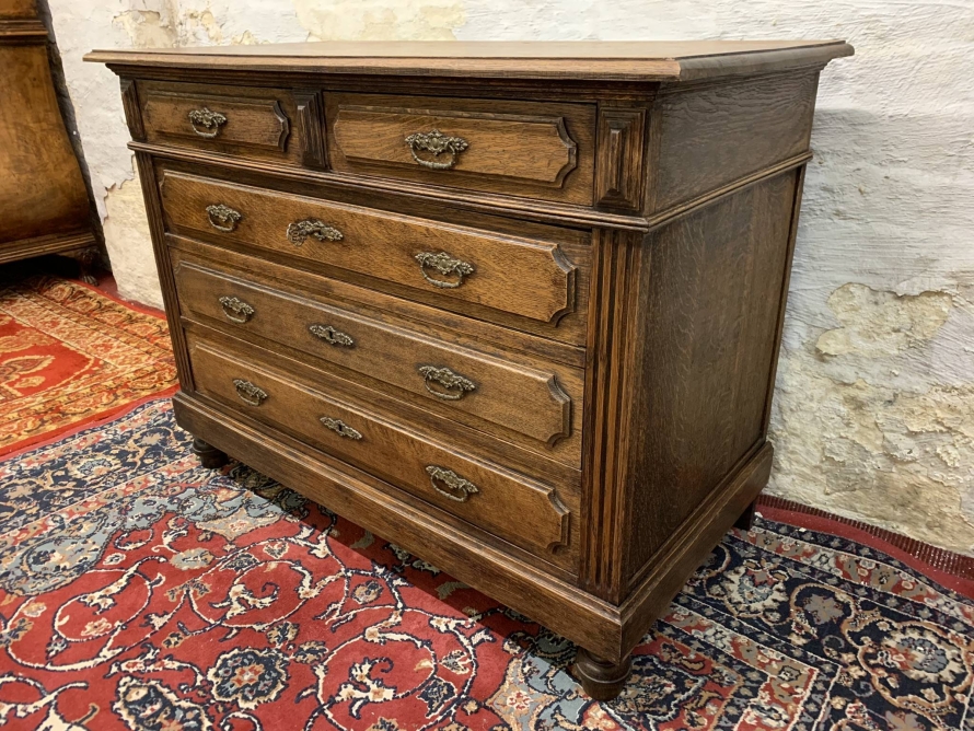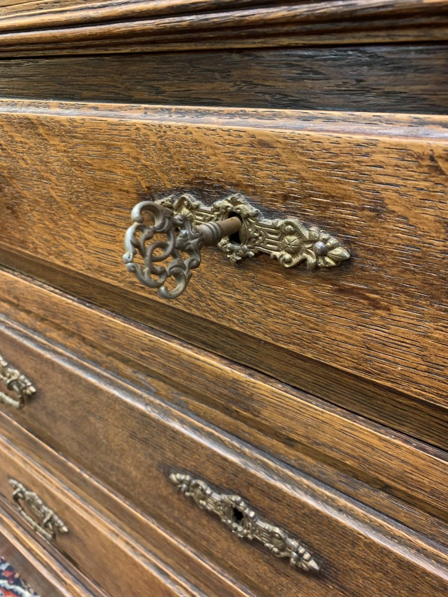 Made entirely in solid oak this French chest is in superb condition. The oversailing top sits above two short drawers, each drawer having a decorative brass handle. Below are three long lockable drawers, each drawer having a pair of brass handles. Recessed panelled sides this fabulous antique French chest stands on two turned feet to the front.