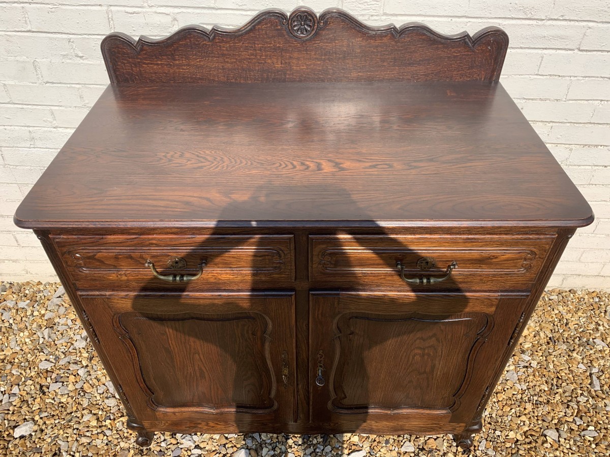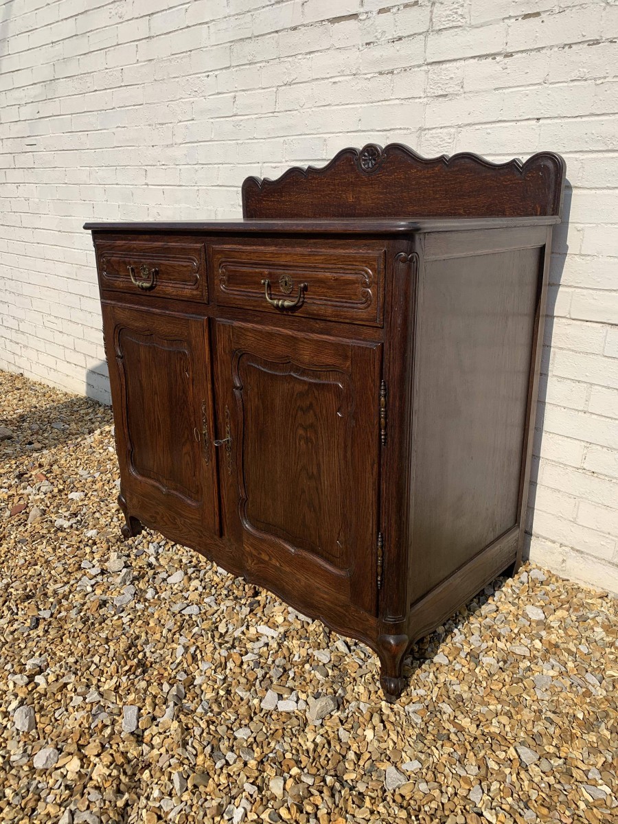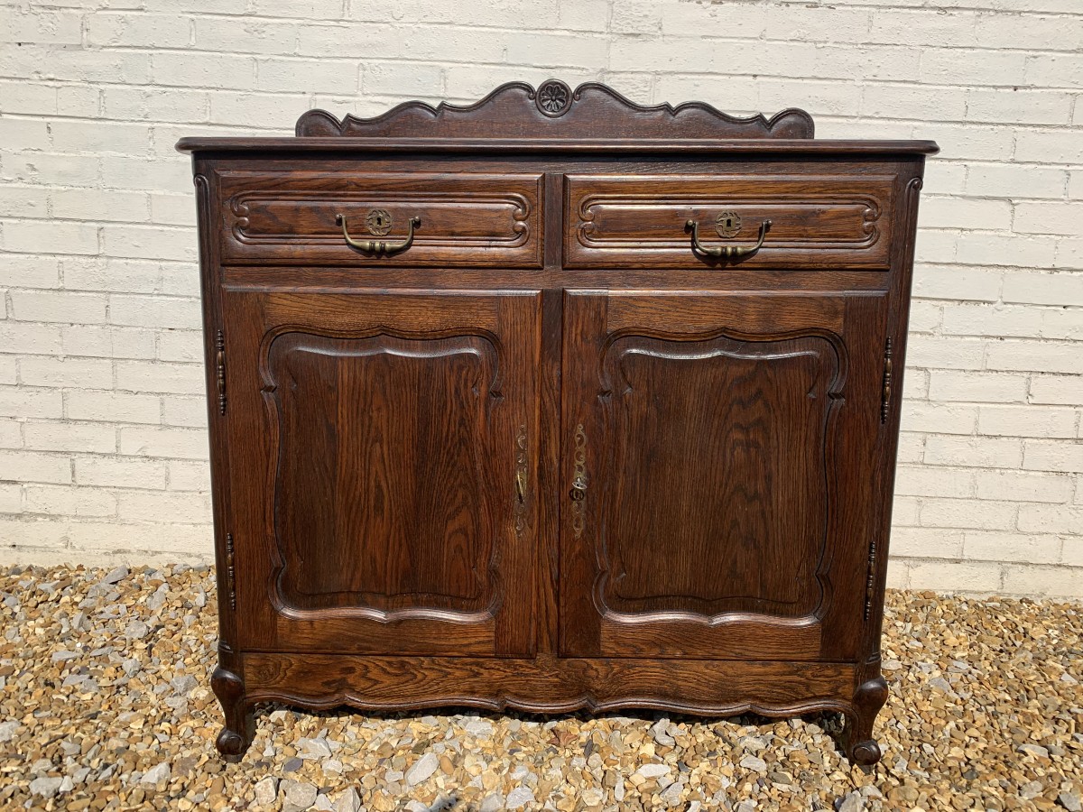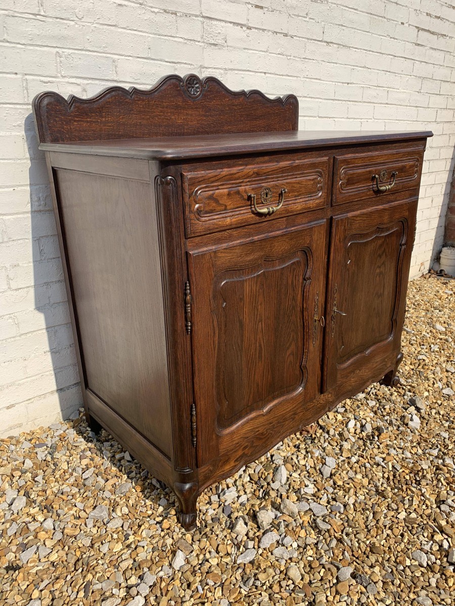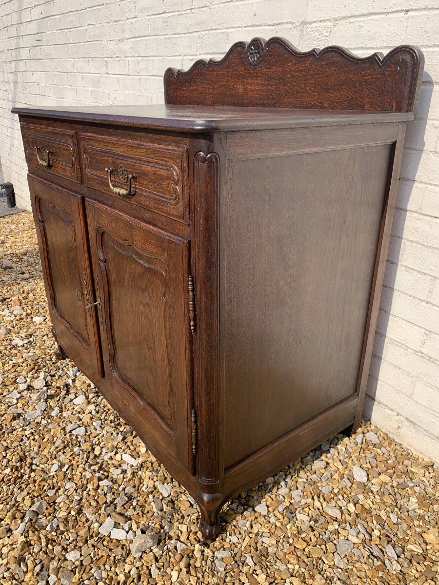 This fantastic item of Antique French furniture is in excellent condition. The shaped back rail rises to a central carving. Two drawers each with brass handle sit above two lockable shaped recessed panelled cupboard doors, each door having brass hinges decorative brass escutcheon and keys. The doors open to reveal a removable shelf and offer ample storage. Recessed panelled sides, shaped skirt, this beautiful French dresser stands on two shaped carved cabriole legs to the front.