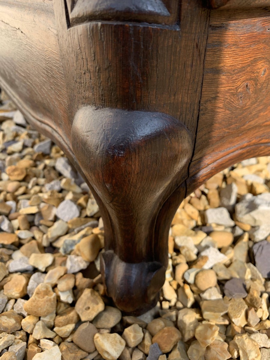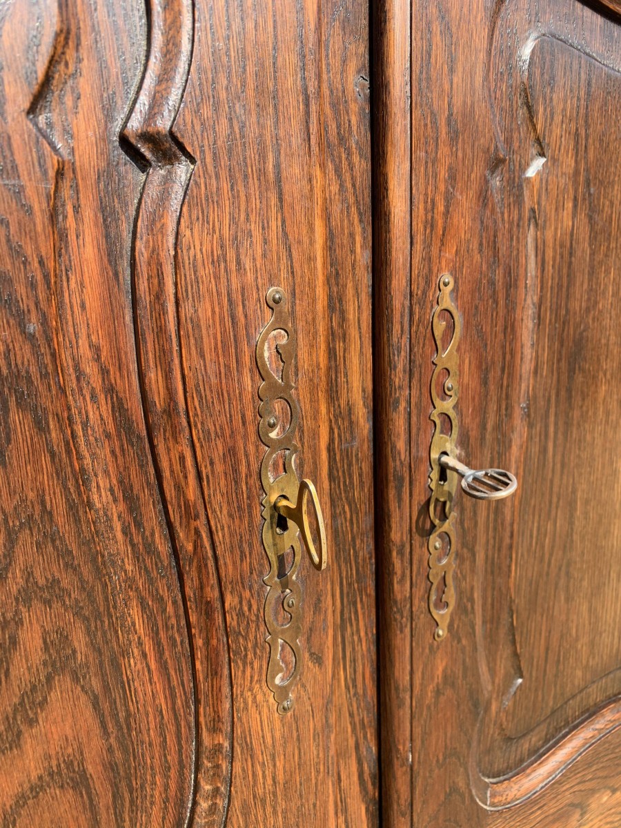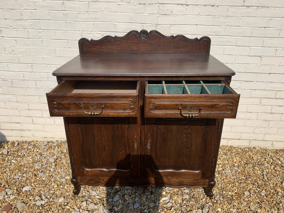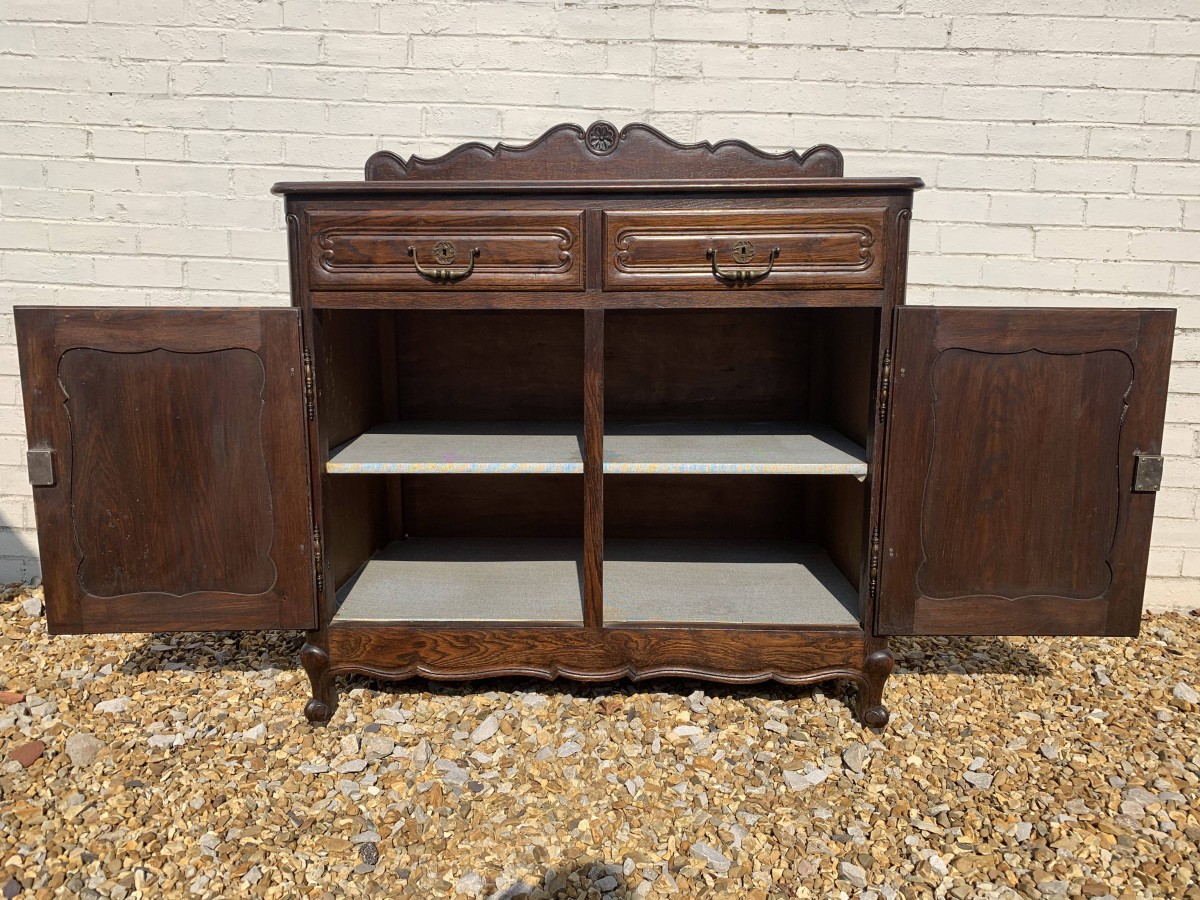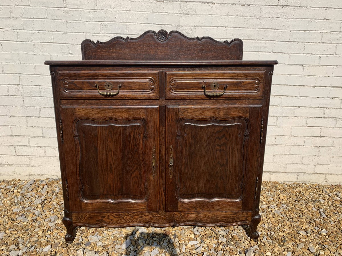This fantastic item of Antique French furniture is in excellent condition. The shaped back rail rises to a central carving. Two drawers each with brass handle sit above two lockable shaped recessed panelled cupboard doors, each door having brass hinges decorative brass escutcheon and keys. The doors open to reveal a removable shelf and offer ample storage. Recessed panelled sides, shaped skirt, this beautiful French dresser stands on two shaped carved cabriole legs to the front.