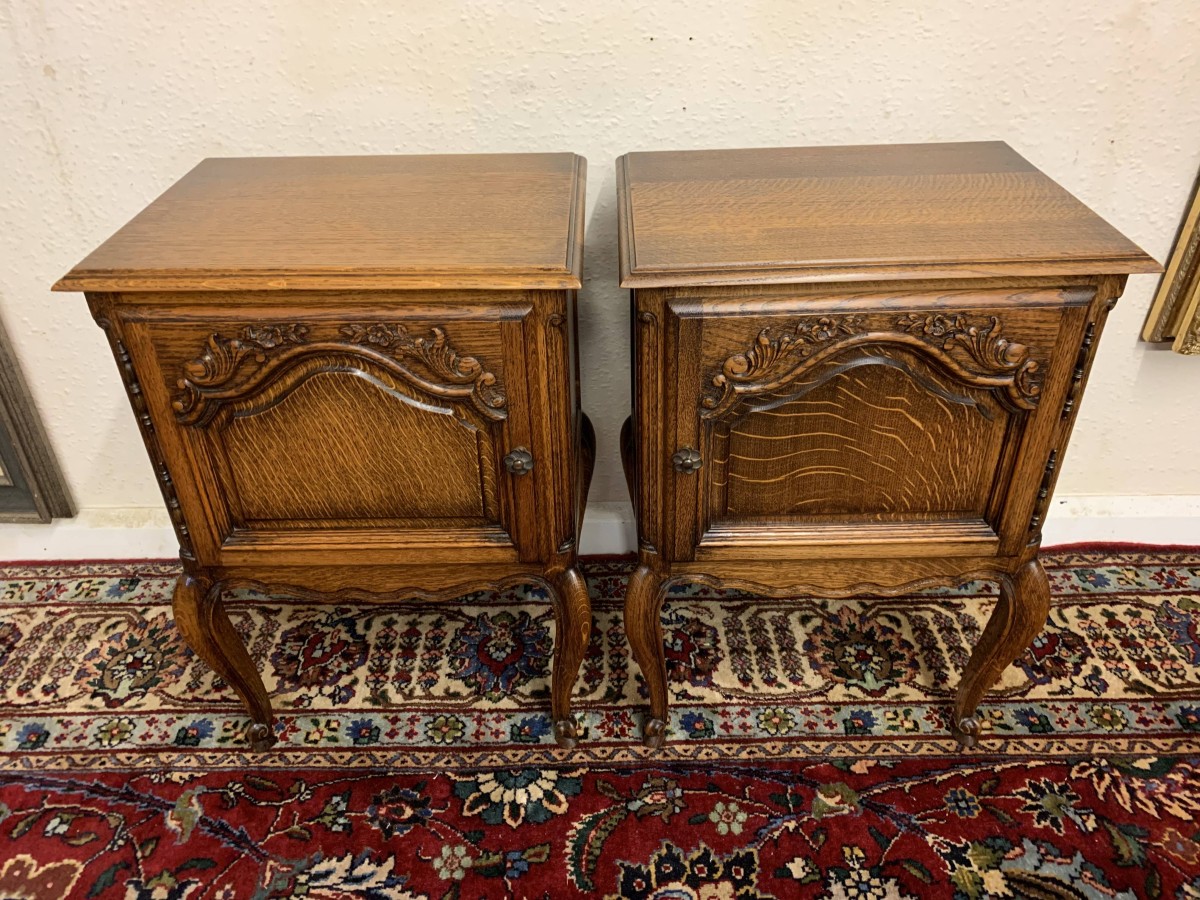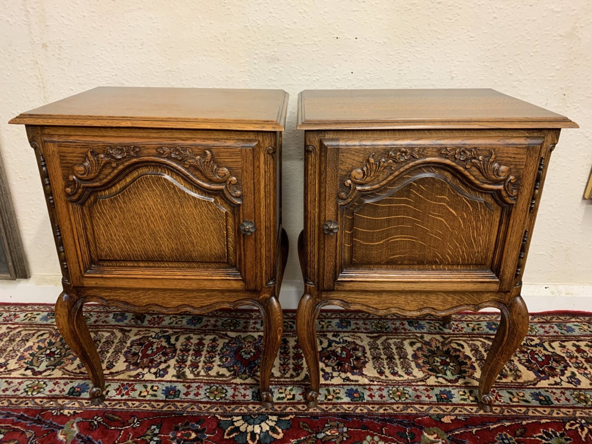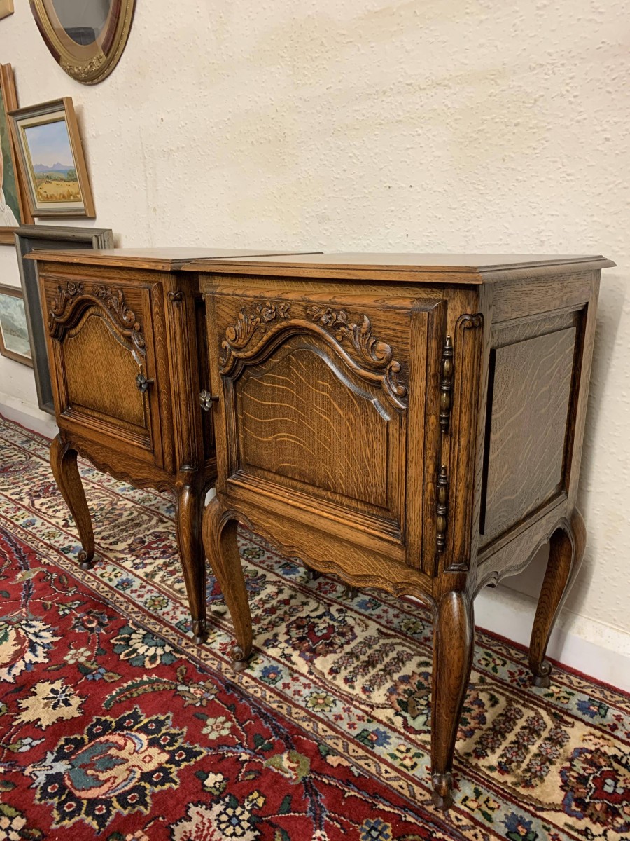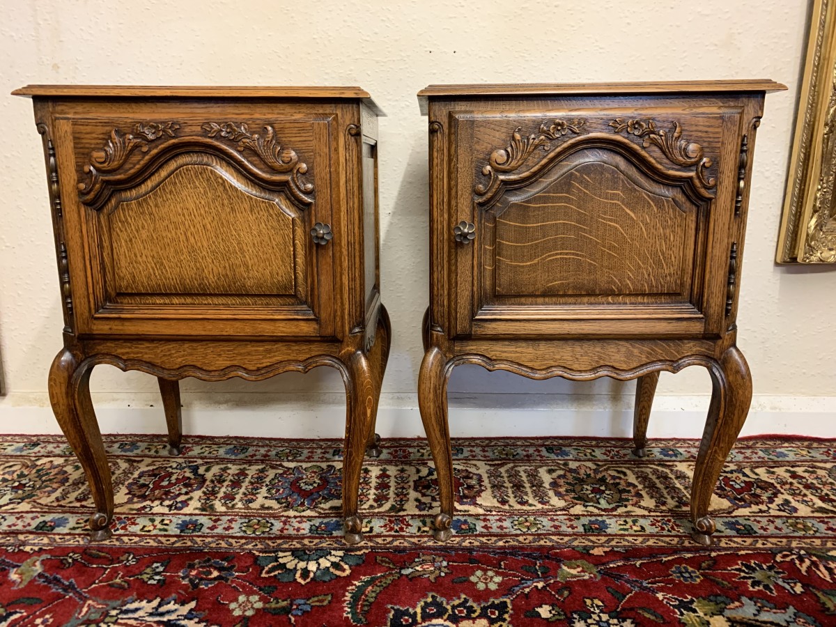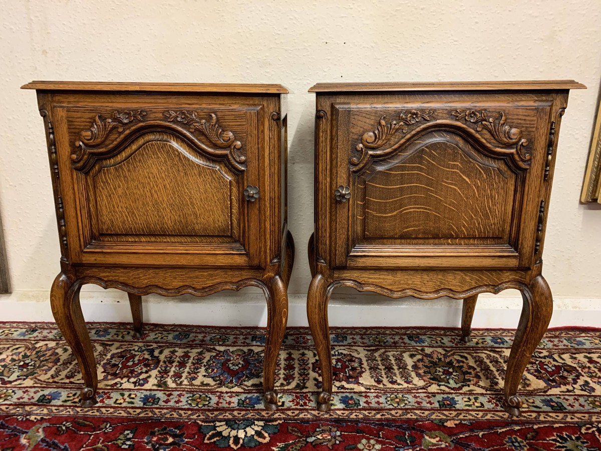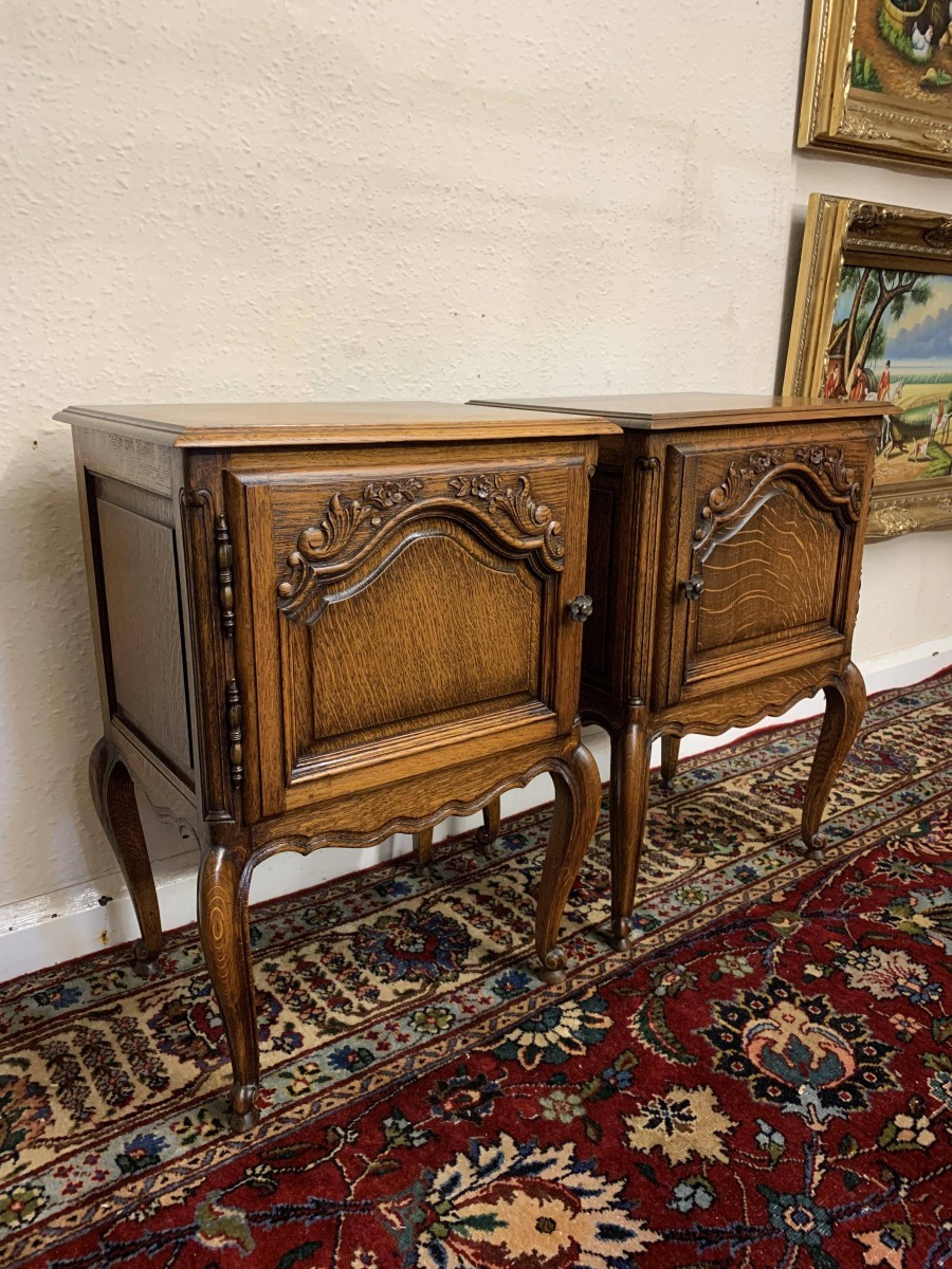 The oversailing top of each cabinet sits above a carved recessed panelled cupboard door with decorative carvings to the top. The doors having brass hinges and ornate brass handle. Recessed panelled sides, shaped skirt this fabulous pair of antique French bedside cabinets which are in excellent condition stand on four carved cabriole shaped legs.