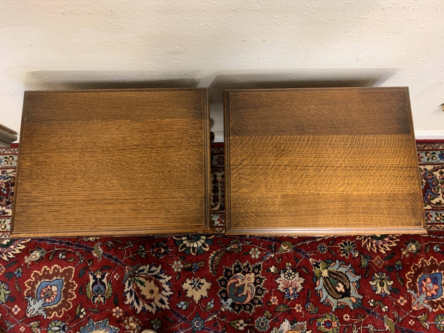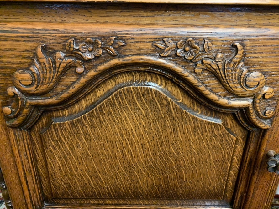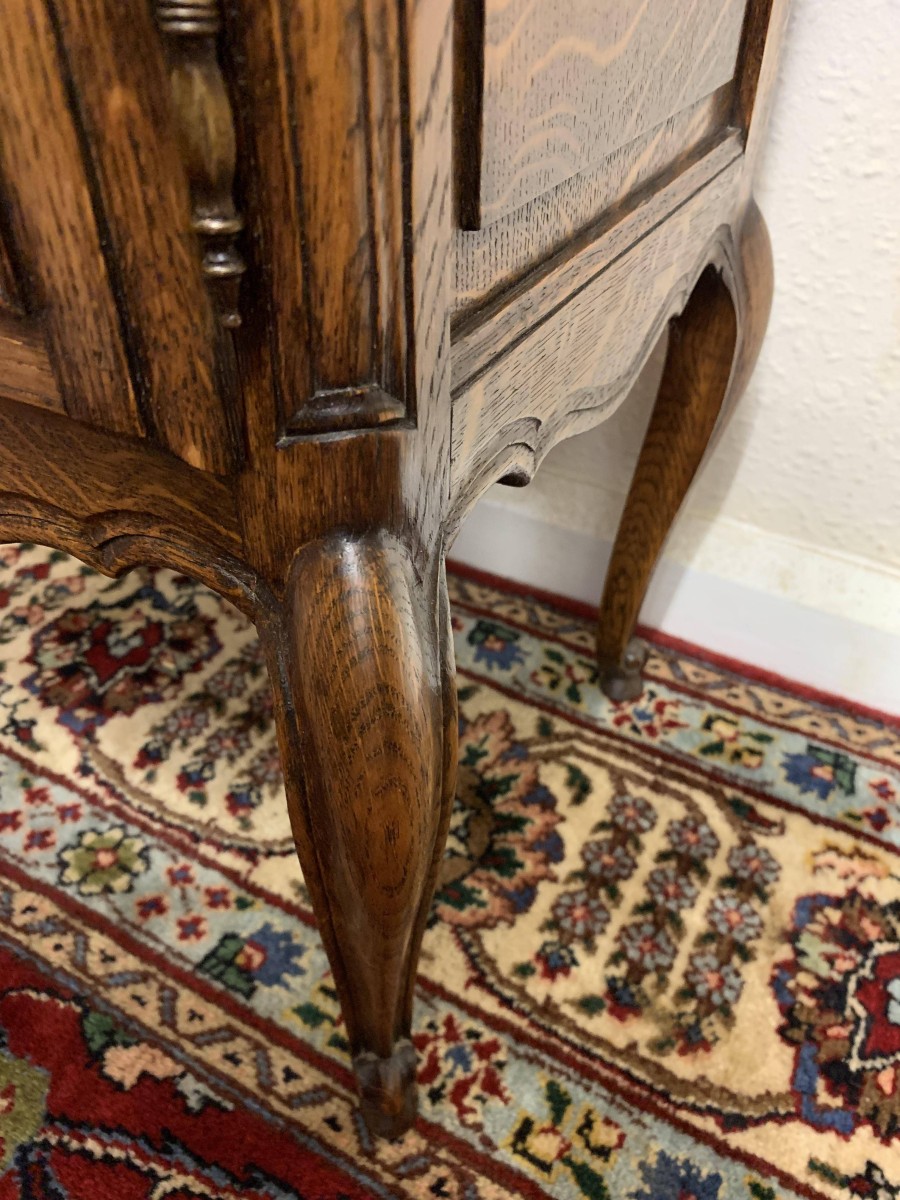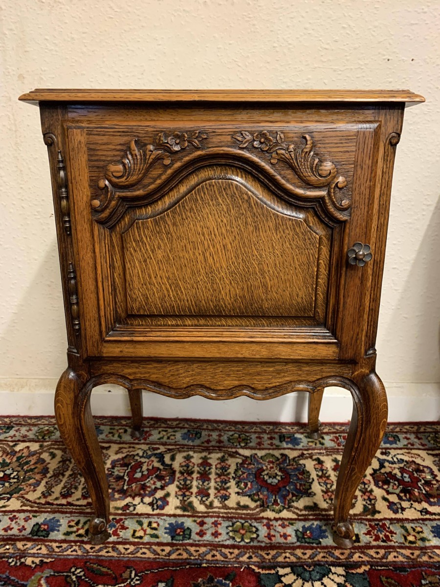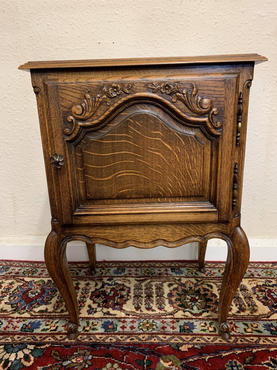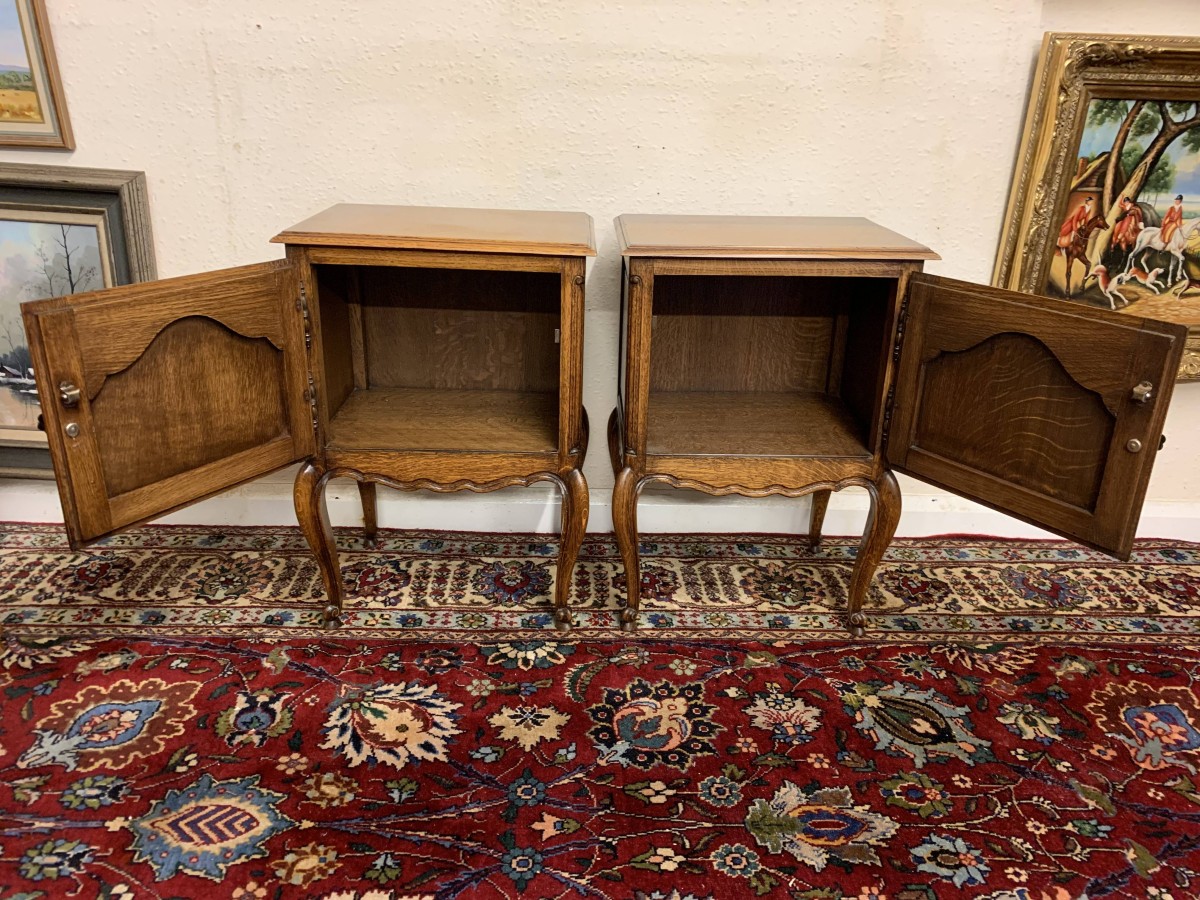 The oversailing top of each cabinet sits above a carved recessed panelled cupboard door with decorative carvings to the top. The doors having brass hinges and ornate brass handle. Recessed panelled sides, shaped skirt this fabulous pair of antique French bedside cabinets which are in excellent condition stand on four carved cabriole shaped legs.