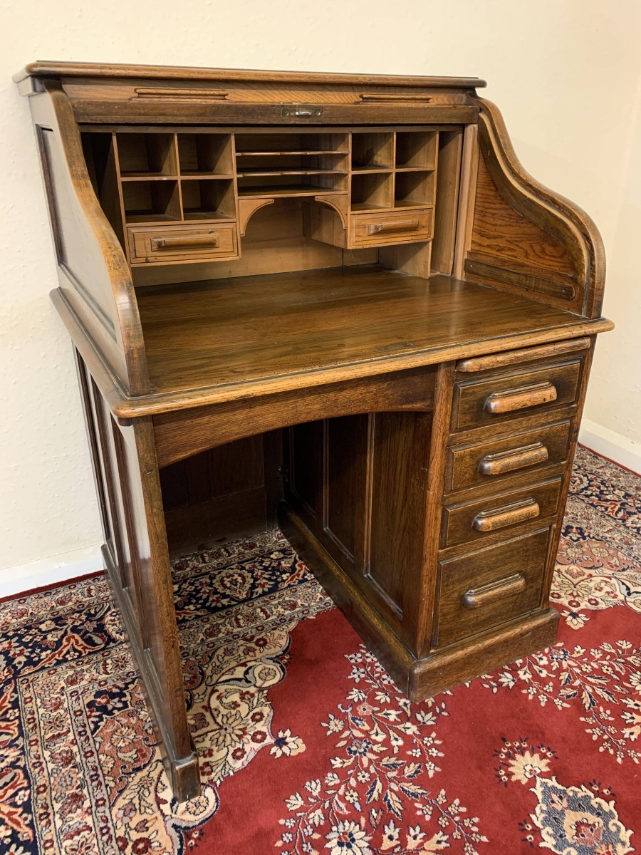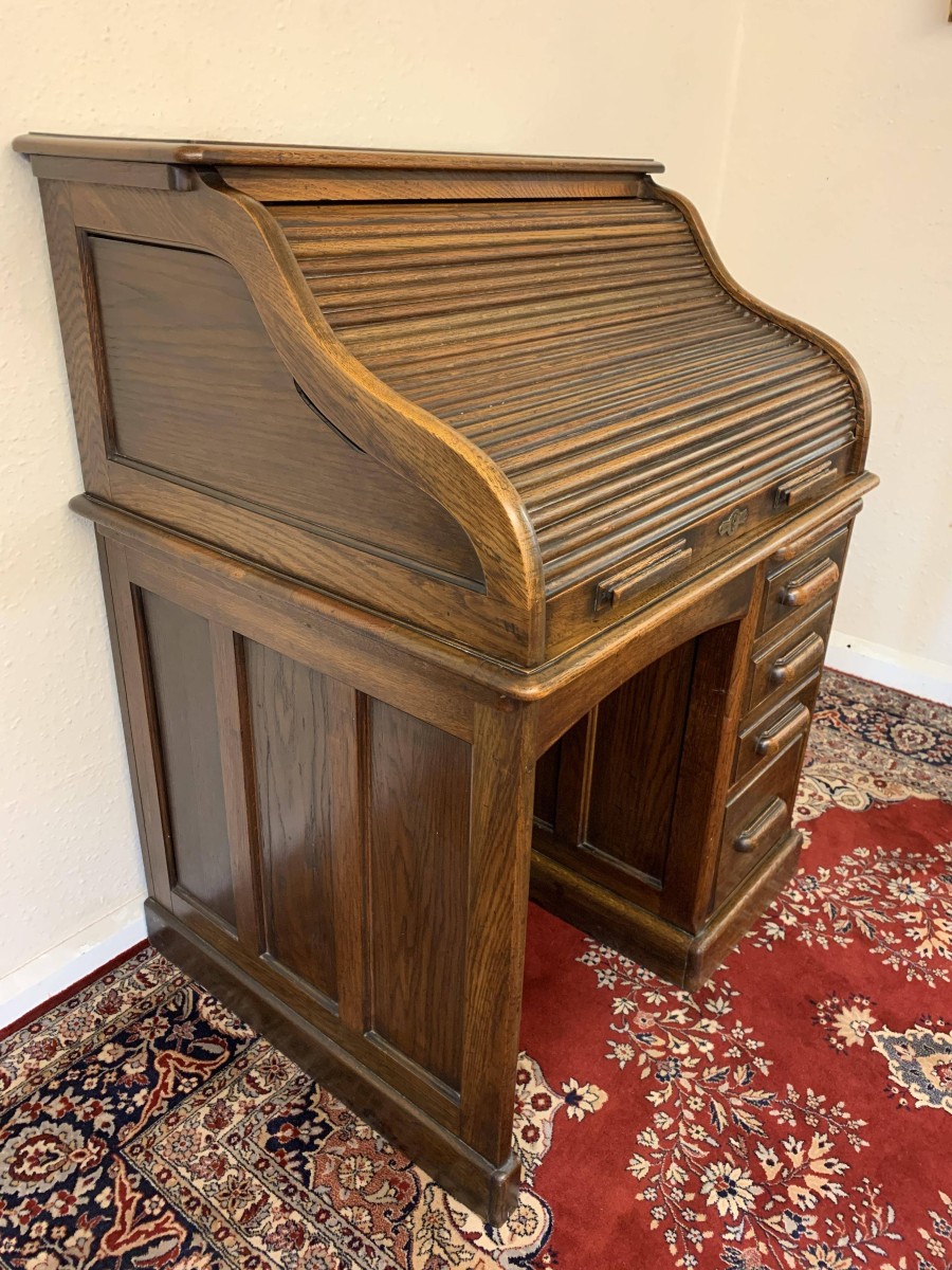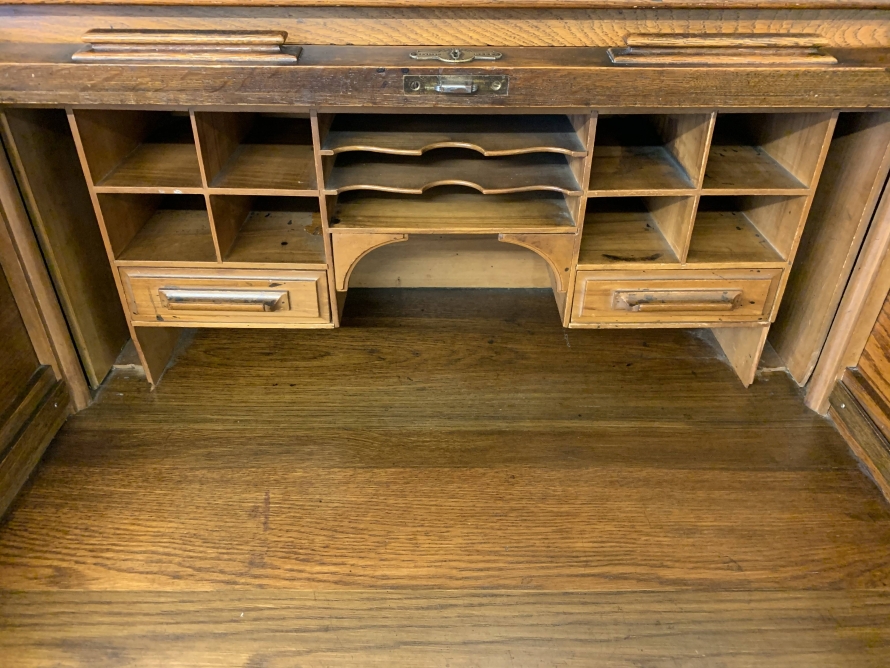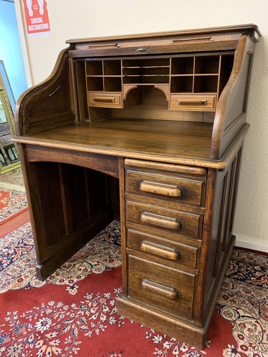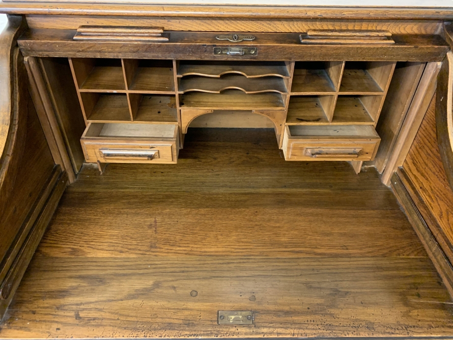A fine example of English craftsmanship, this super size roll top desk is made entirely of glorious English oak. The oversailing top sits above the tambour front fall. The fall opens to reveal drawers, pigeonholes, and a letter rack. Having a single pedestal with a pull out slide above four drawers. There is a drawer at the top of the knee hole. Super panelled sides, the pedestal sits on a platform base.
