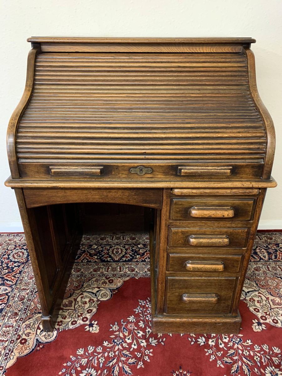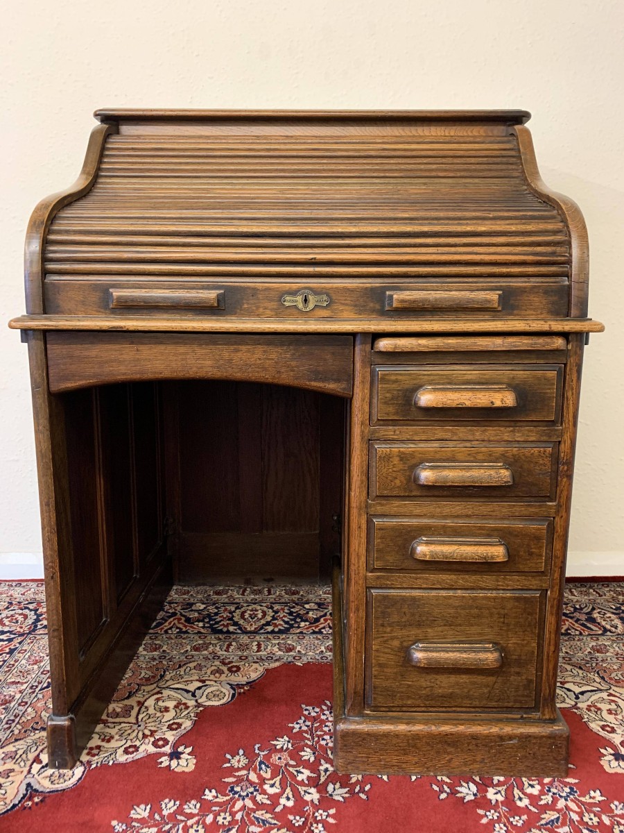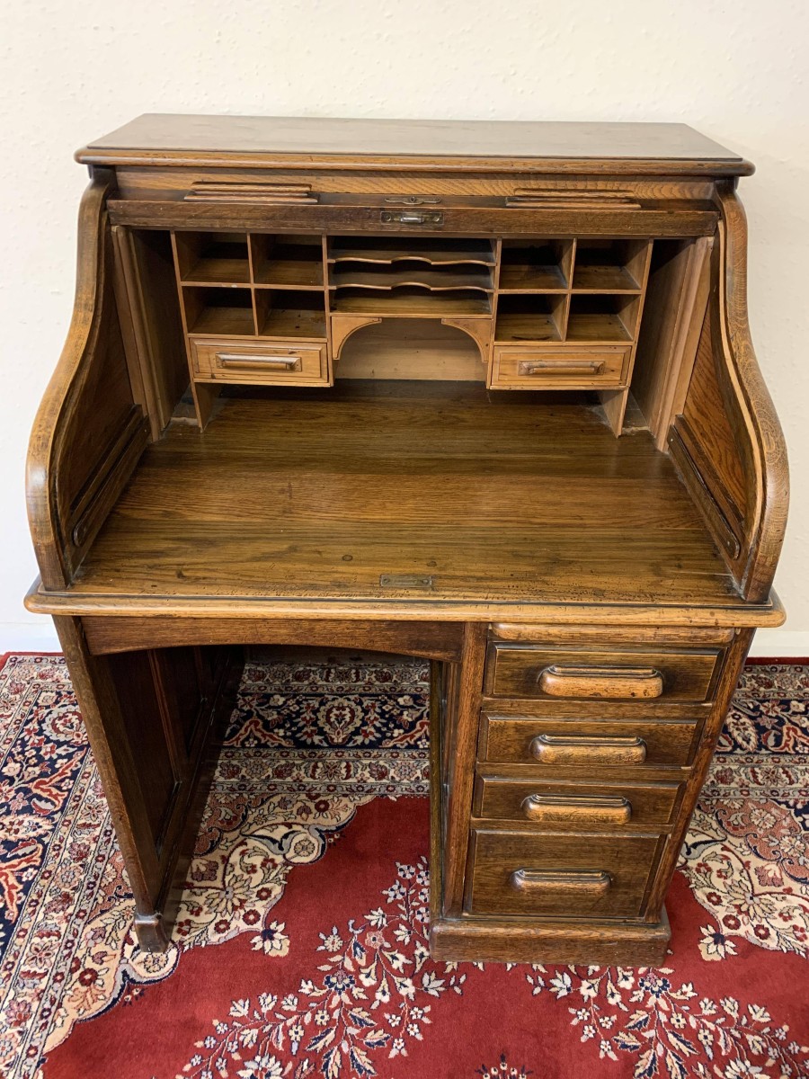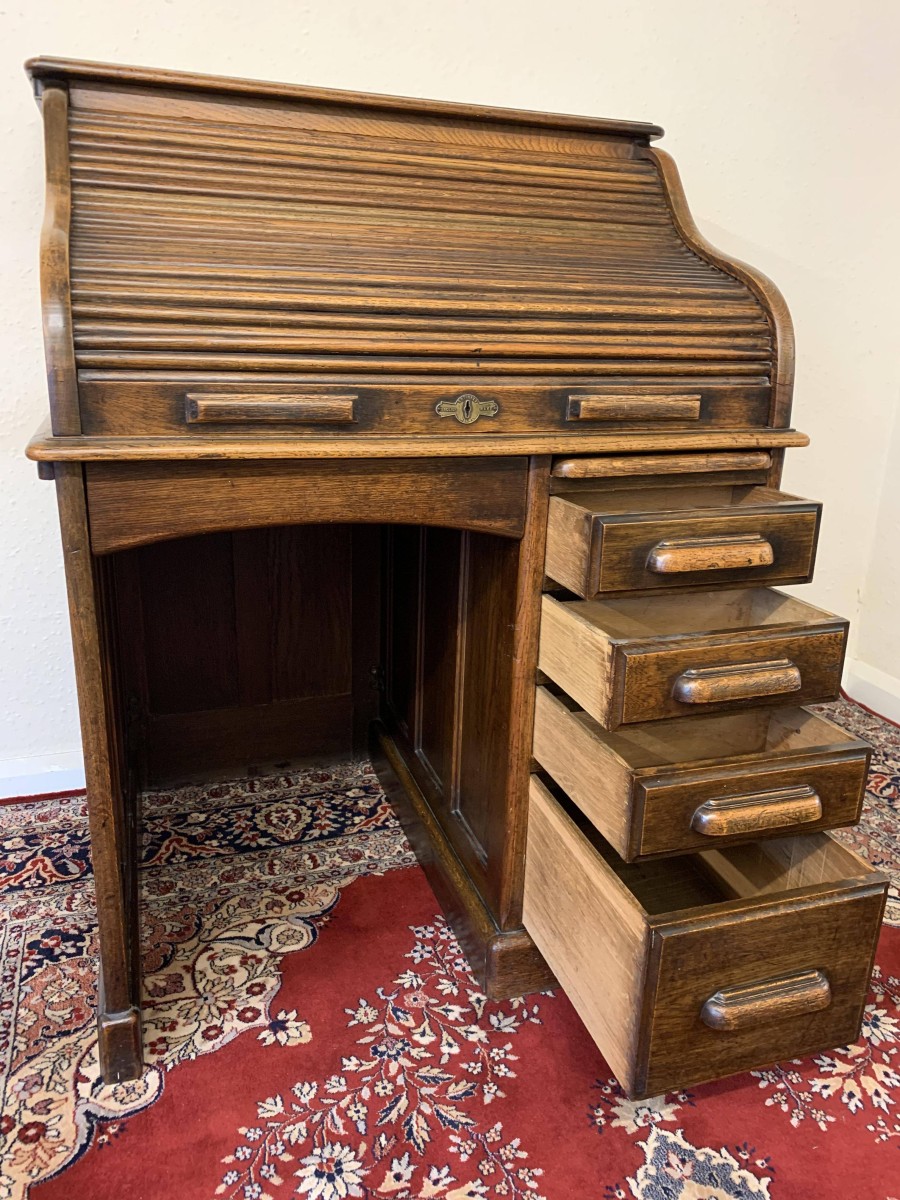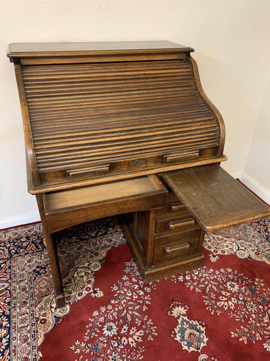 A fine example of English craftsmanship, this super size roll top desk is made entirely of glorious English oak. The oversailing top sits above the tambour front fall. The fall opens to reveal drawers, pigeonholes, and a letter rack. Having a single pedestal with a pull out slide above four drawers. There is a drawer at the top of the knee hole. Super panelled sides, the pedestal sits on a platform base.