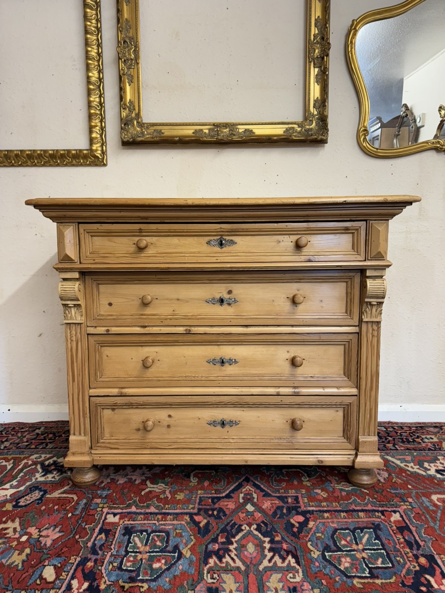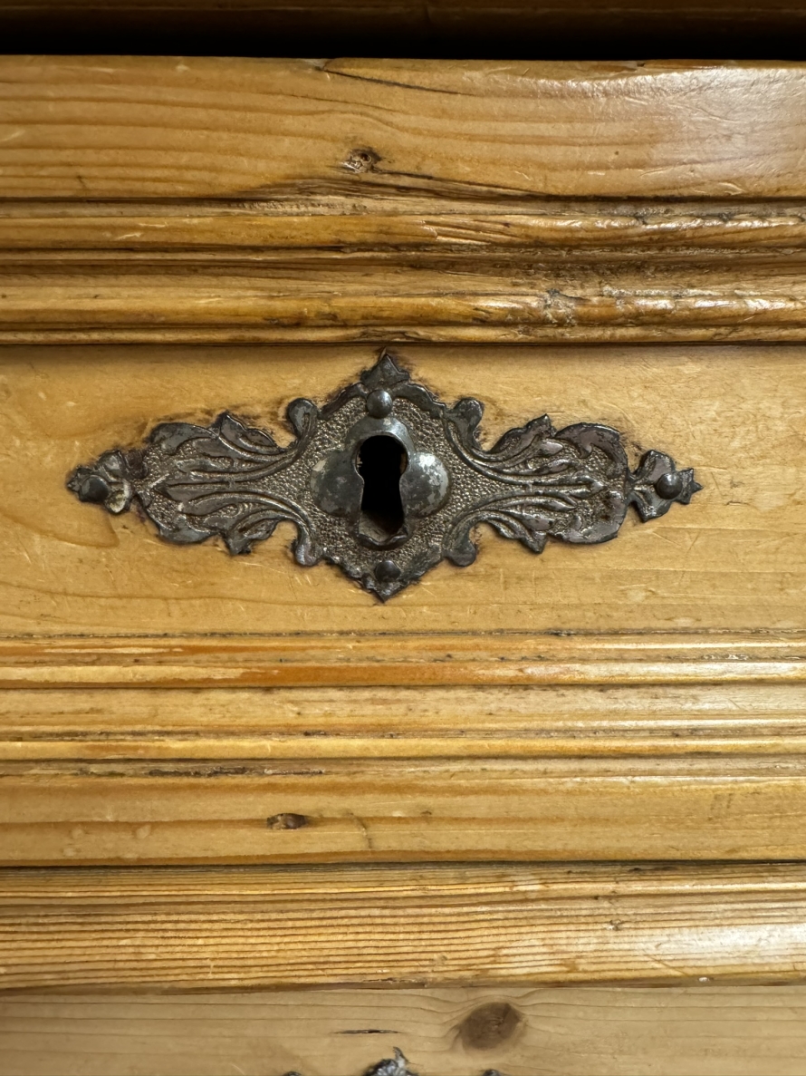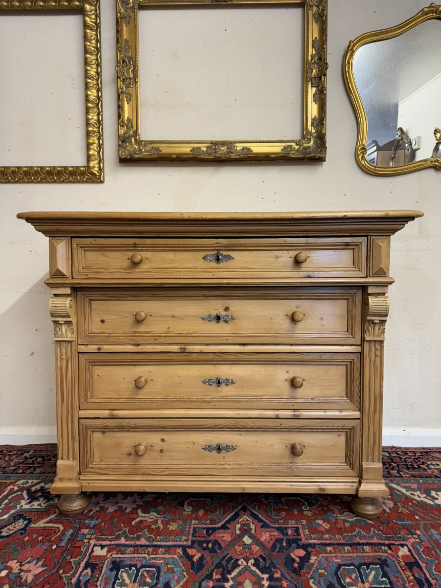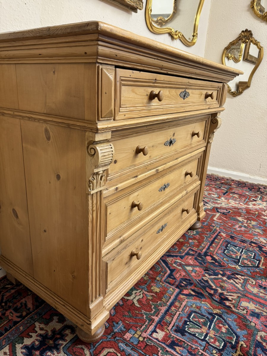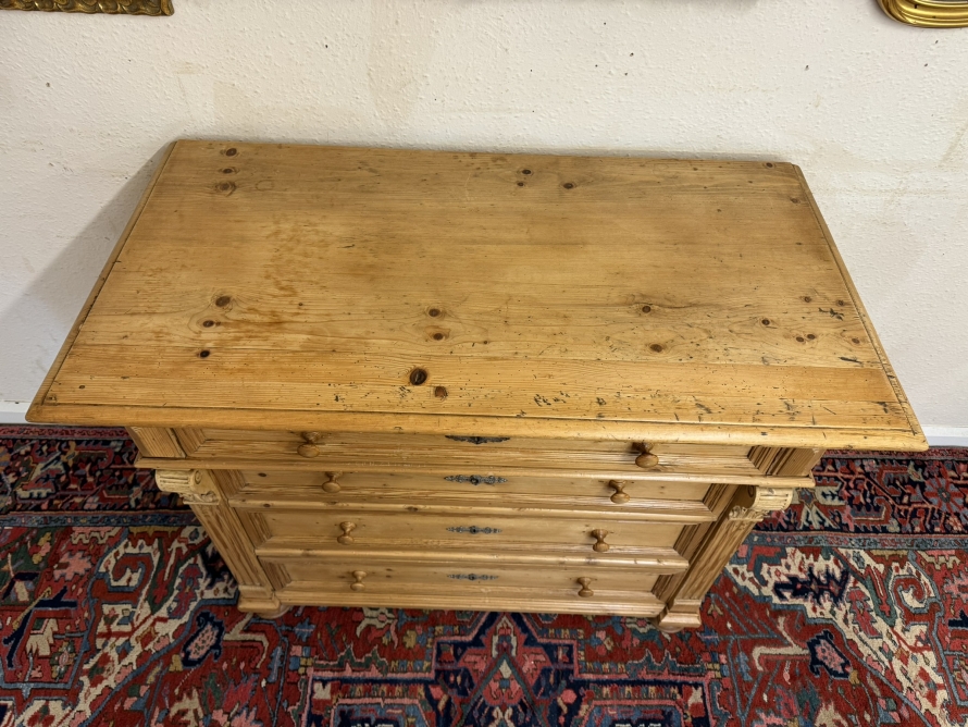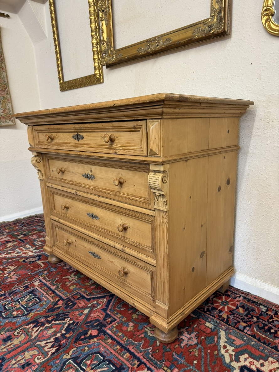 The chest dates circa 1920. Made in pine with age-related wear which gives a fabulous look. The oversailing top sits above four drawers, each drawer with a pair of turned knob handles. The drawers are flanked by a pair of decorative scrolls. This fantastic chest stands on turned feet to the front.