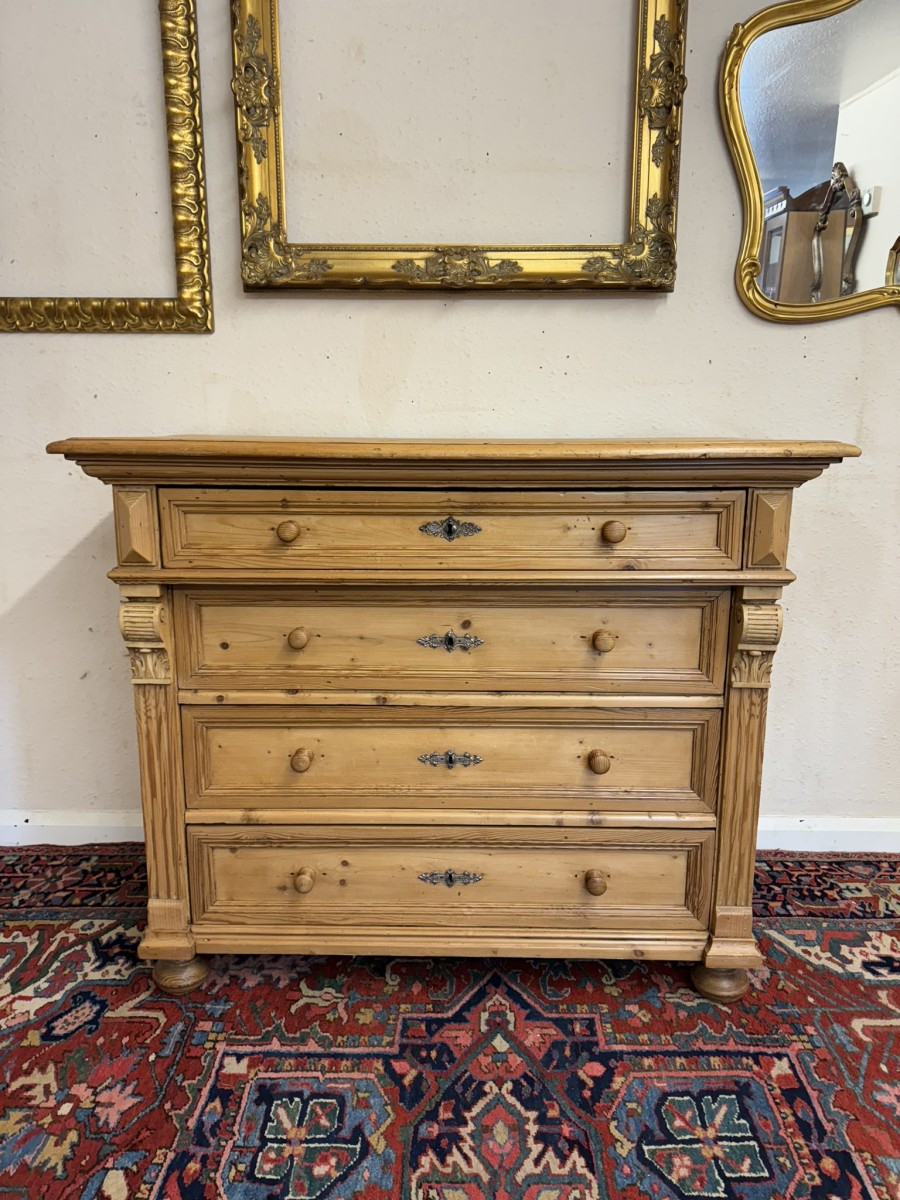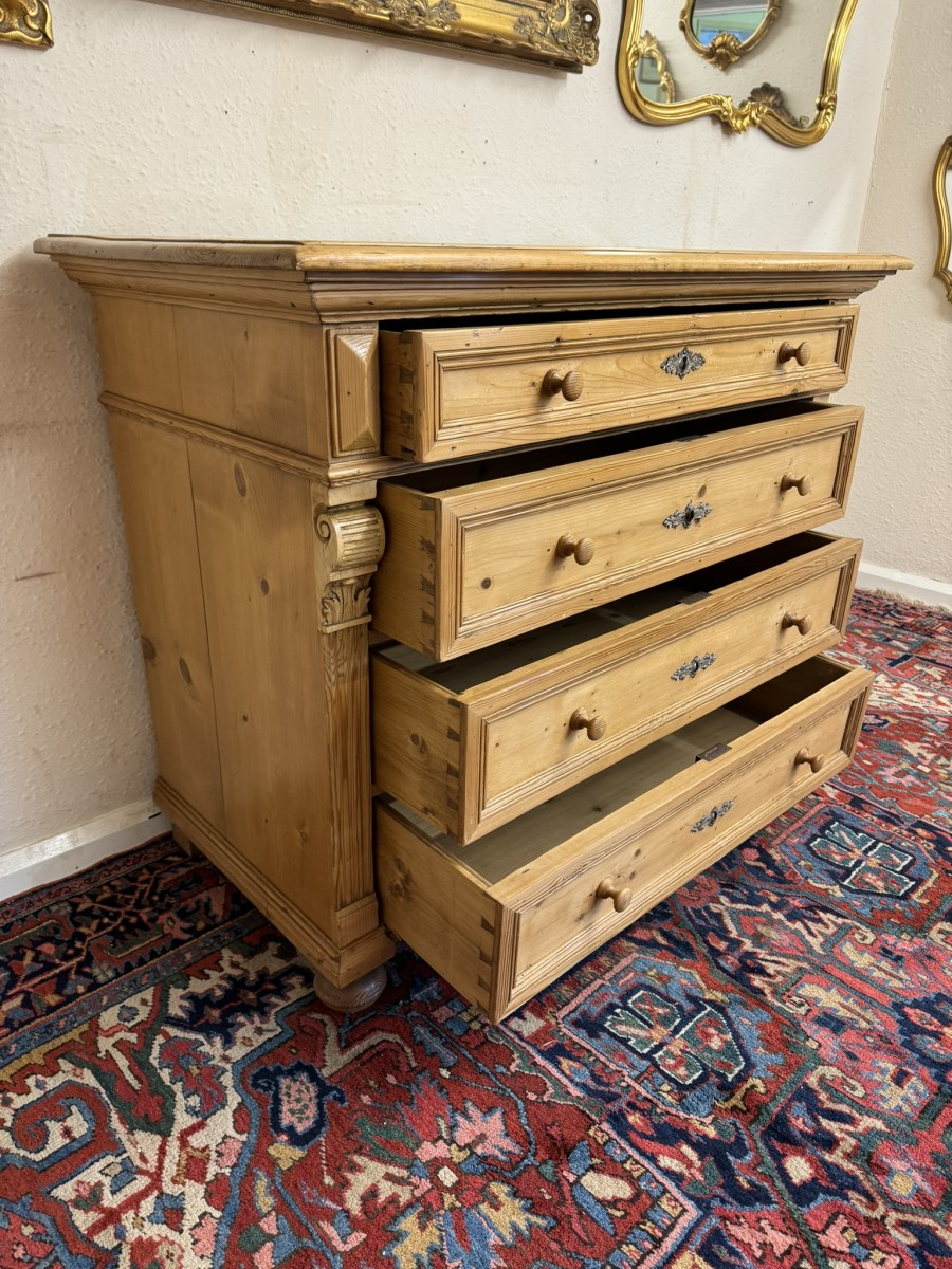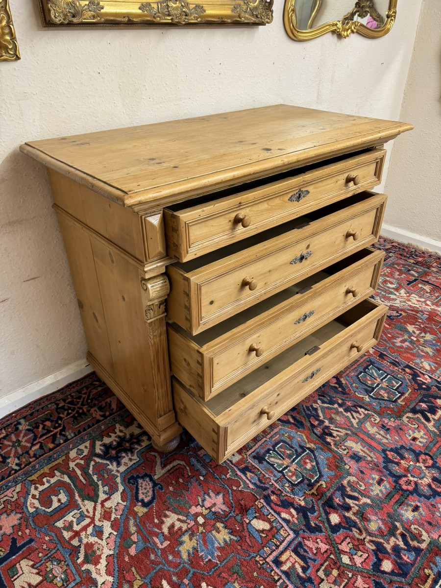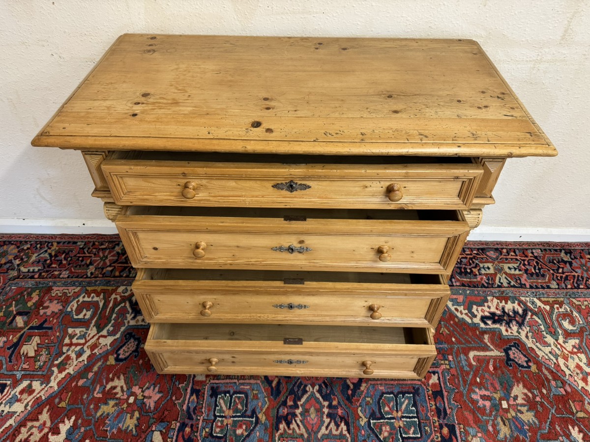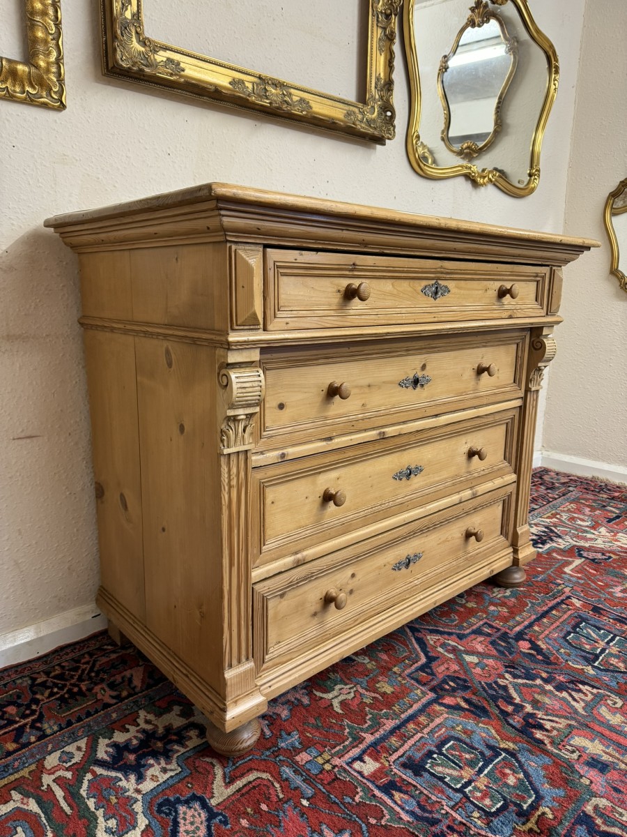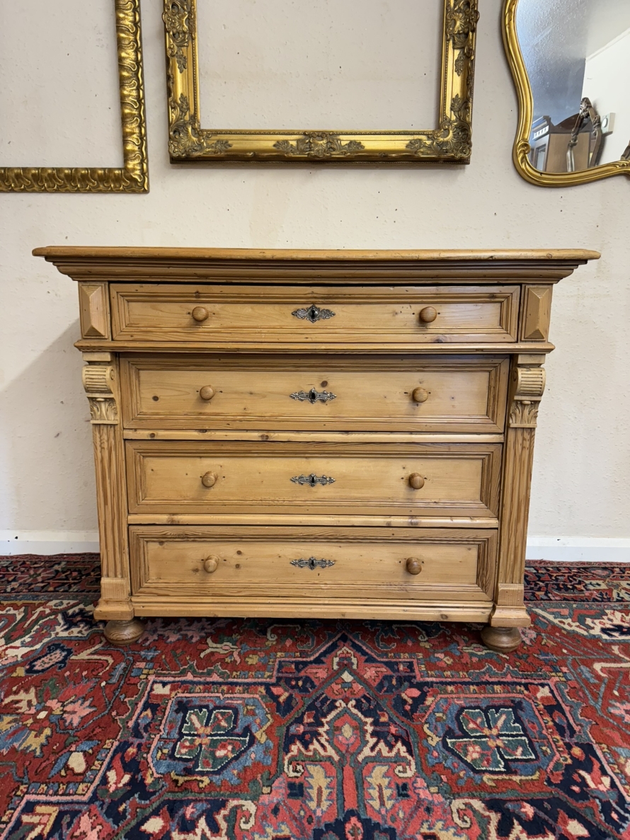 The chest dates circa 1920. Made in pine with age-related wear which gives a fabulous look. The oversailing top sits above four drawers, each drawer with a pair of turned knob handles. The drawers are flanked by a pair of decorative scrolls. This fantastic chest stands on turned feet to the front.