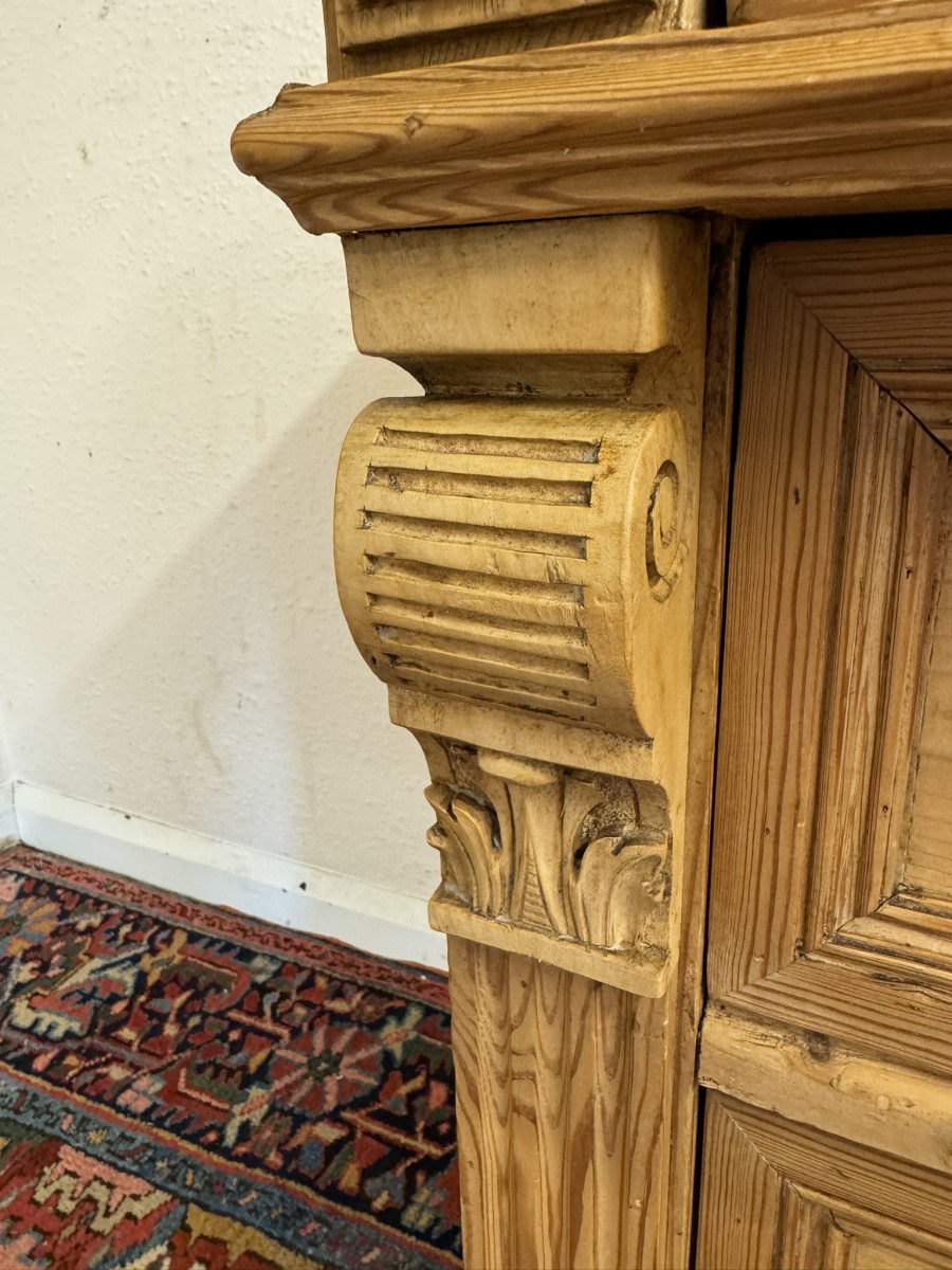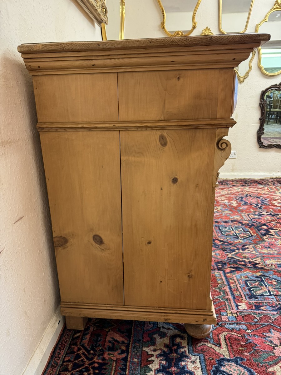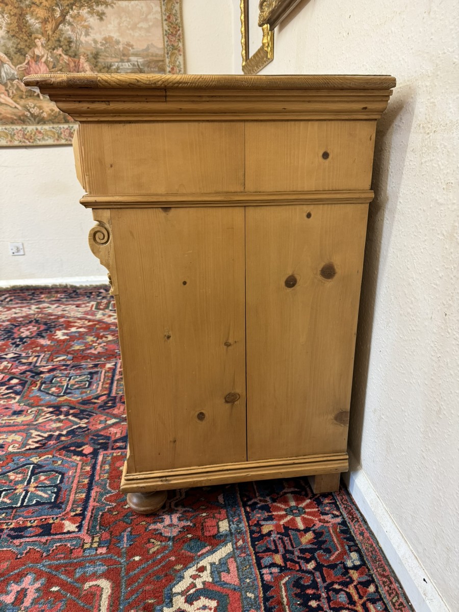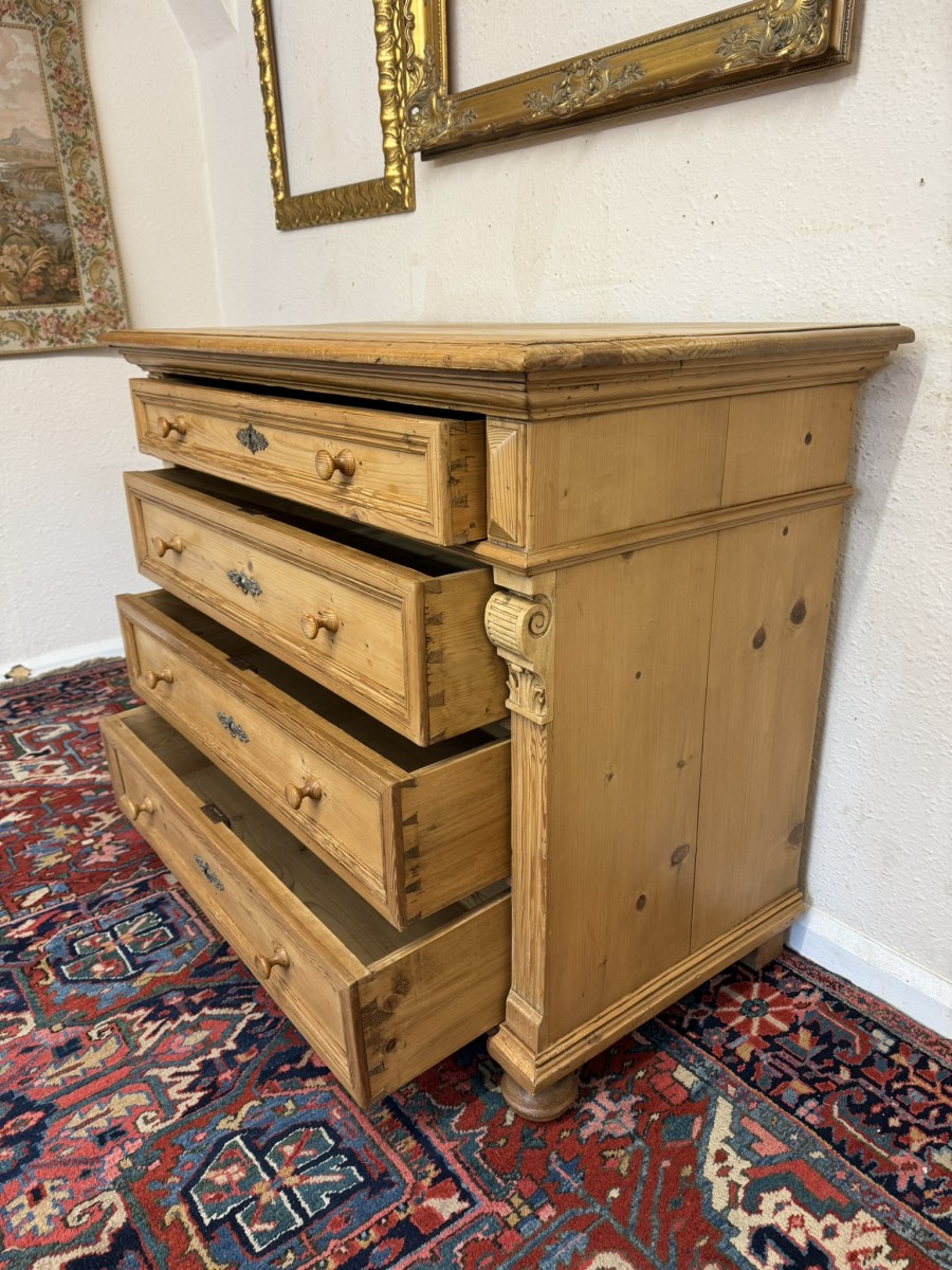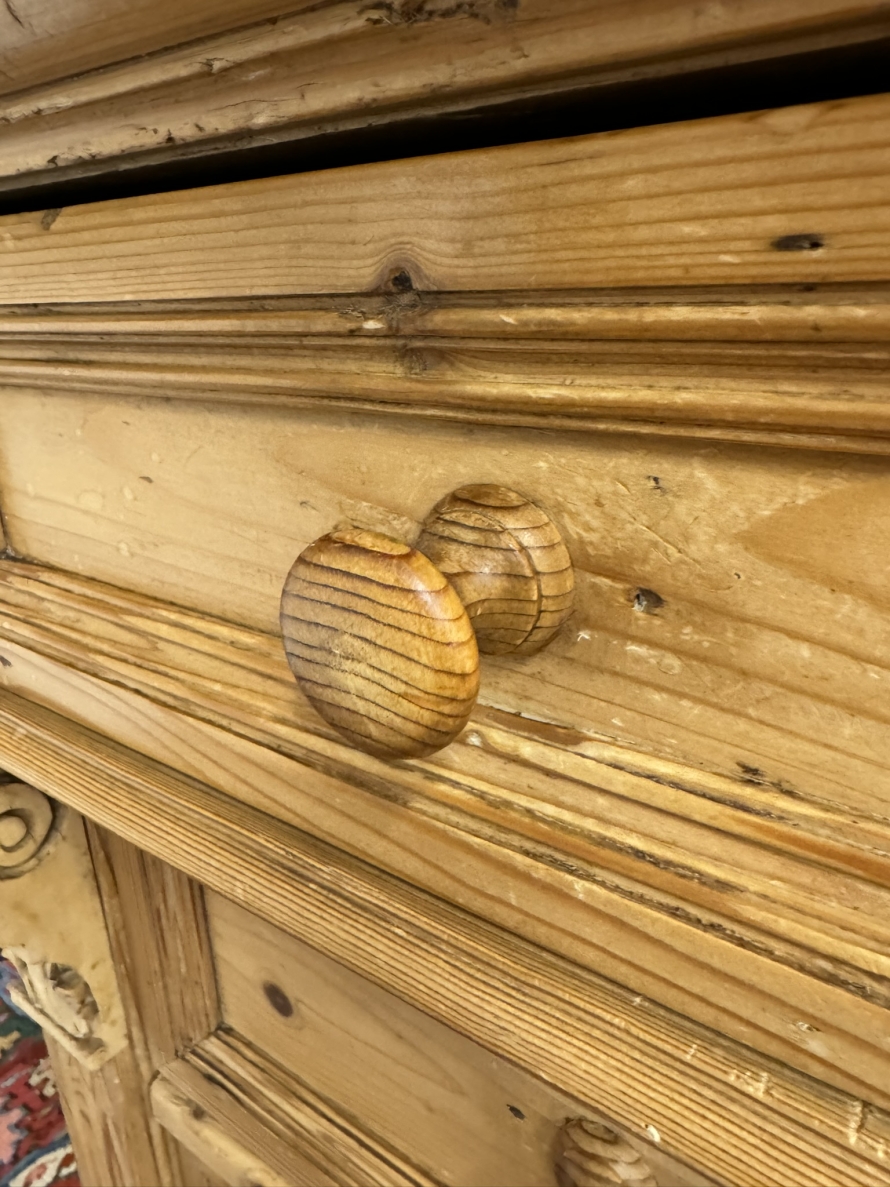 The chest dates circa 1920. Made in pine with age-related wear which gives a fabulous look. The oversailing top sits above four drawers, each drawer with a pair of turned knob handles. The drawers are flanked by a pair of decorative scrolls. This fantastic chest stands on turned feet to the front.