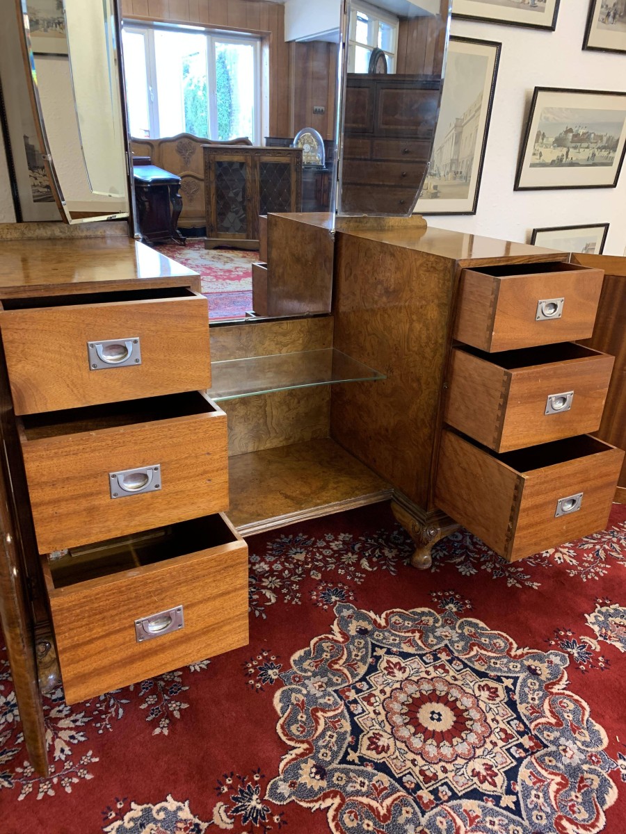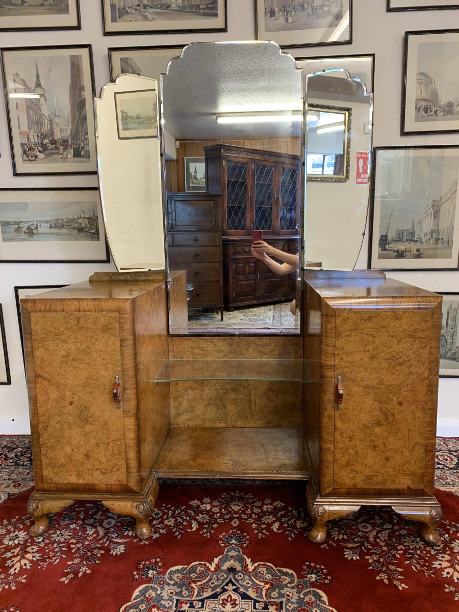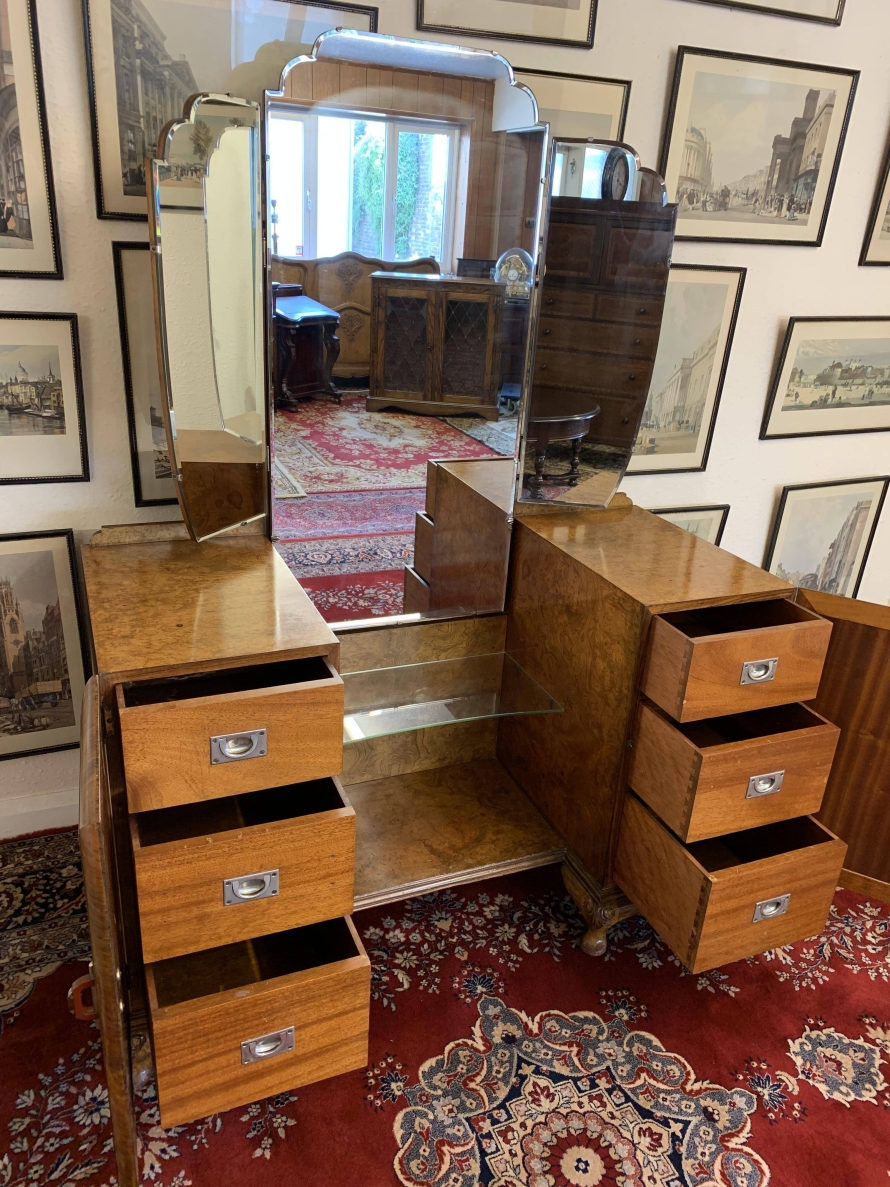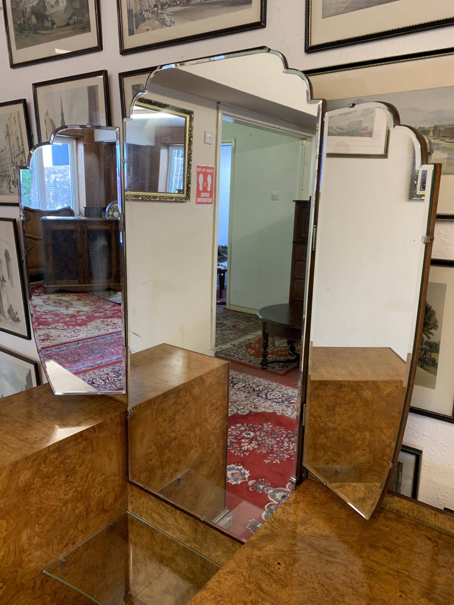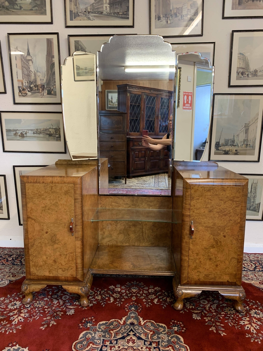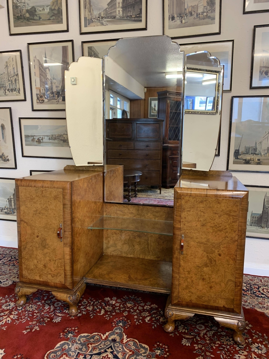 Style personified in this stunning Burr Walnut Art Deco triple mirror dressing table. The shaped central mirror is flanked by a pair of shaped adjustable side mirrors. The drop centre has a glass shelf and is flanked by a pair of cupboard doors. The doors open to reveal an array of cupboard doors. The doors open to reveal an array of drawers. The dressing table stands on six carved cabriole legs. Please note that the patina of the walnut is striking and the condition is excellent.