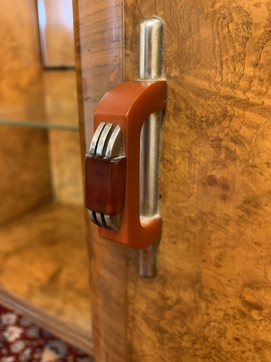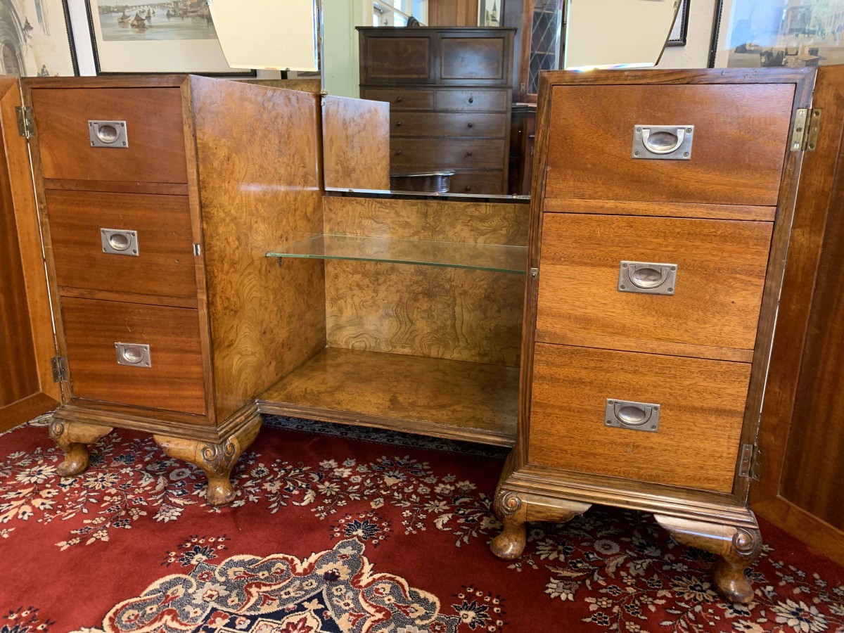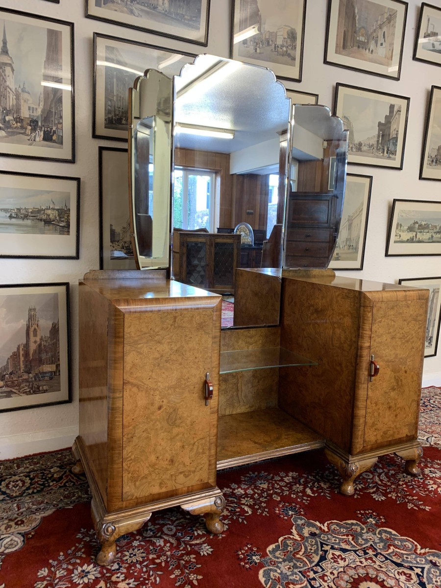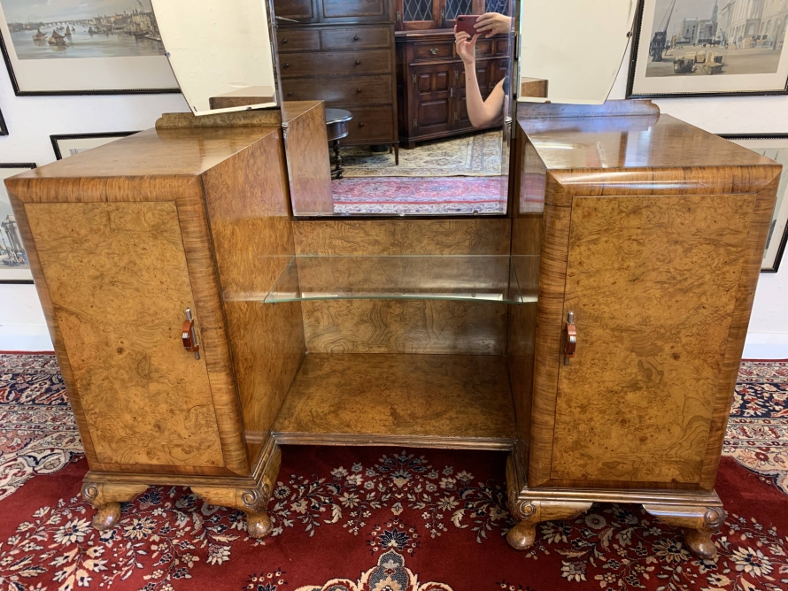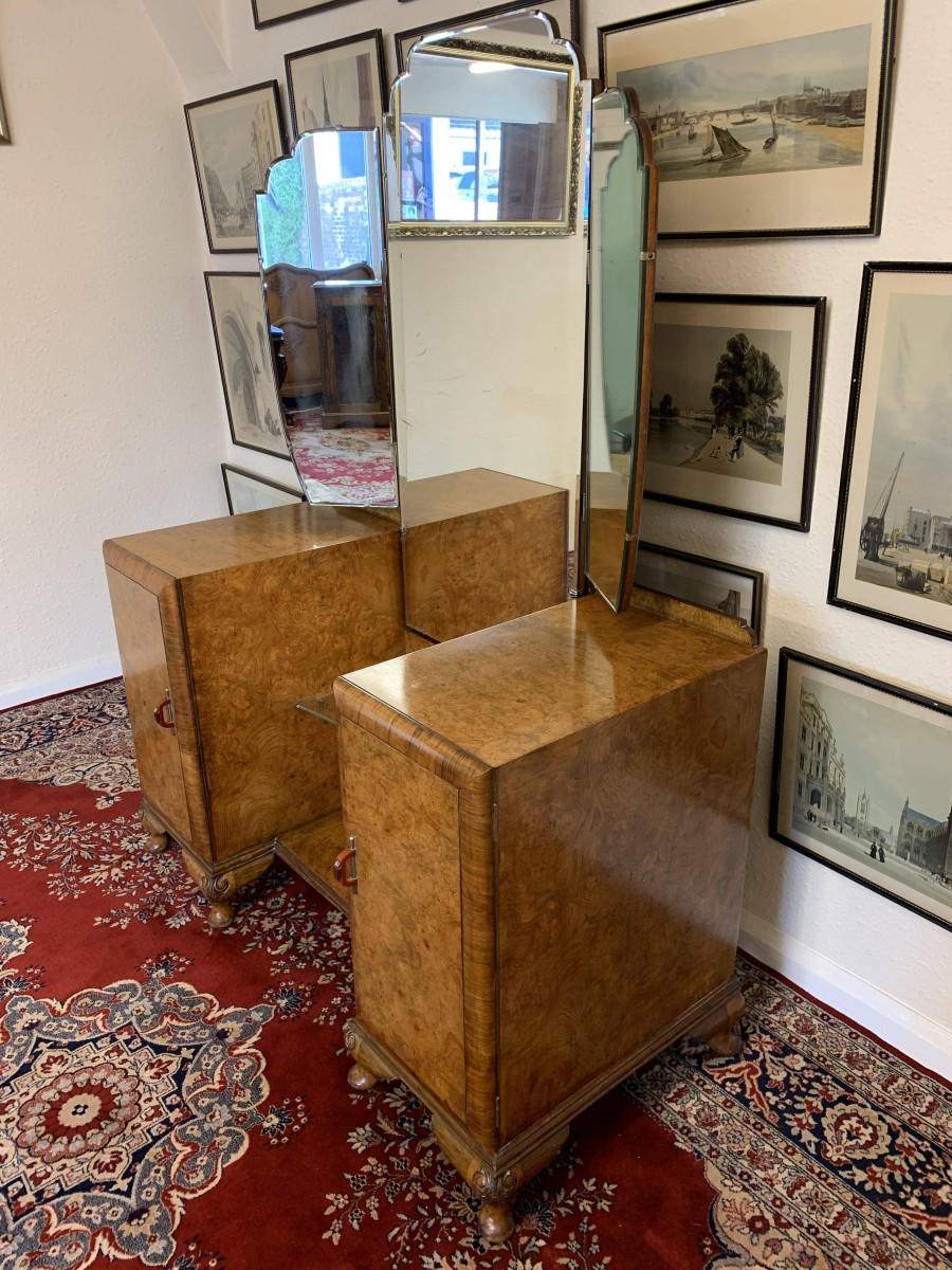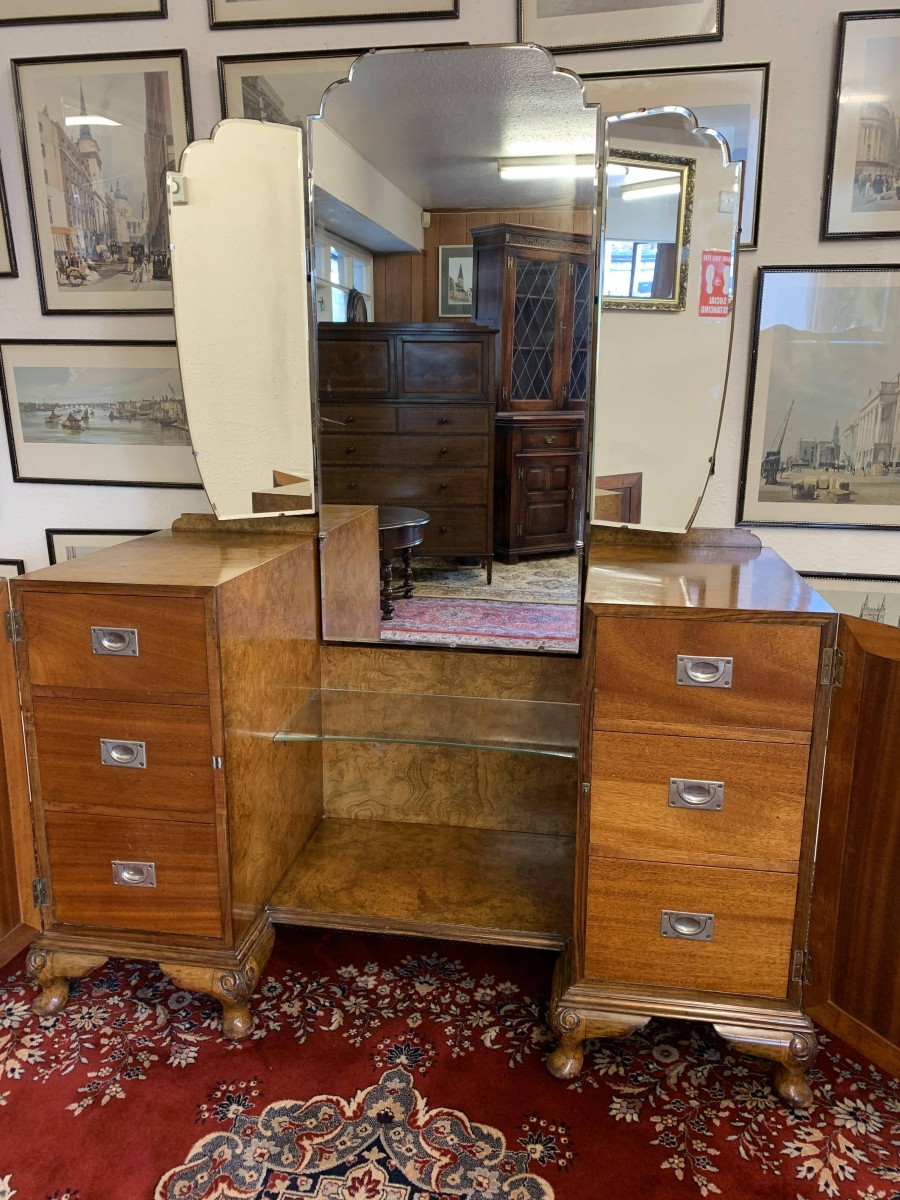 Style personified in this stunning Burr Walnut Art Deco triple mirror dressing table. The shaped central mirror is flanked by a pair of shaped adjustable side mirrors. The drop centre has a glass shelf and is flanked by a pair of cupboard doors. The doors open to reveal an array of cupboard doors. The doors open to reveal an array of drawers. The dressing table stands on six carved cabriole legs. Please note that the patina of the walnut is striking and the condition is excellent.