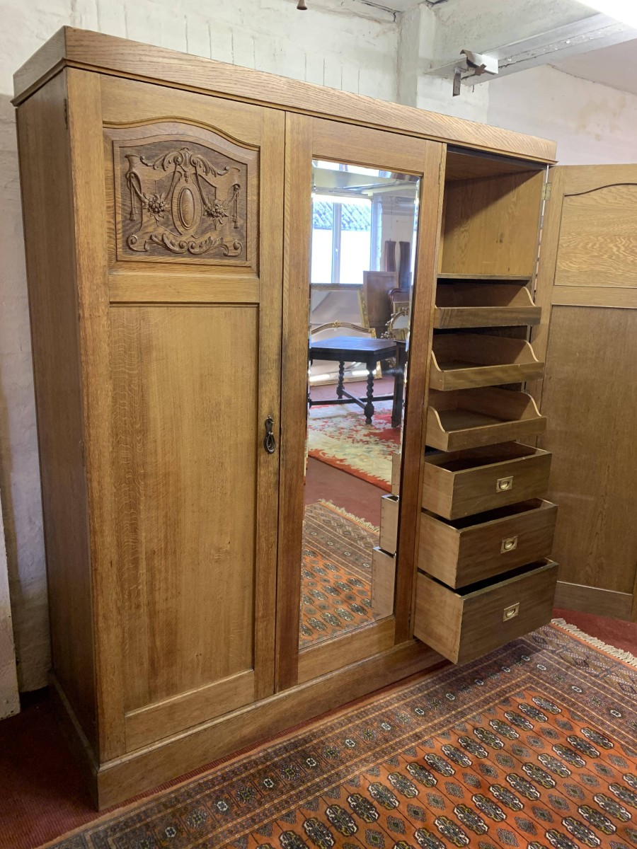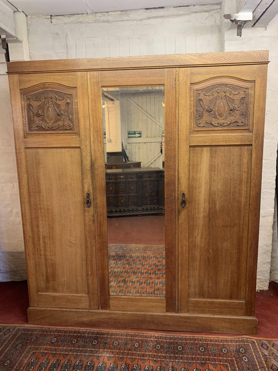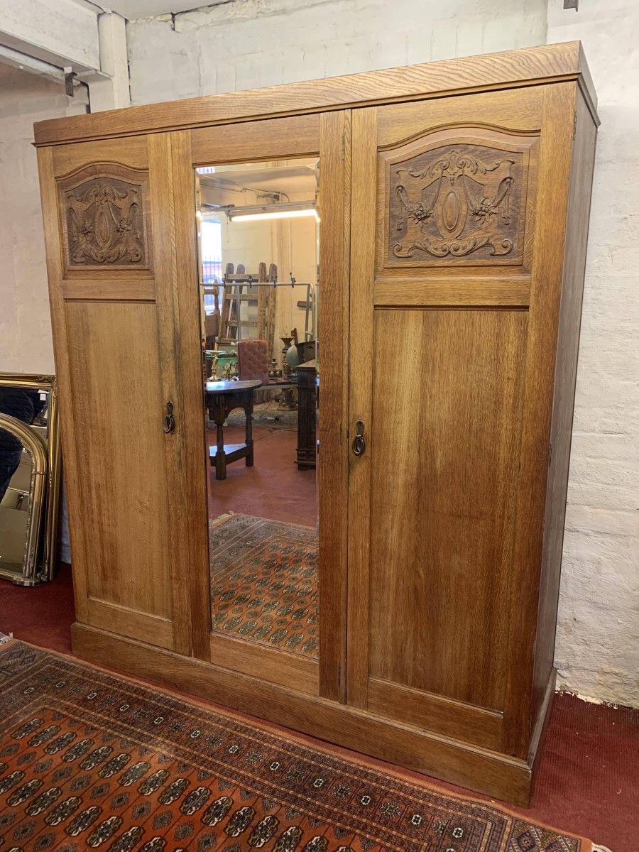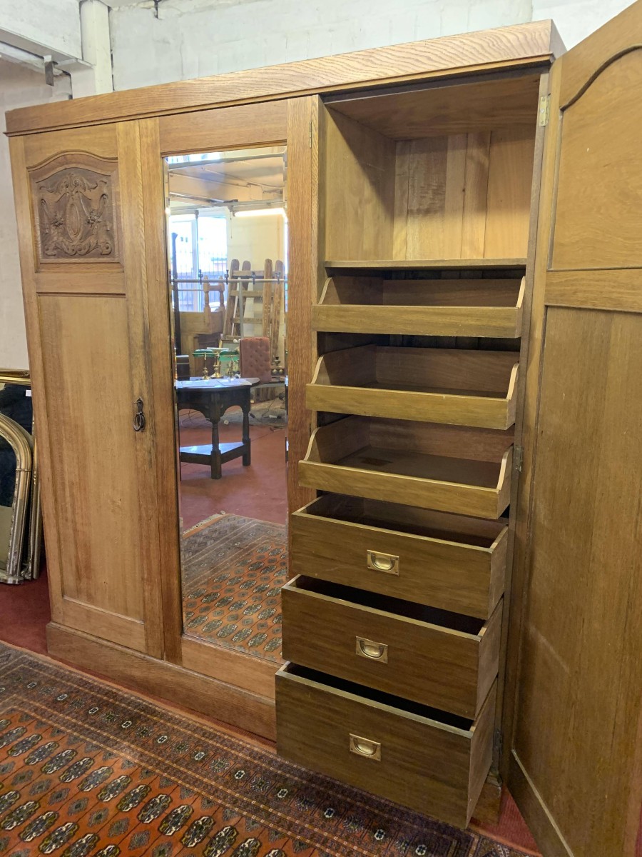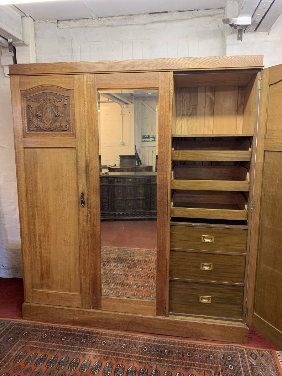 A fabulous wardrobe made entirely in solid oak. The oversailing top sits above a central full length bevel edged mirrored door. This mirror door is flanked by a pair of carved recessed panelled lockable doors. The left-hand door and mirrored door open to reveal a shelf with hanging rail and hooks below. The right-hand door opens to reveal a shelf with three sliding shelves below which are three drawers, each drawer with brass handle. The wardrobe sits on a plinth base. This glorious wardrobe offers ample storage space. The wardrobe splits down for easy delivery into any home.