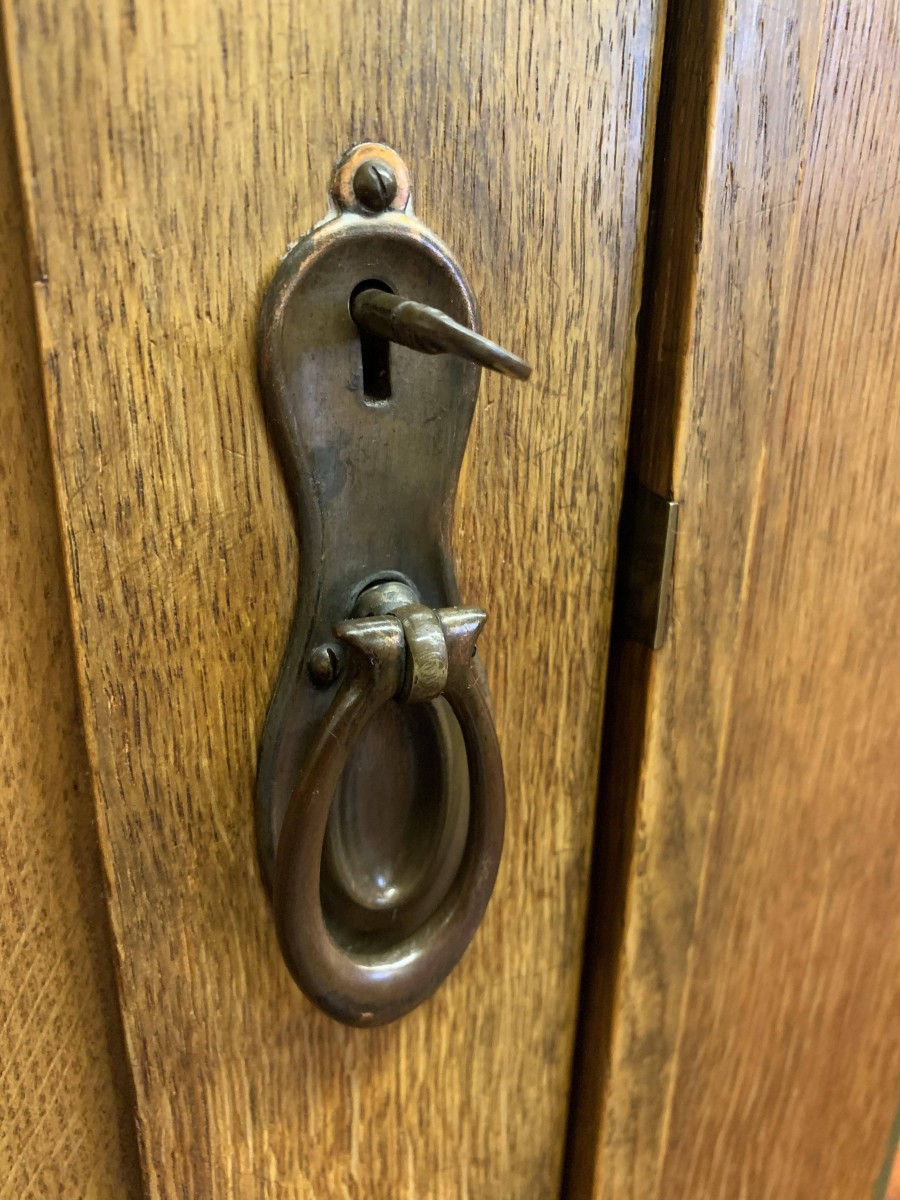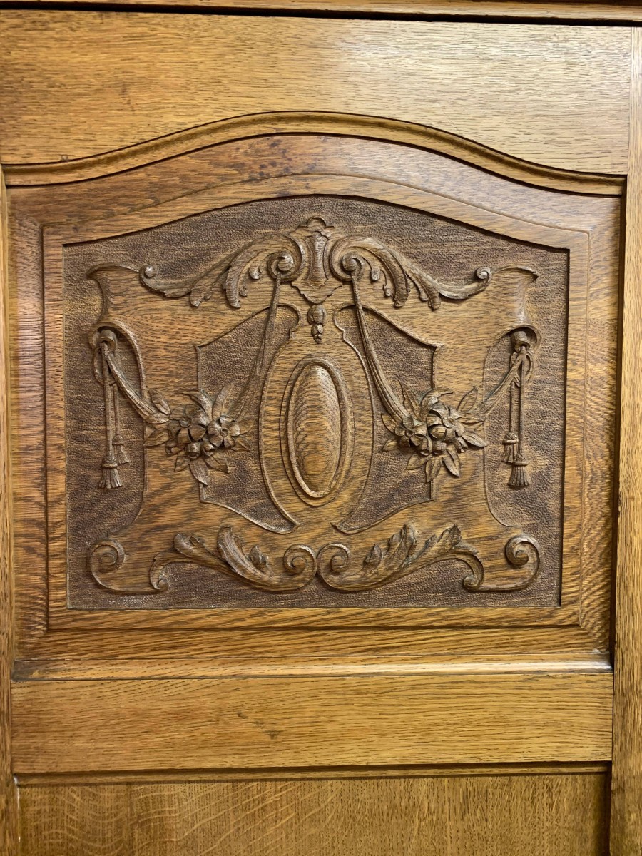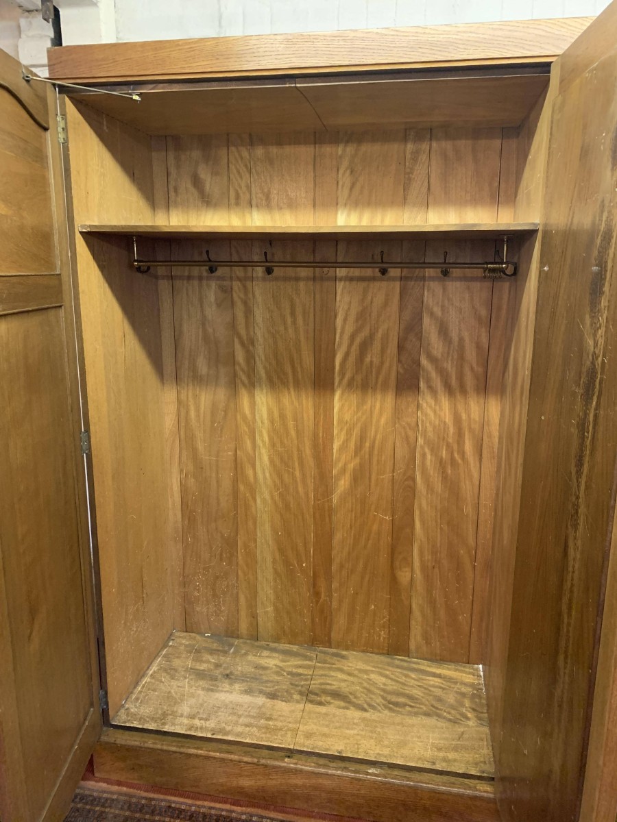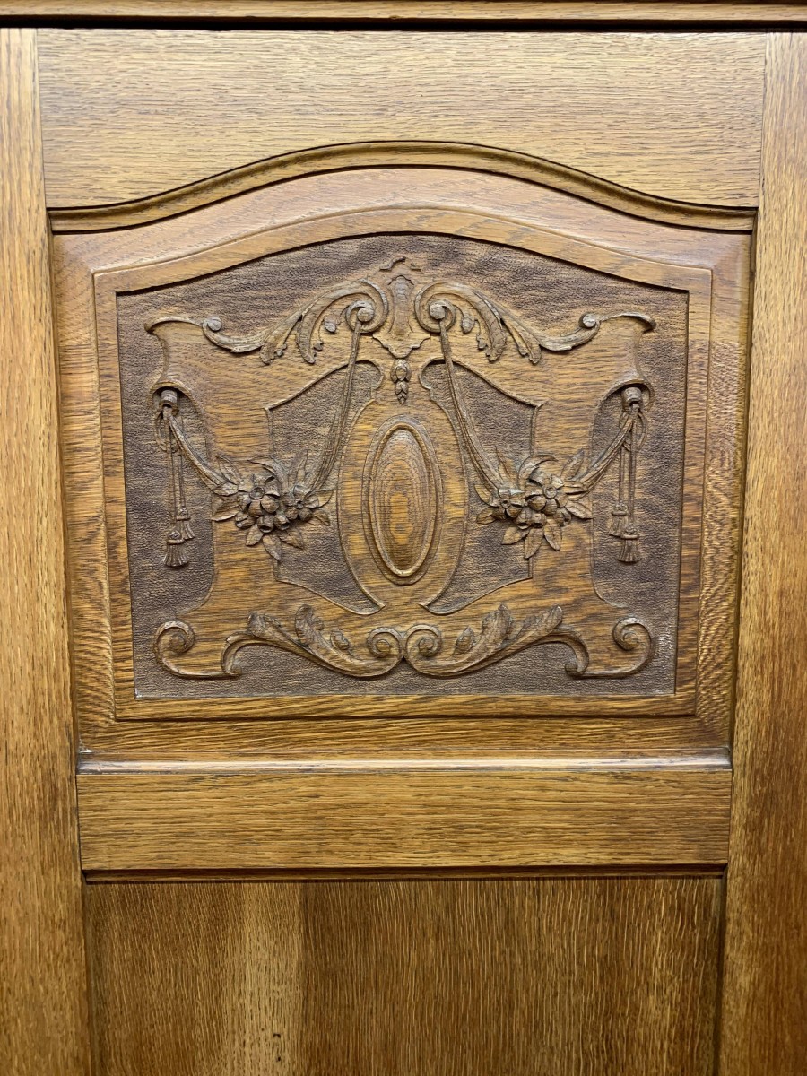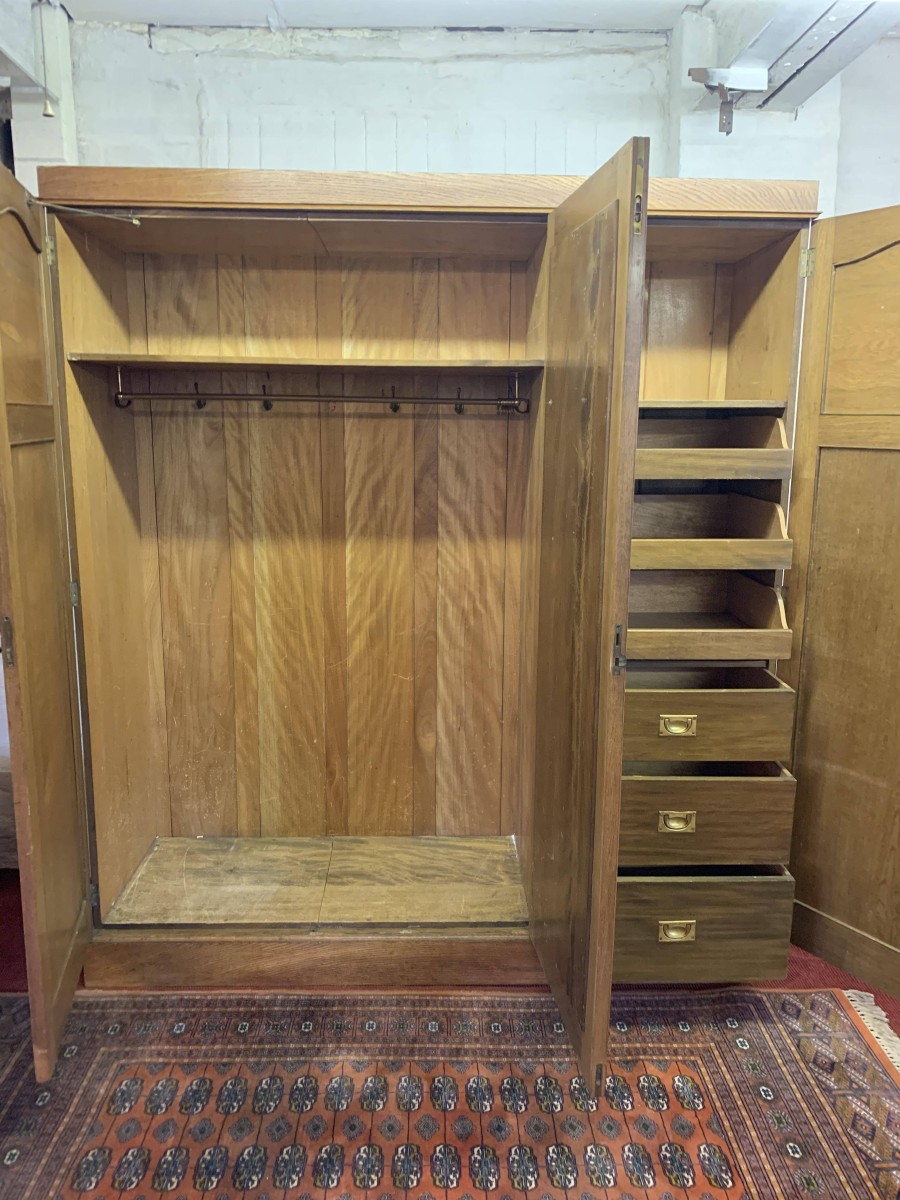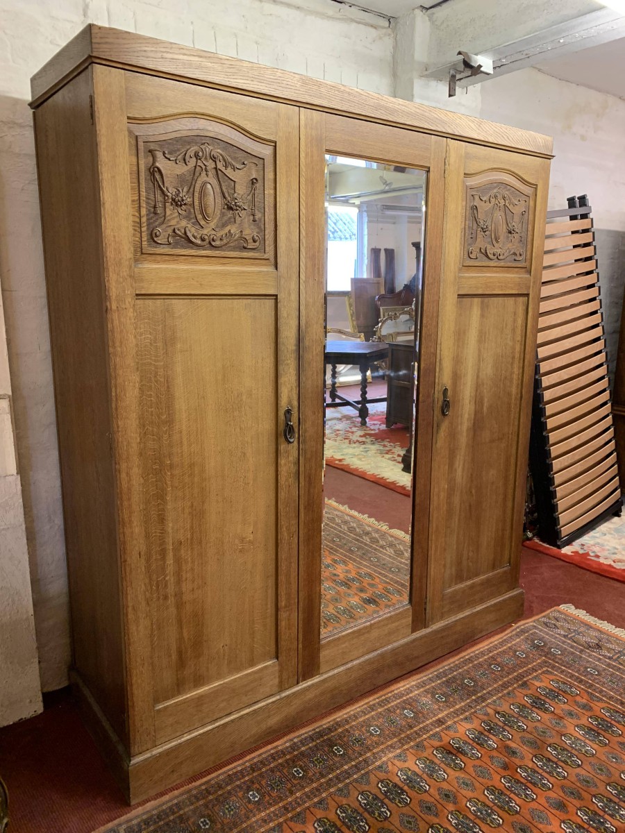 A fabulous wardrobe made entirely in solid oak. The oversailing top sits above a central full length bevel edged mirrored door. This mirror door is flanked by a pair of carved recessed panelled lockable doors. The left-hand door and mirrored door open to reveal a shelf with hanging rail and hooks below. The right-hand door opens to reveal a shelf with three sliding shelves below which are three drawers, each drawer with brass handle. The wardrobe sits on a plinth base. This glorious wardrobe offers ample storage space. The wardrobe splits down for easy delivery into any home.