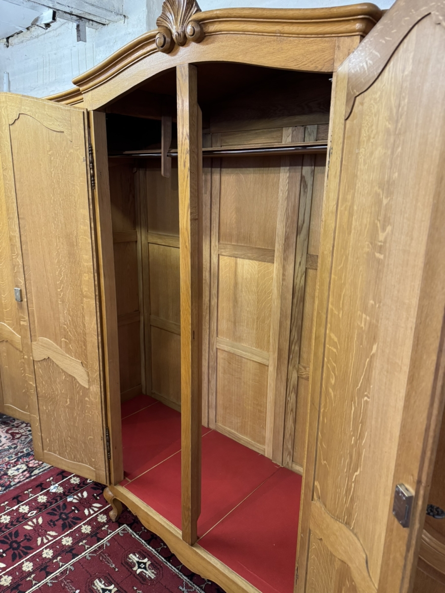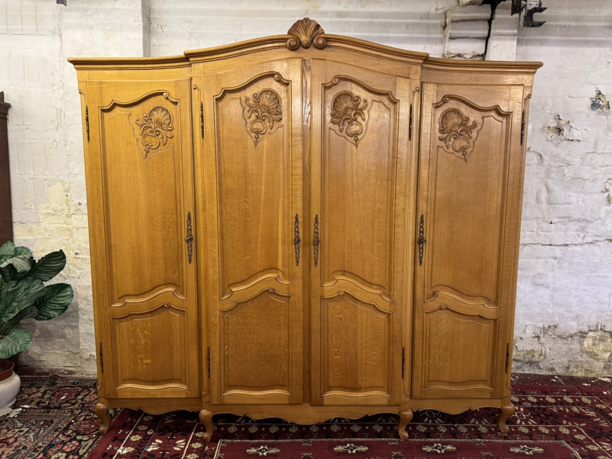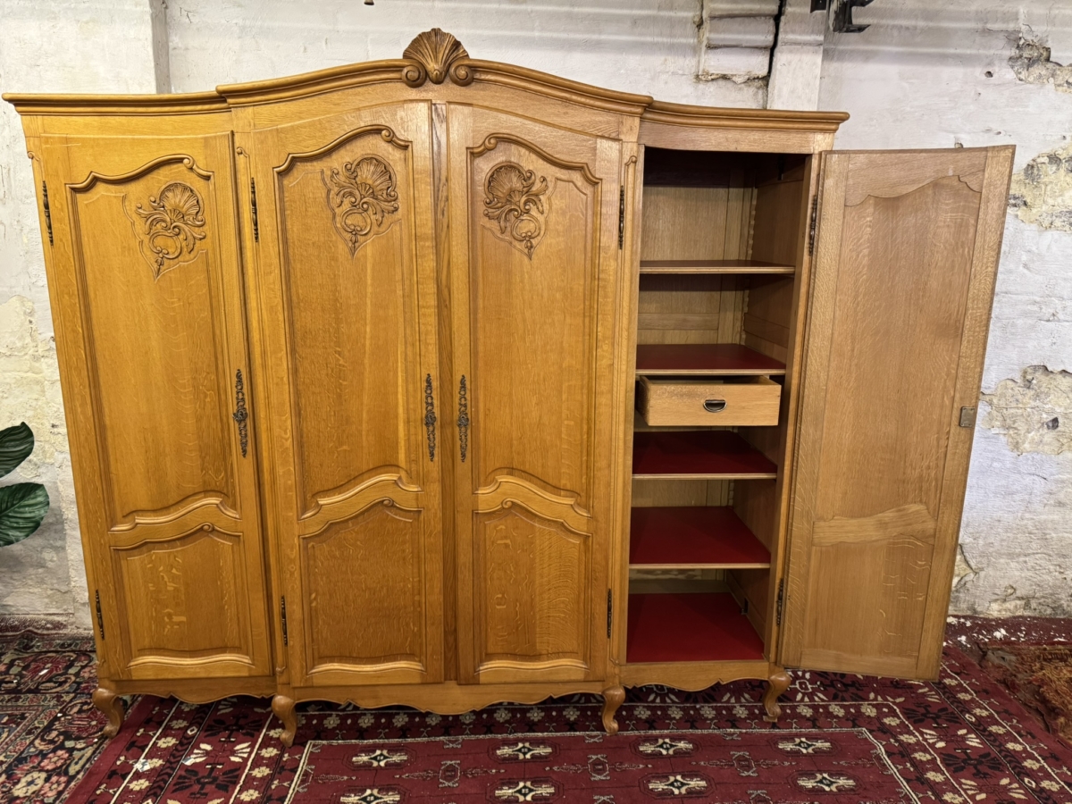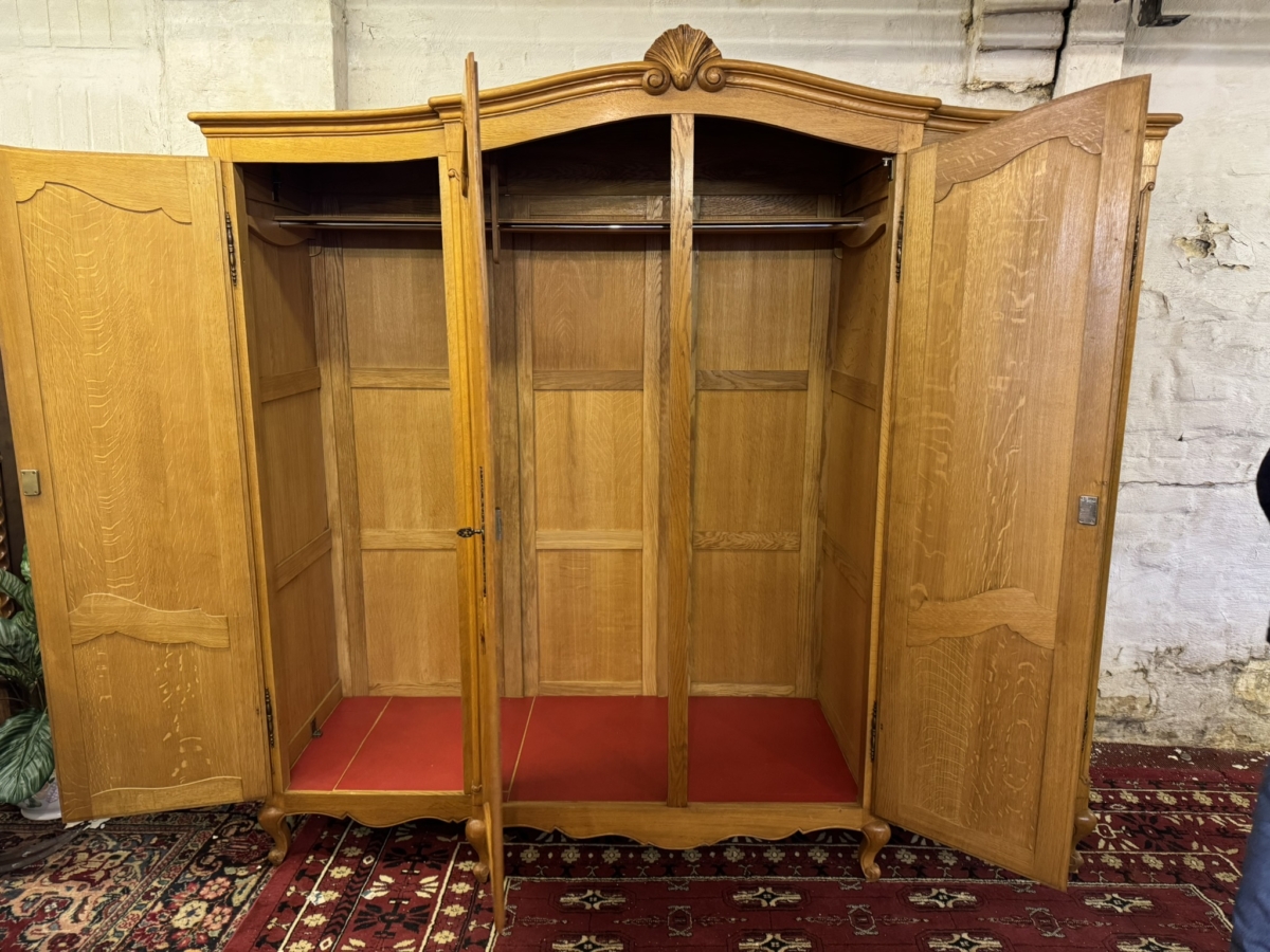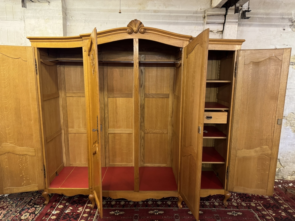 The shaped top rises to a decorative fan carving, below are four lockable carved recessed panelled doors, the central pair of doors are brake front in design. Each door has brass hinges brass escutcheon and key. The left-hand door and pair of central doors open to reveal a wooden shelf above a metal hanging rail. The right-hand door opens to reveal four removable shelves, one shelf having a drawer below. Fielded panelled sides, shaped skirt and standing on four cabriole shaped legs to the front. Please note this armoire completely splits down for easy transportation and delivery into any home.