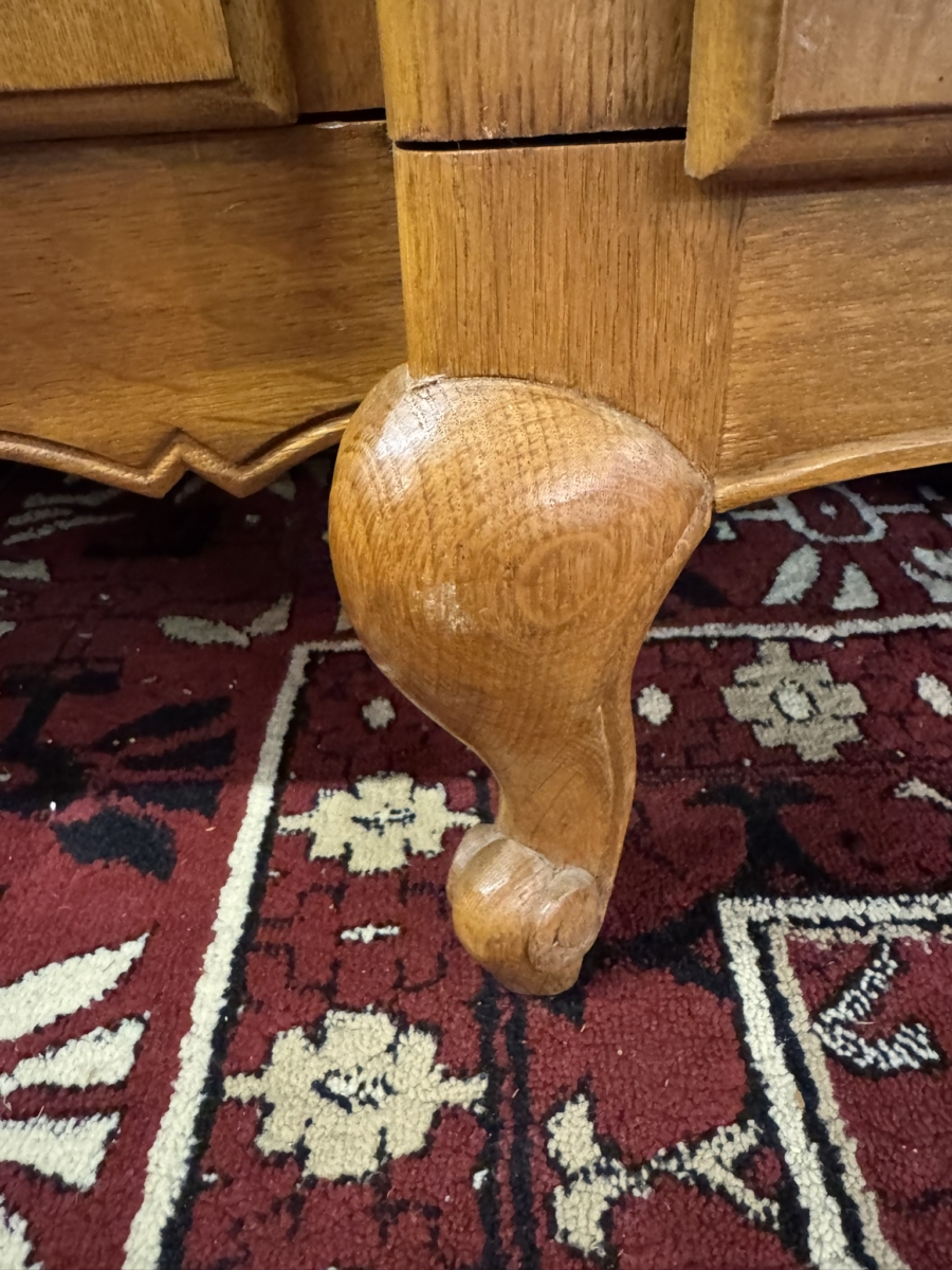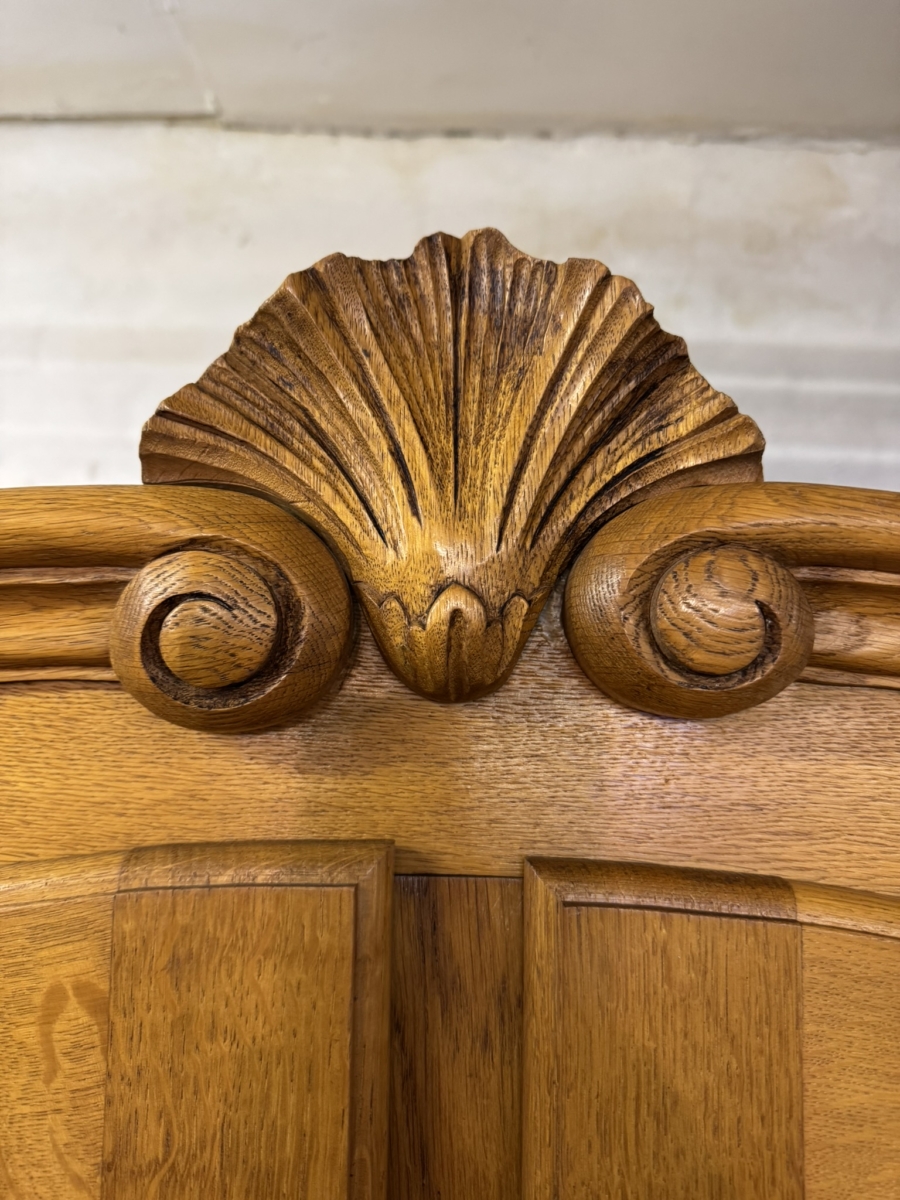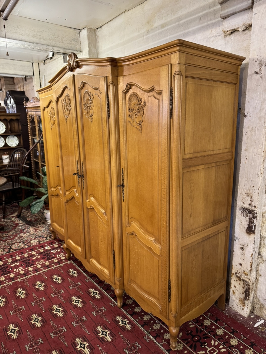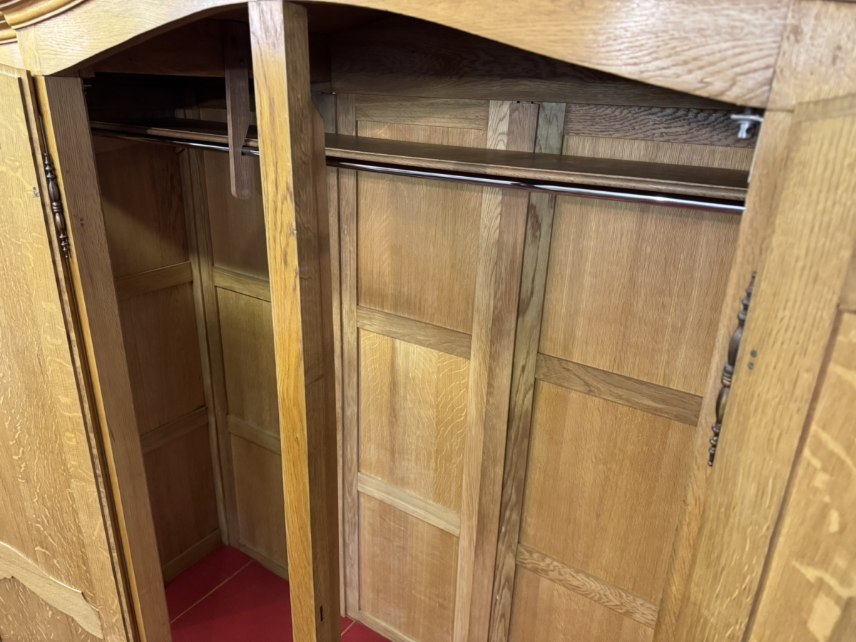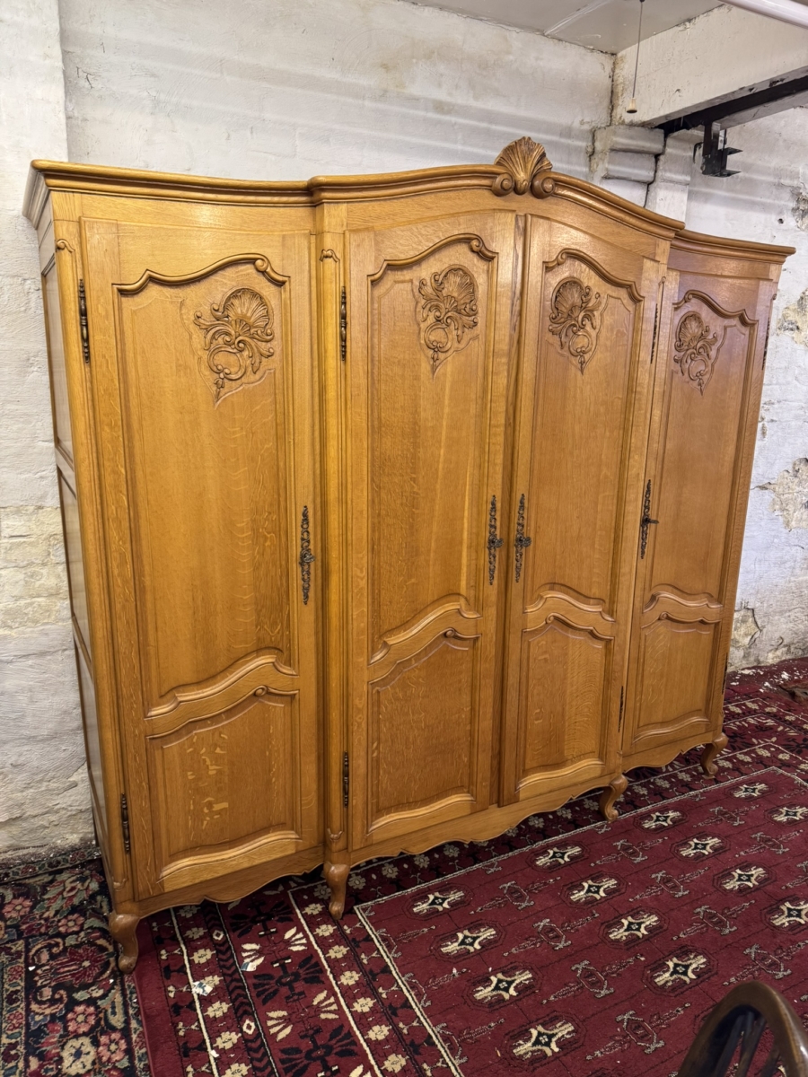 The shaped top rises to a decorative fan carving, below are four lockable carved recessed panelled doors, the central pair of doors are brake front in design. Each door has brass hinges brass escutcheon and key. The left-hand door and pair of central doors open to reveal a wooden shelf above a metal hanging rail. The right-hand door opens to reveal four removable shelves, one shelf having a drawer below. Fielded panelled sides, shaped skirt and standing on four cabriole shaped legs to the front. Please note this armoire completely splits down for easy transportation and delivery into any home.