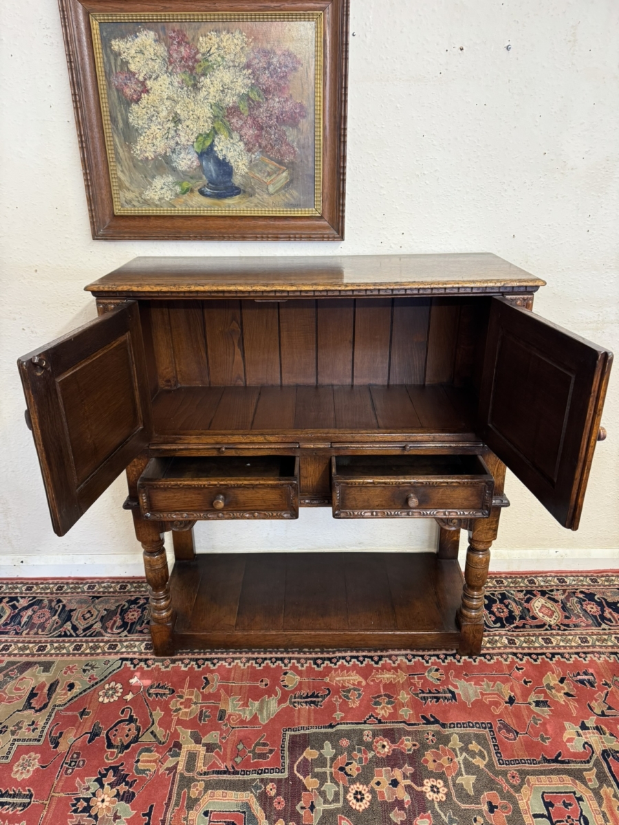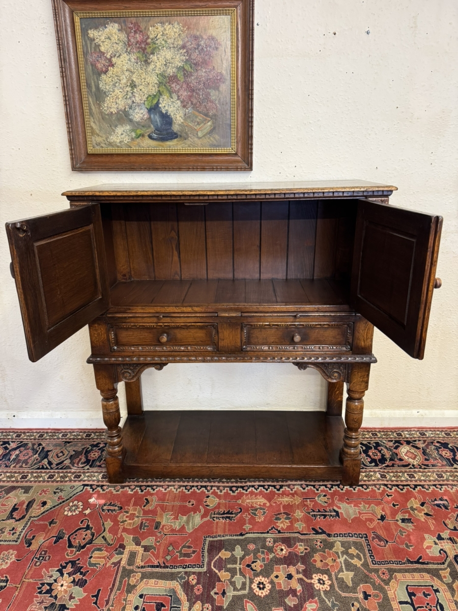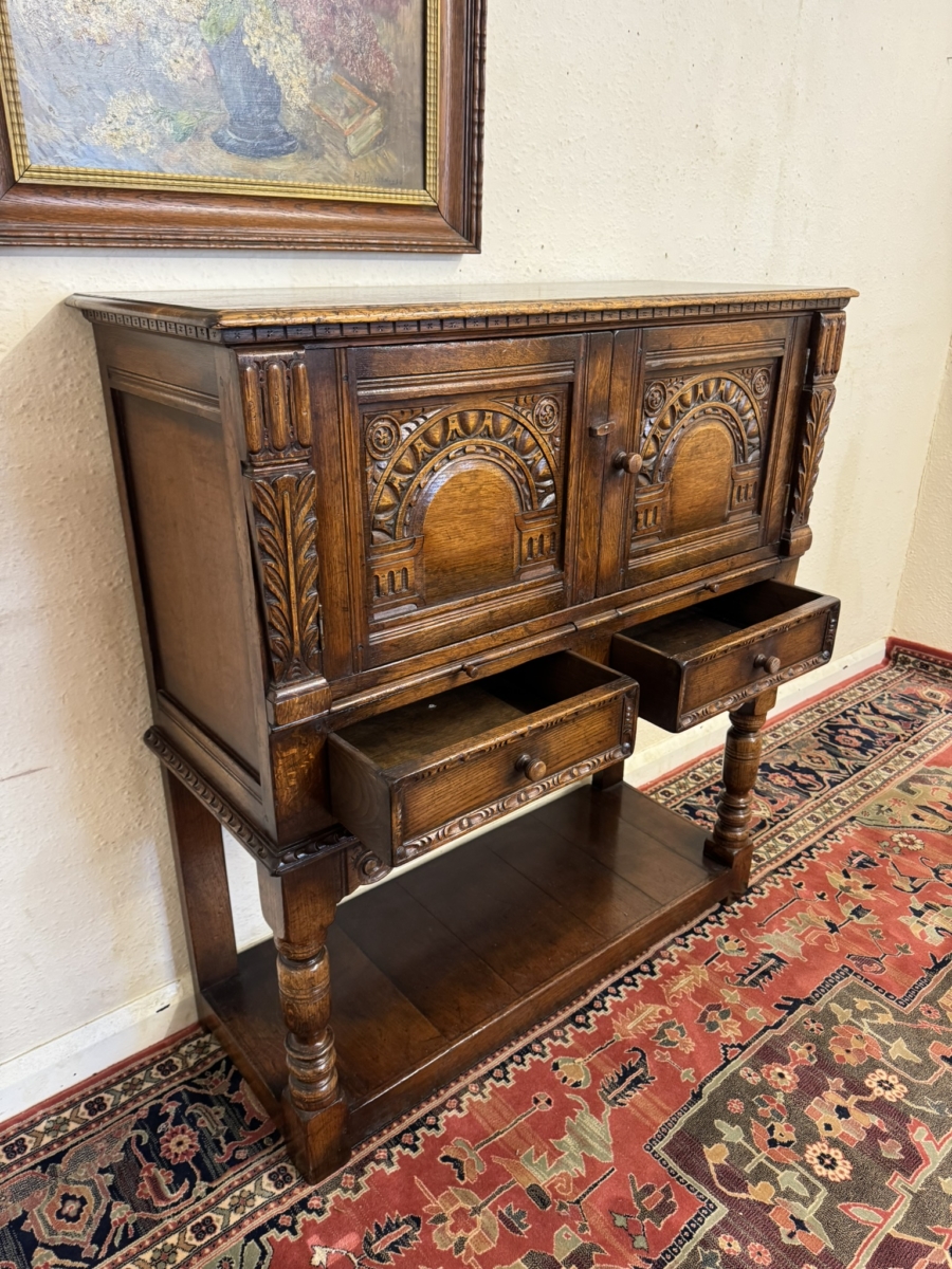 Made by the renowned Titchmarsh and Goodwin furniture makers and is in excellent condition. Grained oak through out. The over sailing top sits above a pair of lockable carved recessed panelled doors, the doors open to reveal a boarded back and base, below are two retractable serving slides, each with a turned handle. Two carved drawers with carvings and turn knob handle, carved skirt, standing on turned legs to the front, boarded shelf and standing on traditional block feet.