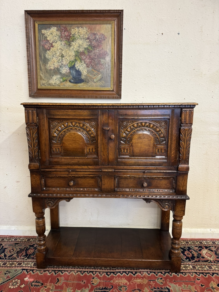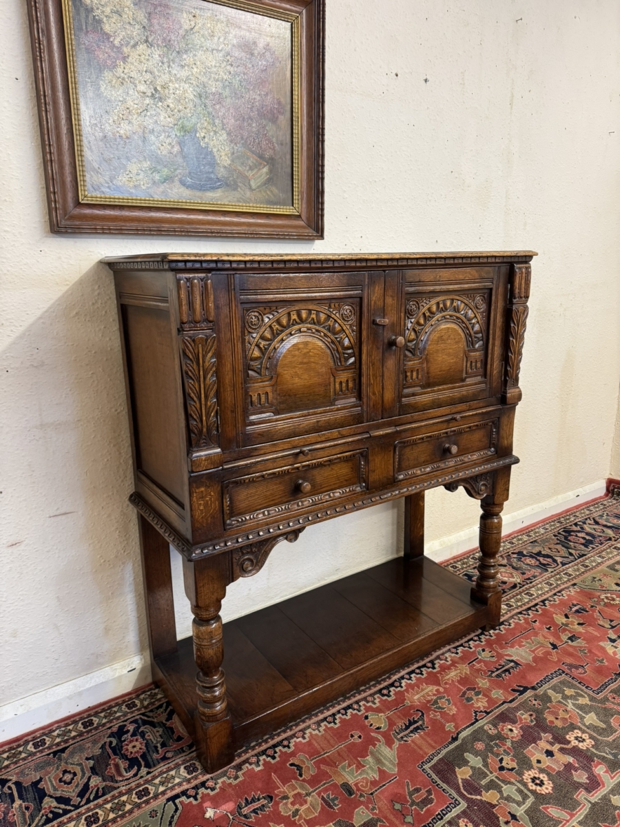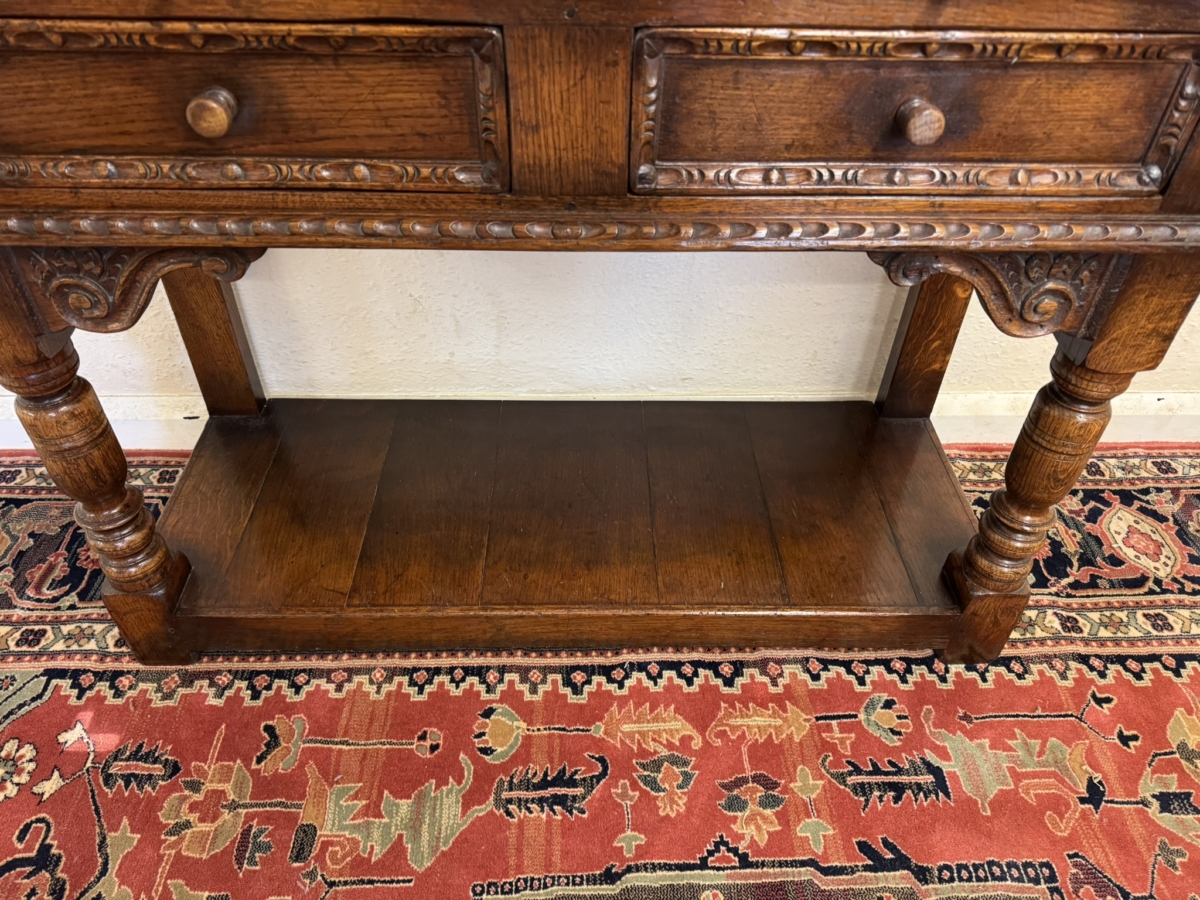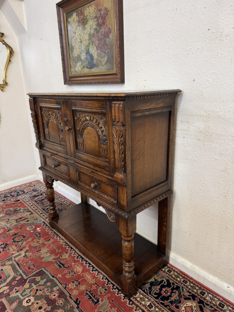 Made by the renowned Titchmarsh and Goodwin furniture makers and is in excellent condition. Grained oak through out. The over sailing top sits above a pair of lockable carved recessed panelled doors, the doors open to reveal a boarded back and base, below are two retractable serving slides, each with a turned handle. Two carved drawers with carvings and turn knob handle, carved skirt, standing on turned legs to the front, boarded shelf and standing on traditional block feet.
