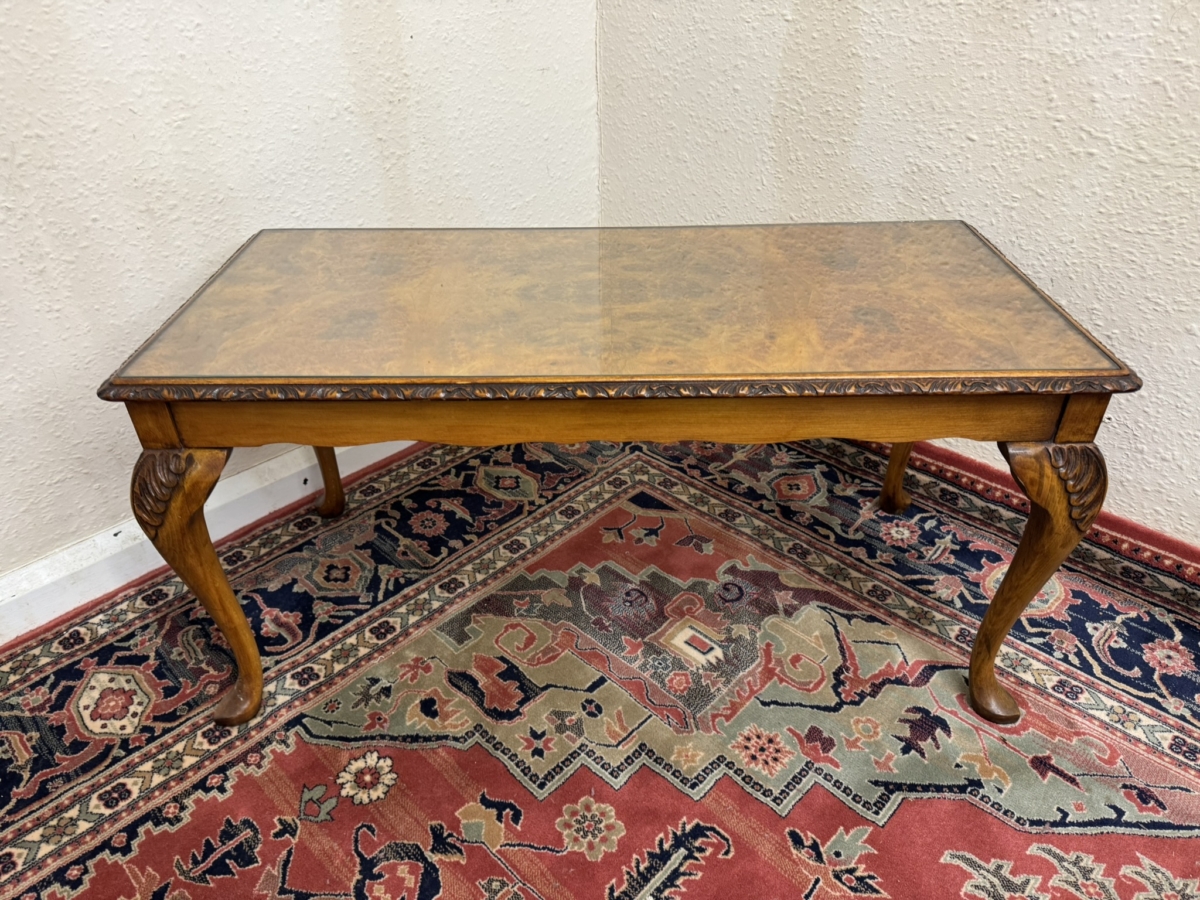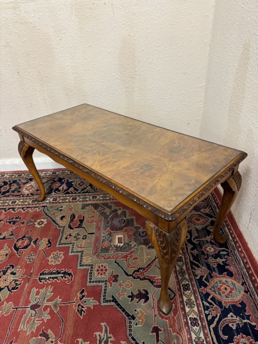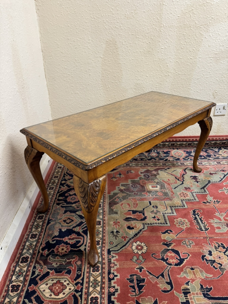 Made in striking walnut and in excellent condition. The walnut top has a glass protector with carvings to each side. Wavy apron and standing on four carved cabriole shaped legs.