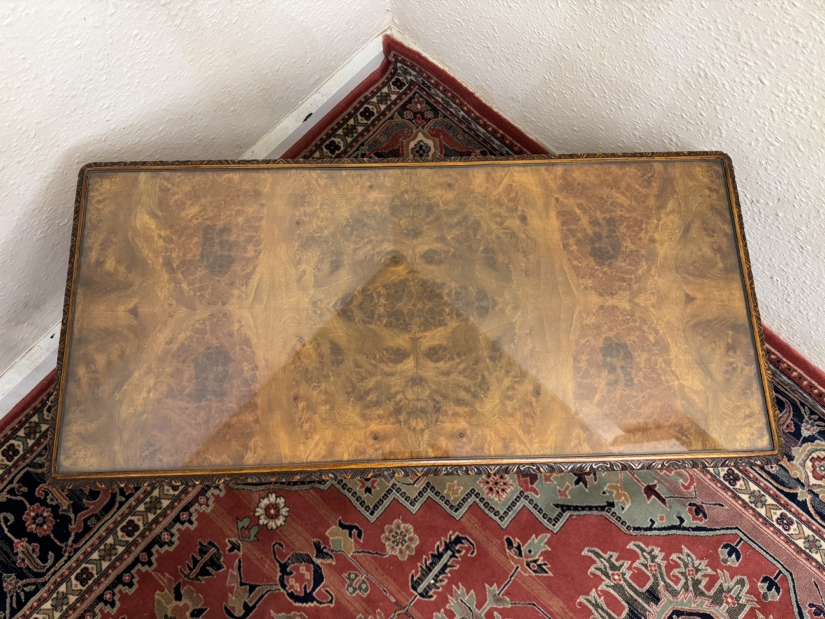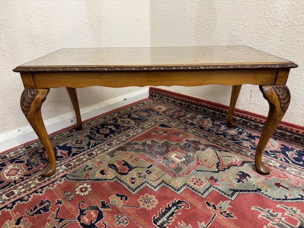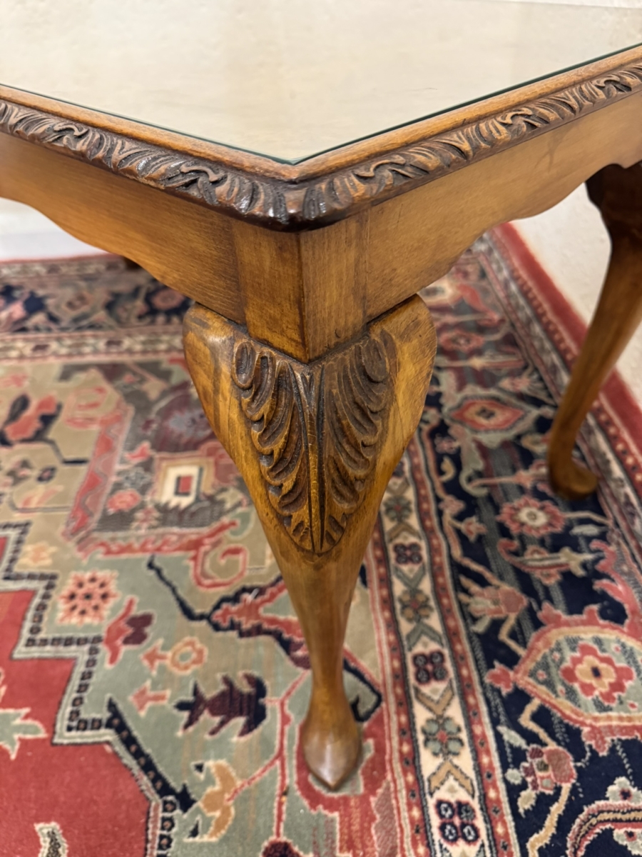 Made in striking walnut and in excellent condition. The walnut top has a glass protector with carvings to each side. Wavy apron and standing on four carved cabriole shaped legs.