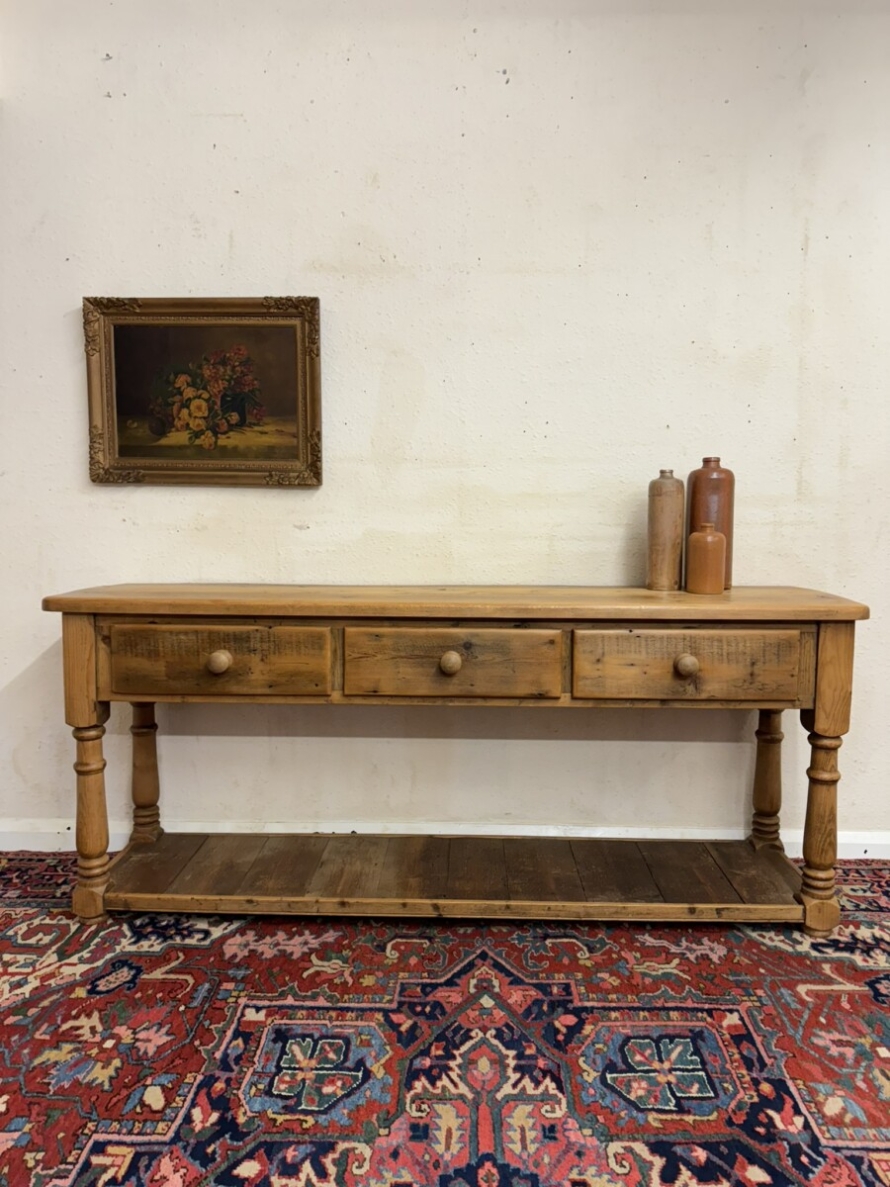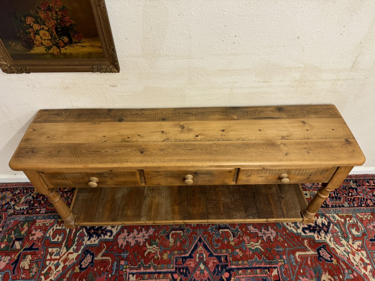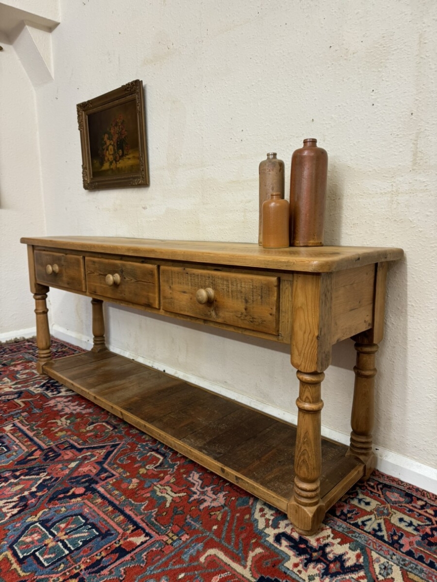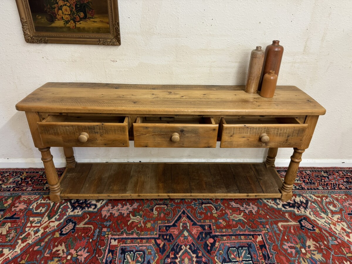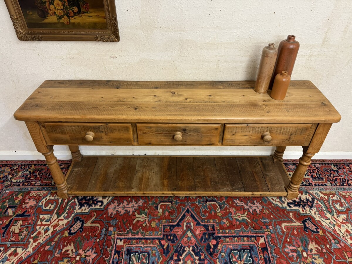 The thick three plank top sits above three drawers, each drawer having a turned knob handle. Four turned legs, pot board shelf and standing on four turned feet.