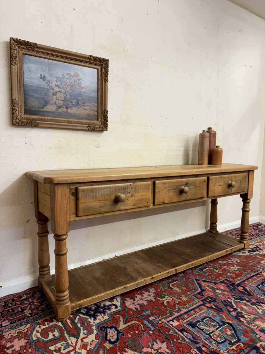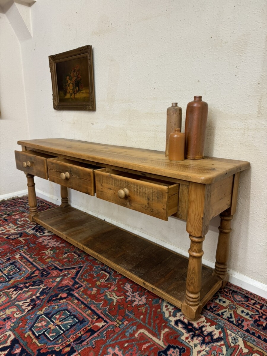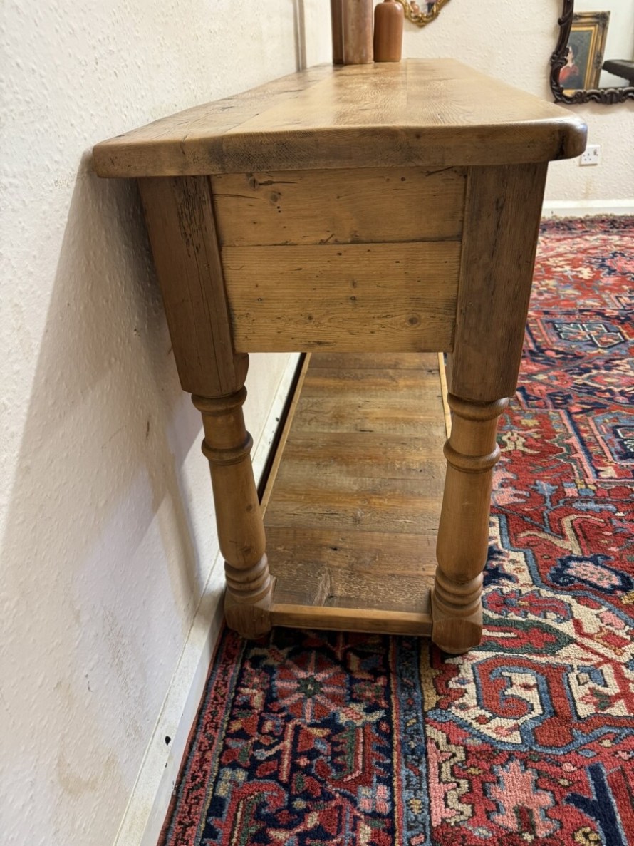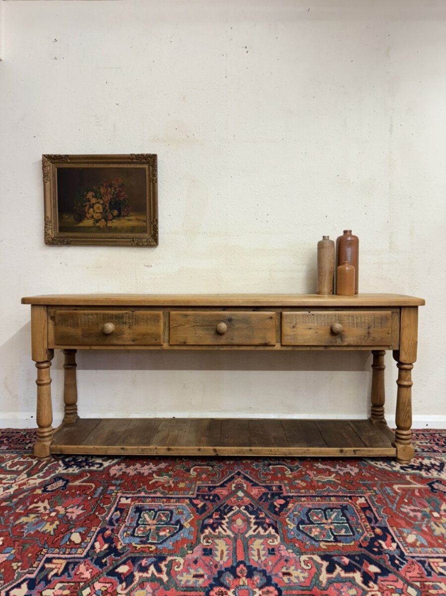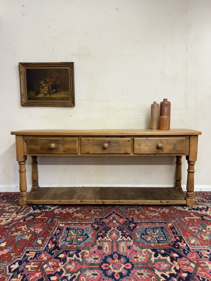 The thick three plank top sits above three drawers, each drawer having a turned knob handle. Four turned legs, pot board shelf and standing on four turned feet.