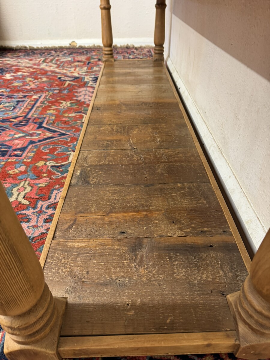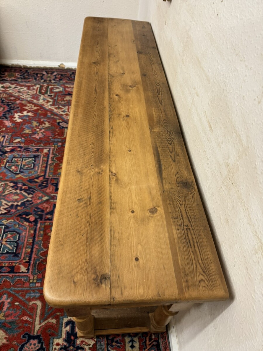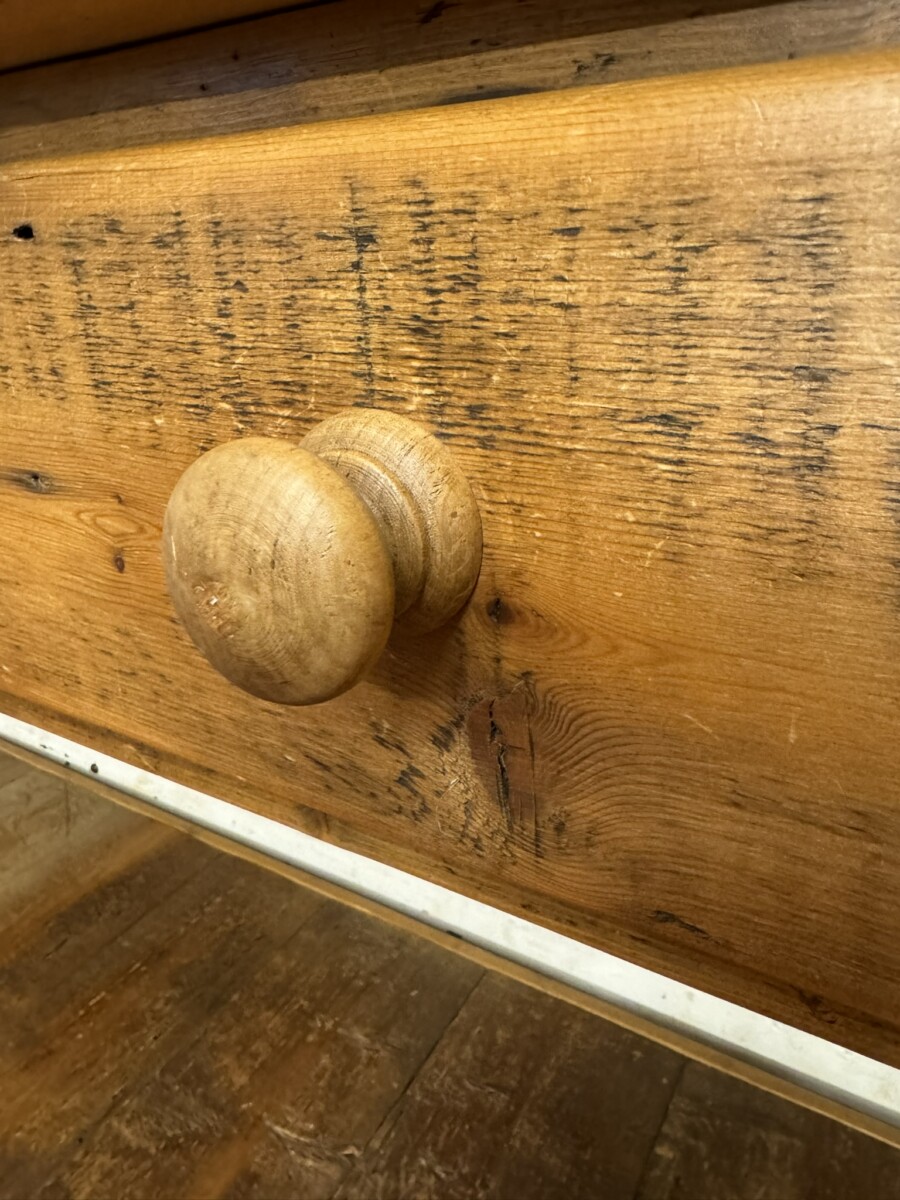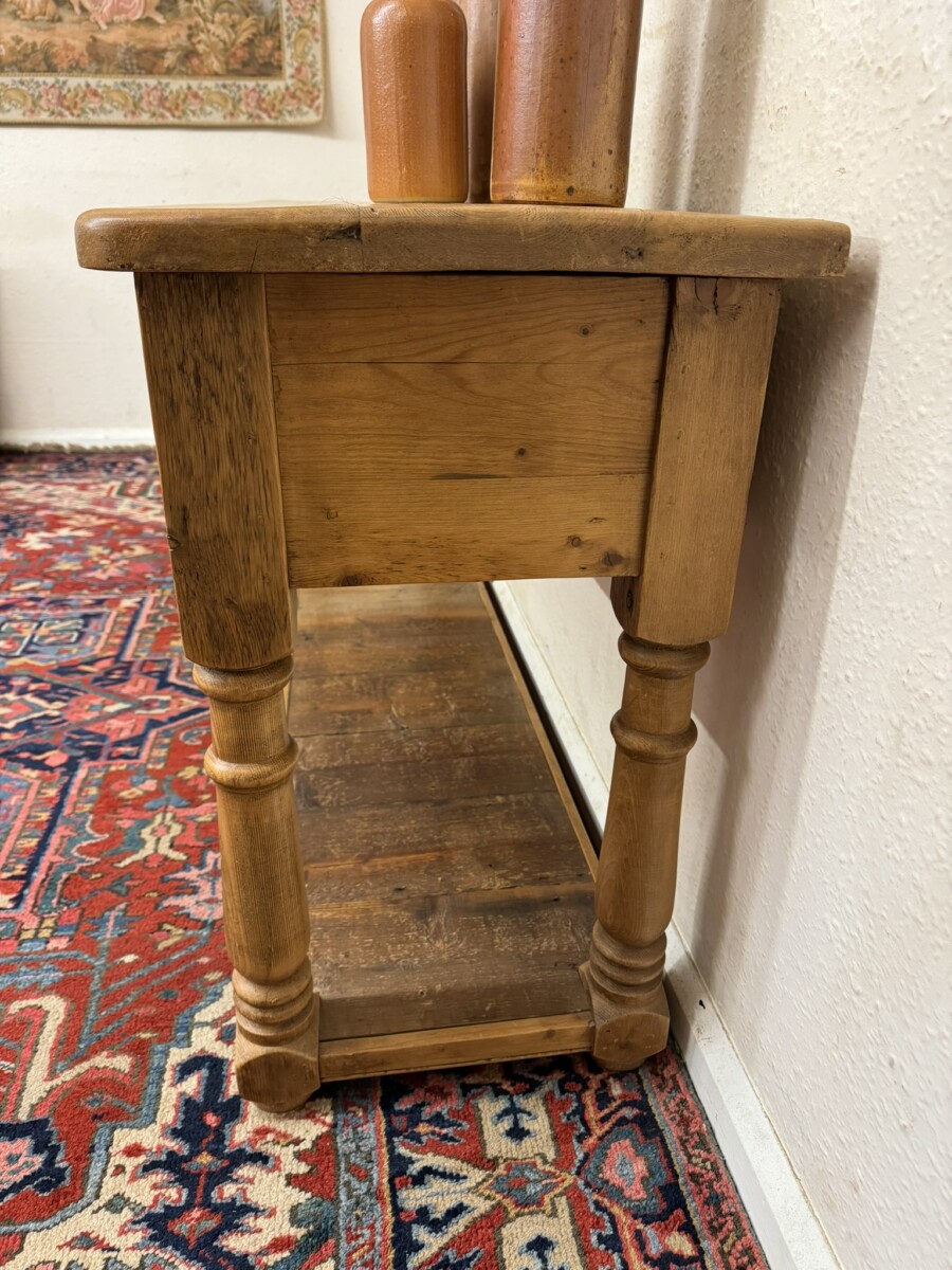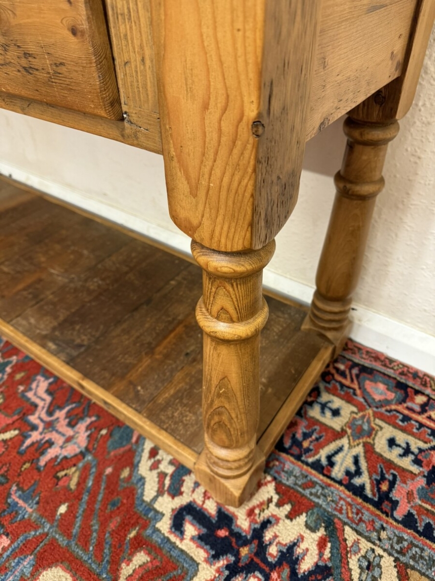 The thick three plank top sits above three drawers, each drawer having a turned knob handle. Four turned legs, pot board shelf and standing on four turned feet.