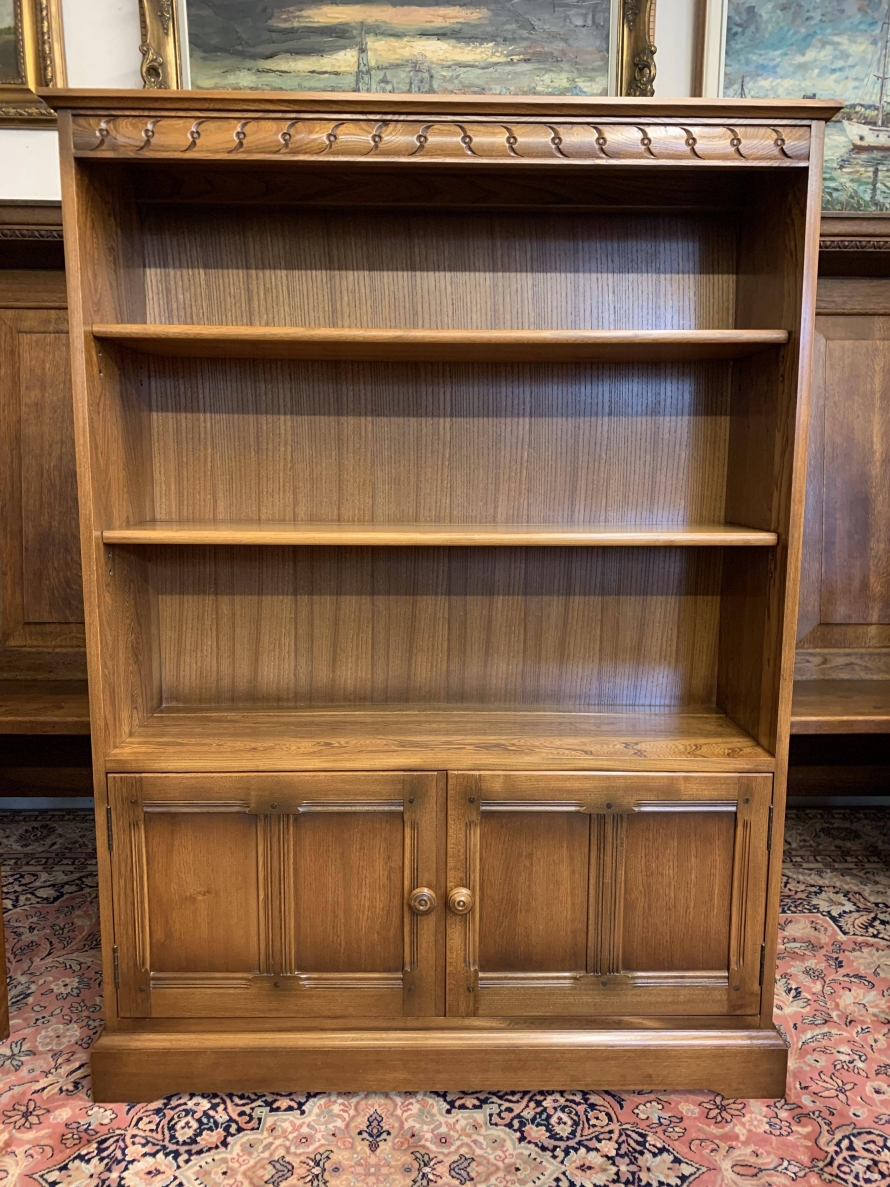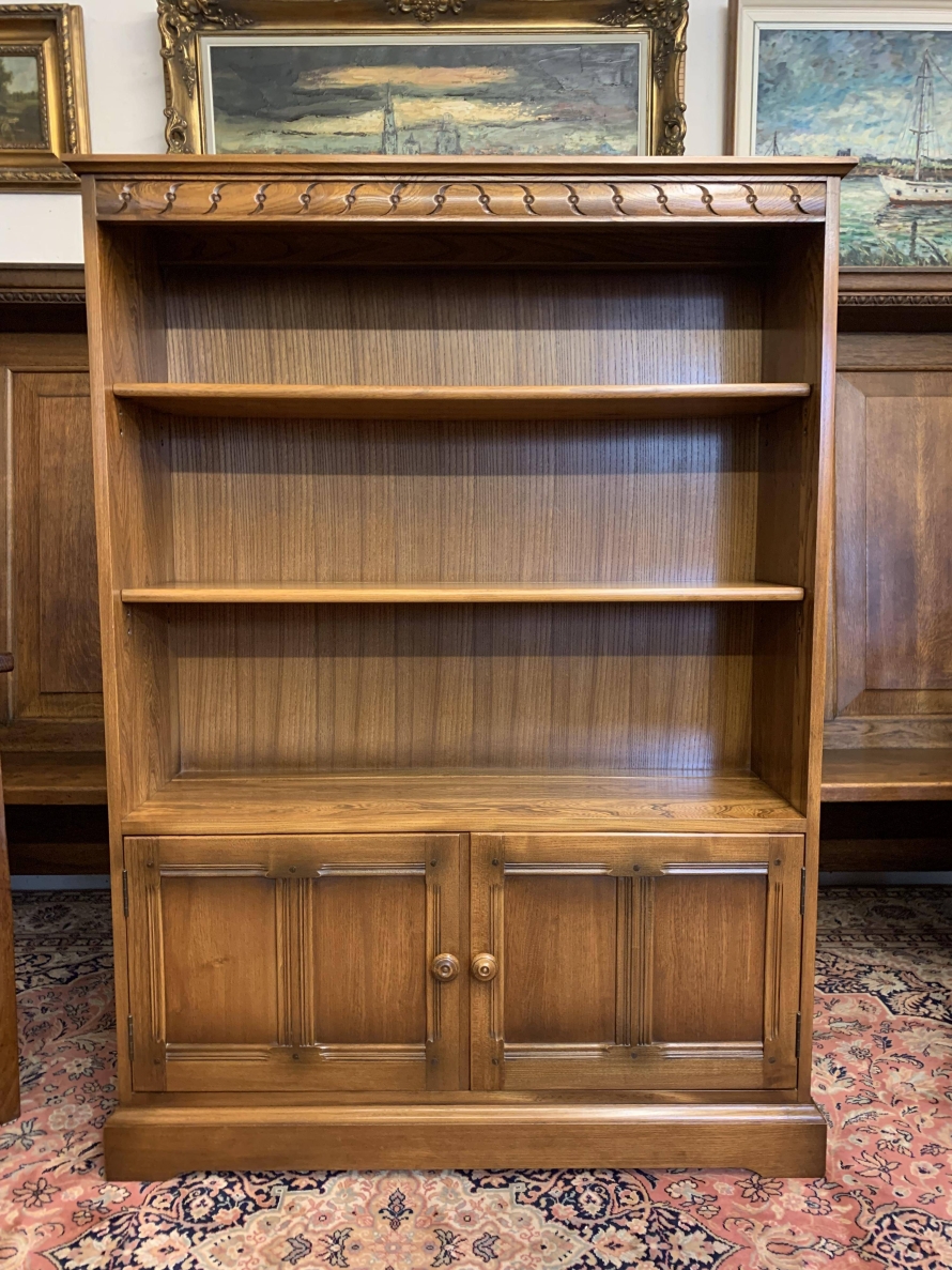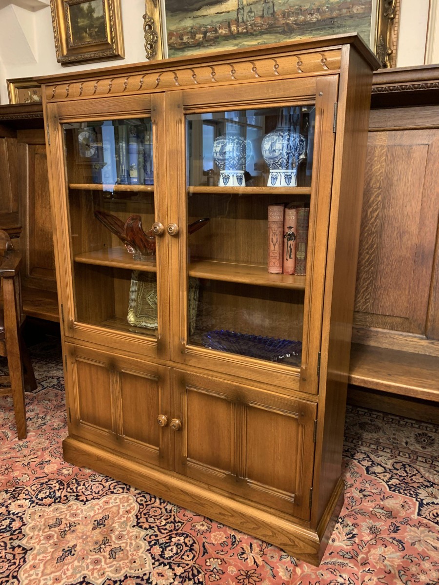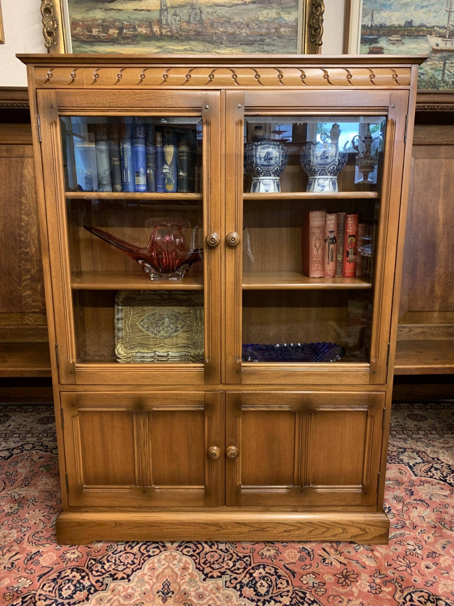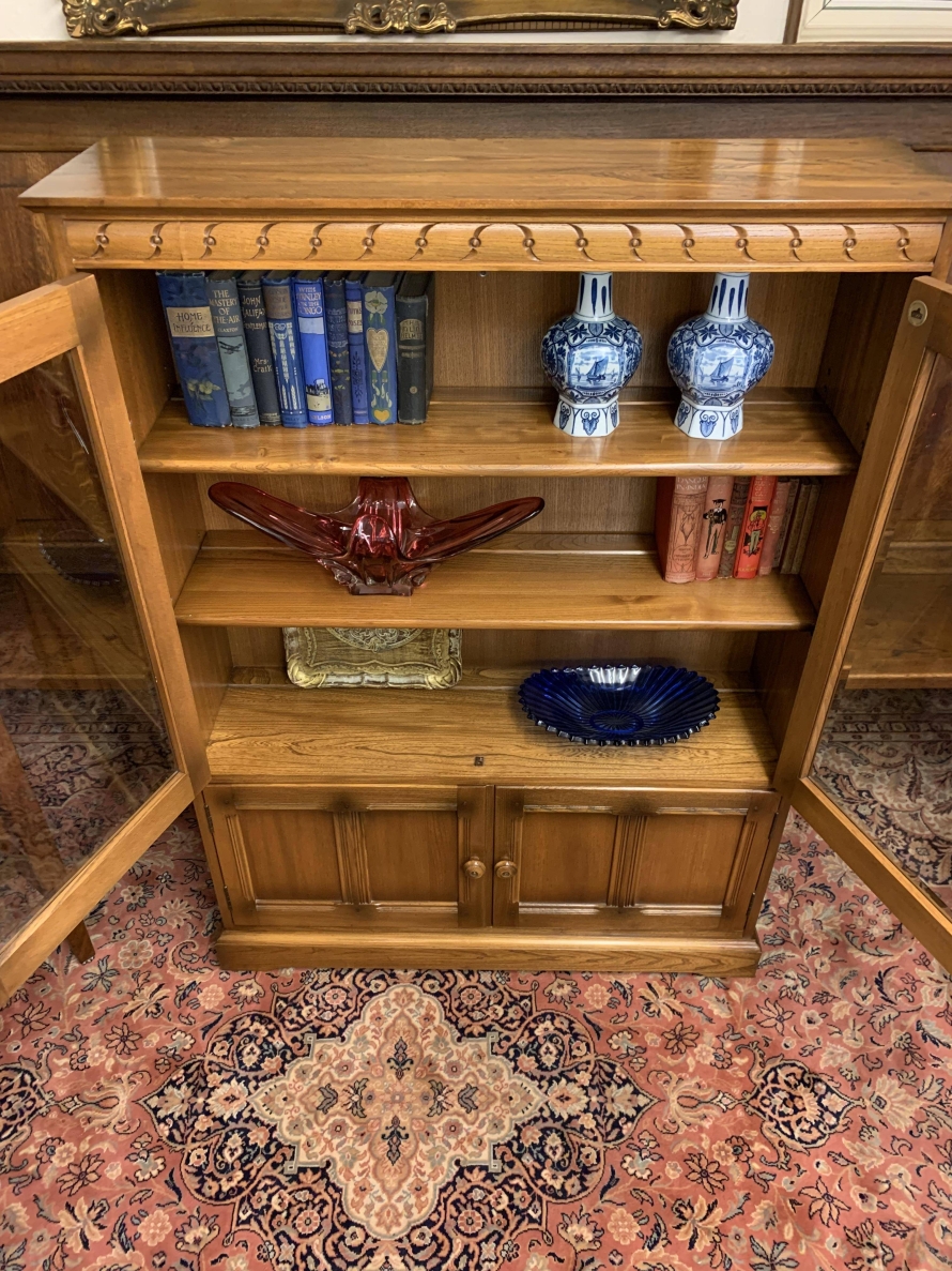 Made by the renowned Ercol furniture company in a Golden Dawn finish, this bookcase is in excellent condition. The oversailing top has a carved frieze below. Having to lockable bevel edged glazed doors, each door having turned knob handle and locking latch. The doors open to reveal two adjustable and removable shelves. Below are a pair of recessed panelled lockable doors, each door having turned knob handle and locking latch. This fabulous bookcase stands on a plinth base.