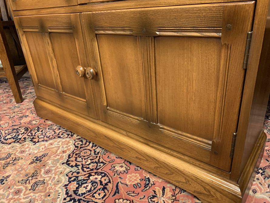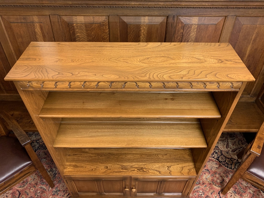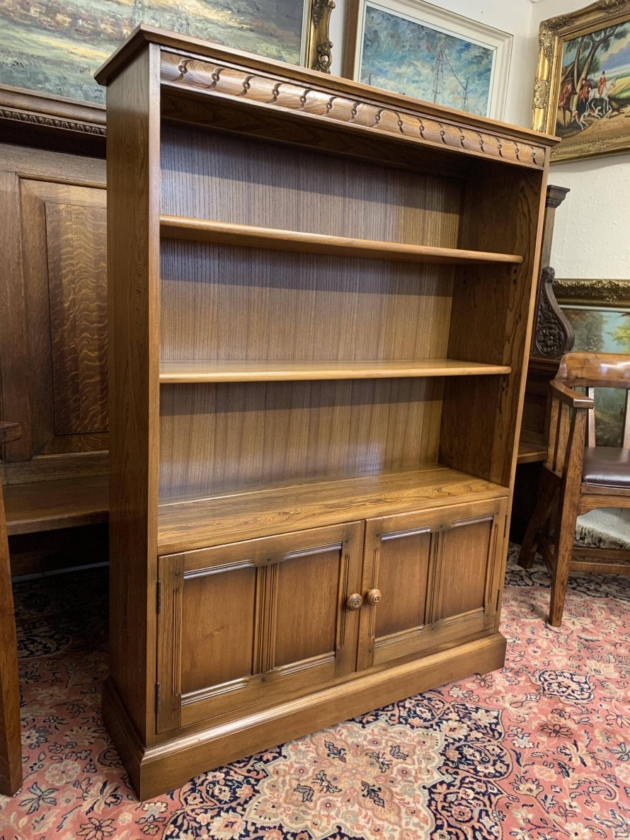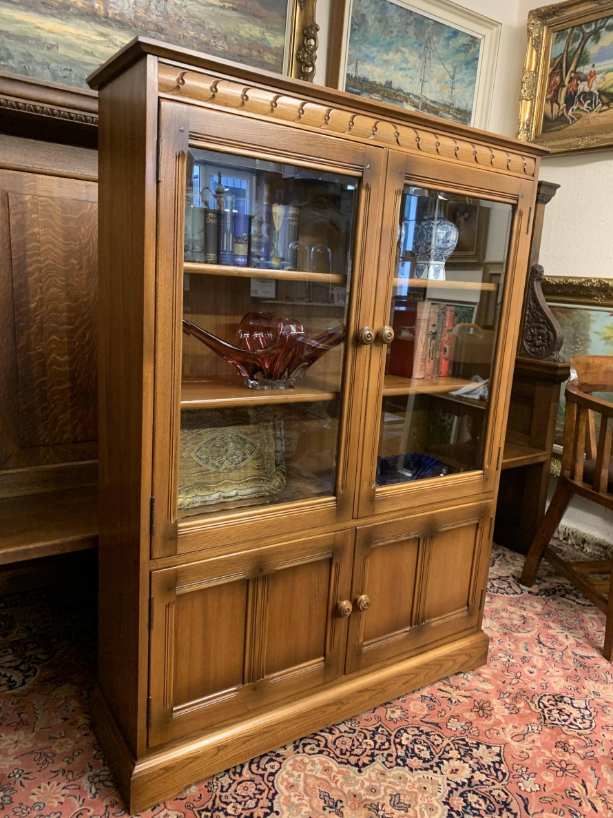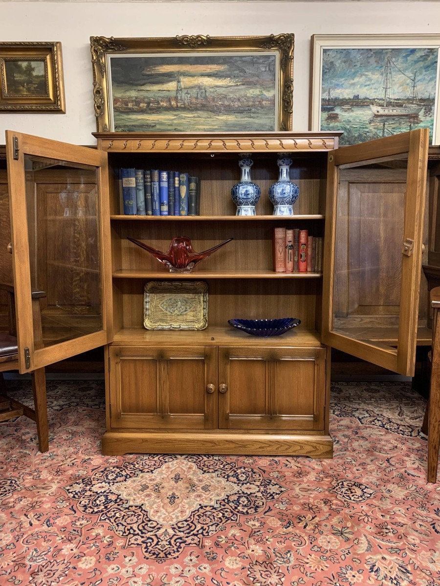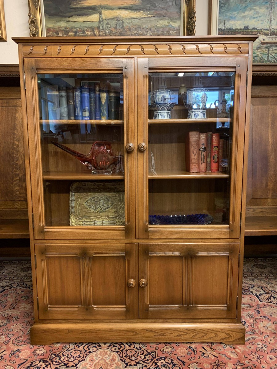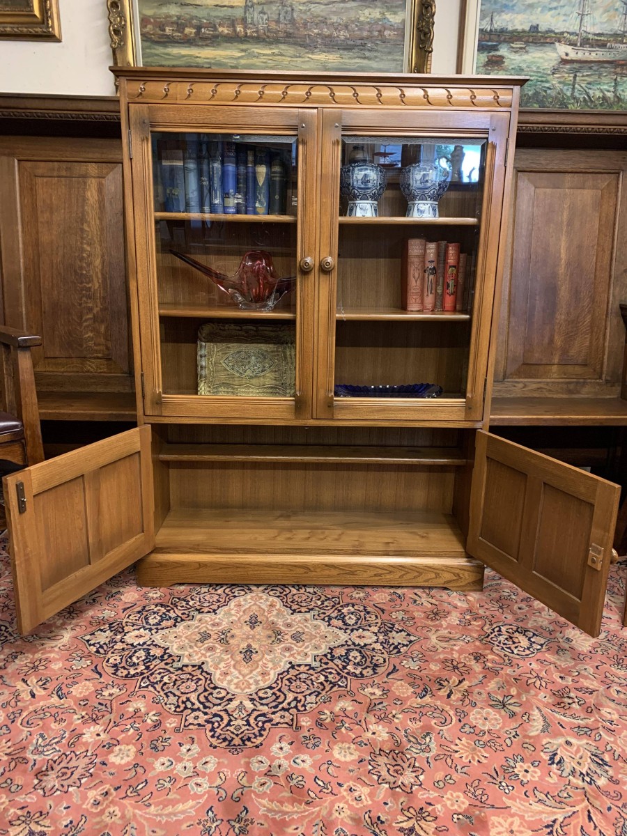 Made by the renowned Ercol furniture company in a Golden Dawn finish, this bookcase is in excellent condition. The oversailing top has a carved frieze below. Having to lockable bevel edged glazed doors, each door having turned knob handle and locking latch. The doors open to reveal two adjustable and removable shelves. Below are a pair of recessed panelled lockable doors, each door having turned knob handle and locking latch. This fabulous bookcase stands on a plinth base.