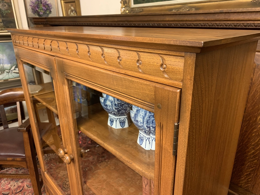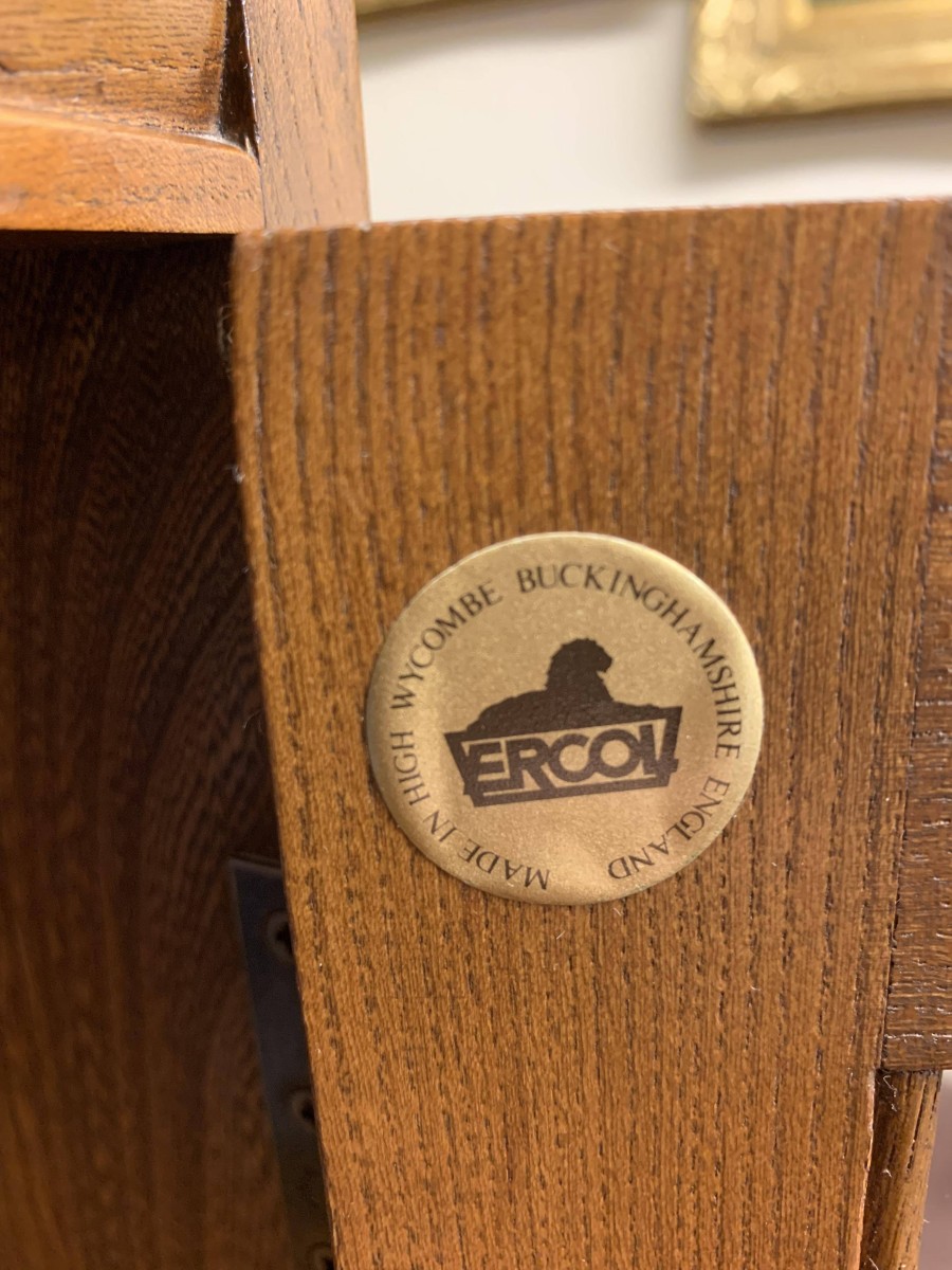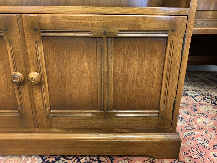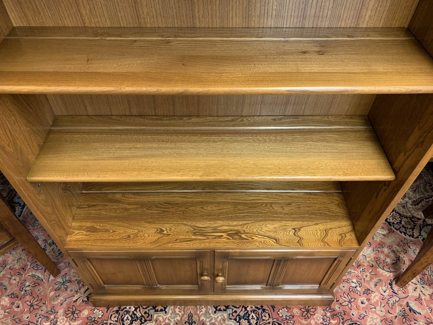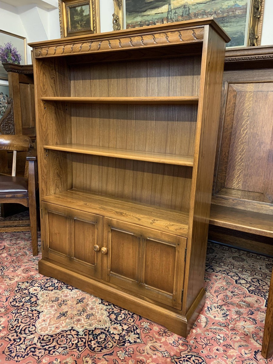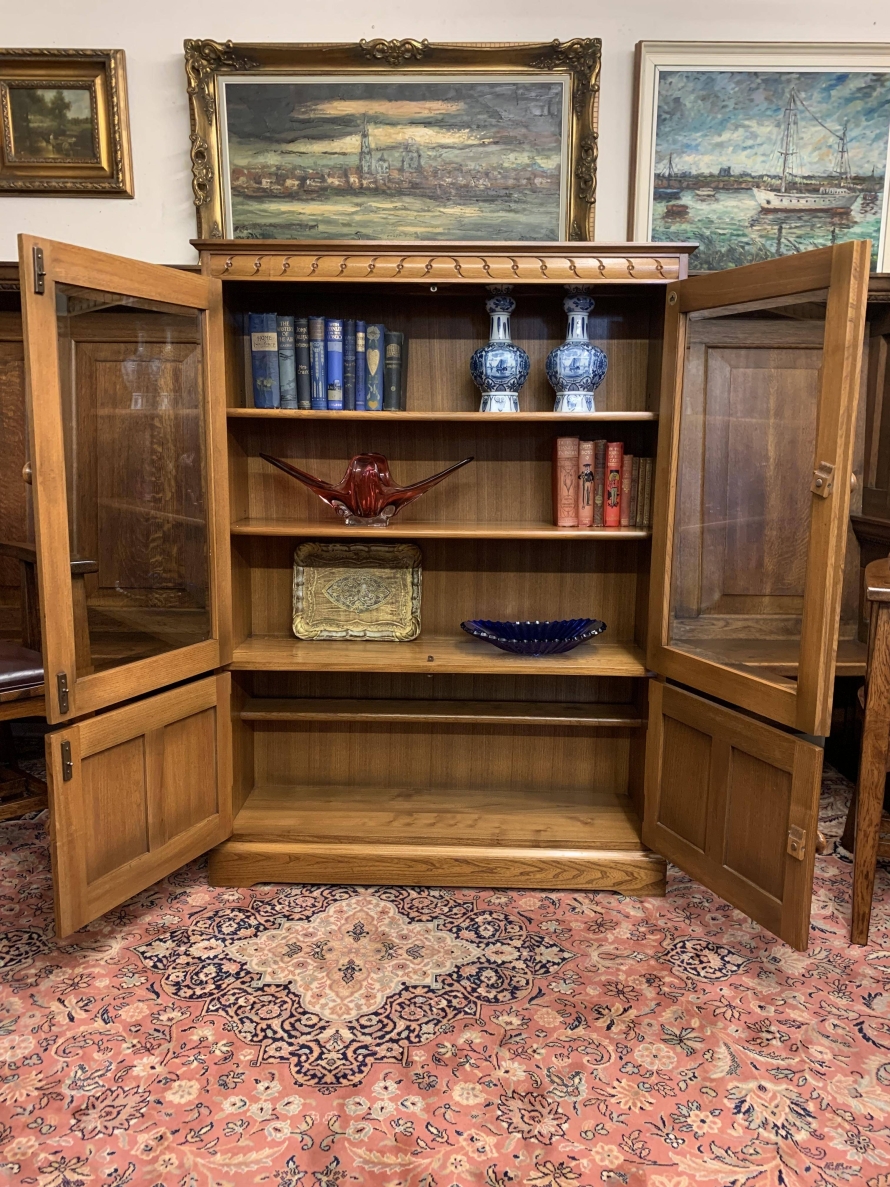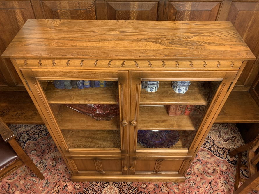 Made by the renowned Ercol furniture company in a Golden Dawn finish, this bookcase is in excellent condition. The oversailing top has a carved frieze below. Having to lockable bevel edged glazed doors, each door having turned knob handle and locking latch. The doors open to reveal two adjustable and removable shelves. Below are a pair of recessed panelled lockable doors, each door having turned knob handle and locking latch. This fabulous bookcase stands on a plinth base.