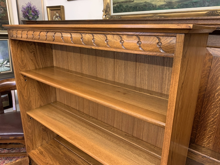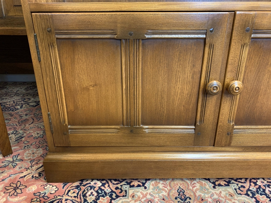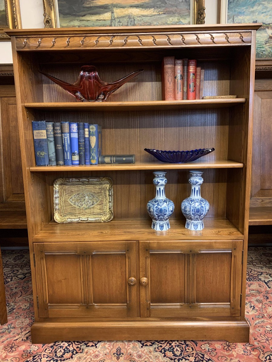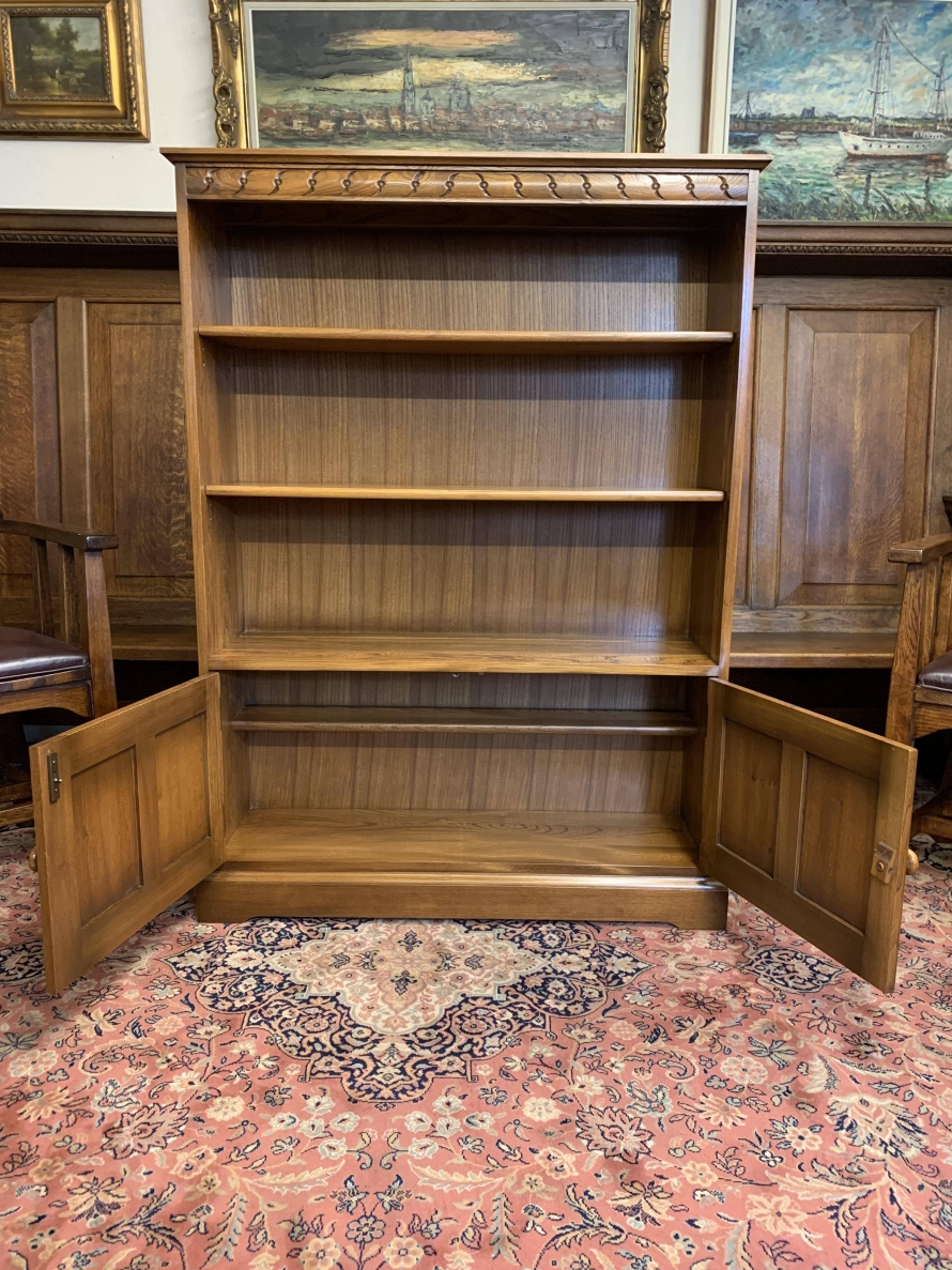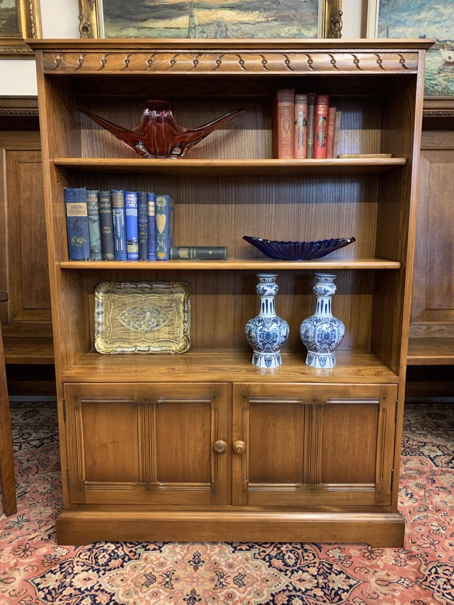 Made by the renowned Ercol furniture company in their Golden Dawn finish this bookcase is in excellent condition. The oversailing top has a carved frieze below. The open section has two adjustable and removable shelves. Below are a pair of lockable recessed panelled cupboard doors, each door having turned knob handle and locking latch. The doors open to reveal a removable shelf. This fabulous bookcase stands on a plinth base.