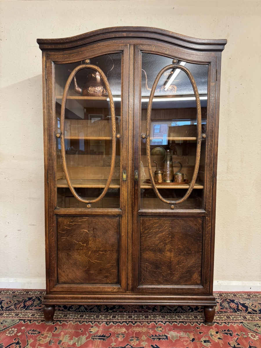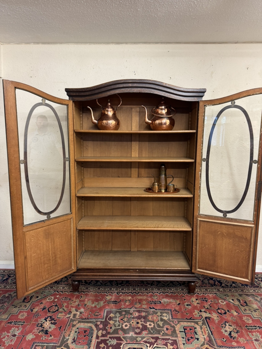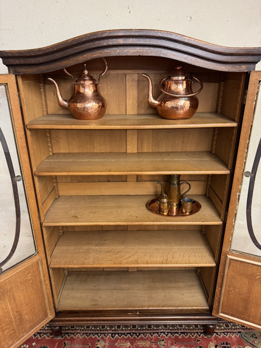 This fabulous bookcase dates circa 1920. The curved over sailing top sits above a pair of lockable doors, each door having a top glazed section with a quartered panel below. The doors open to reveal four adjustable and removable shelves. Recessed panelled sides and standing on two turned feet to the front.