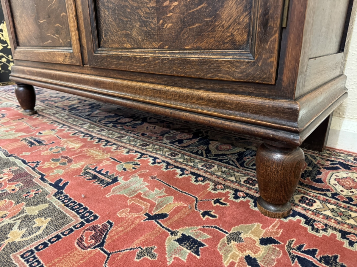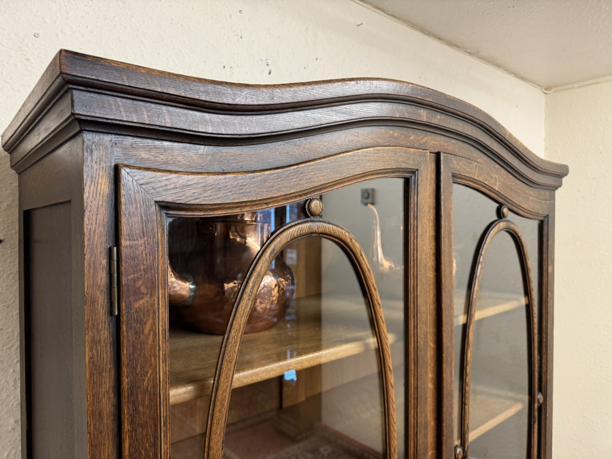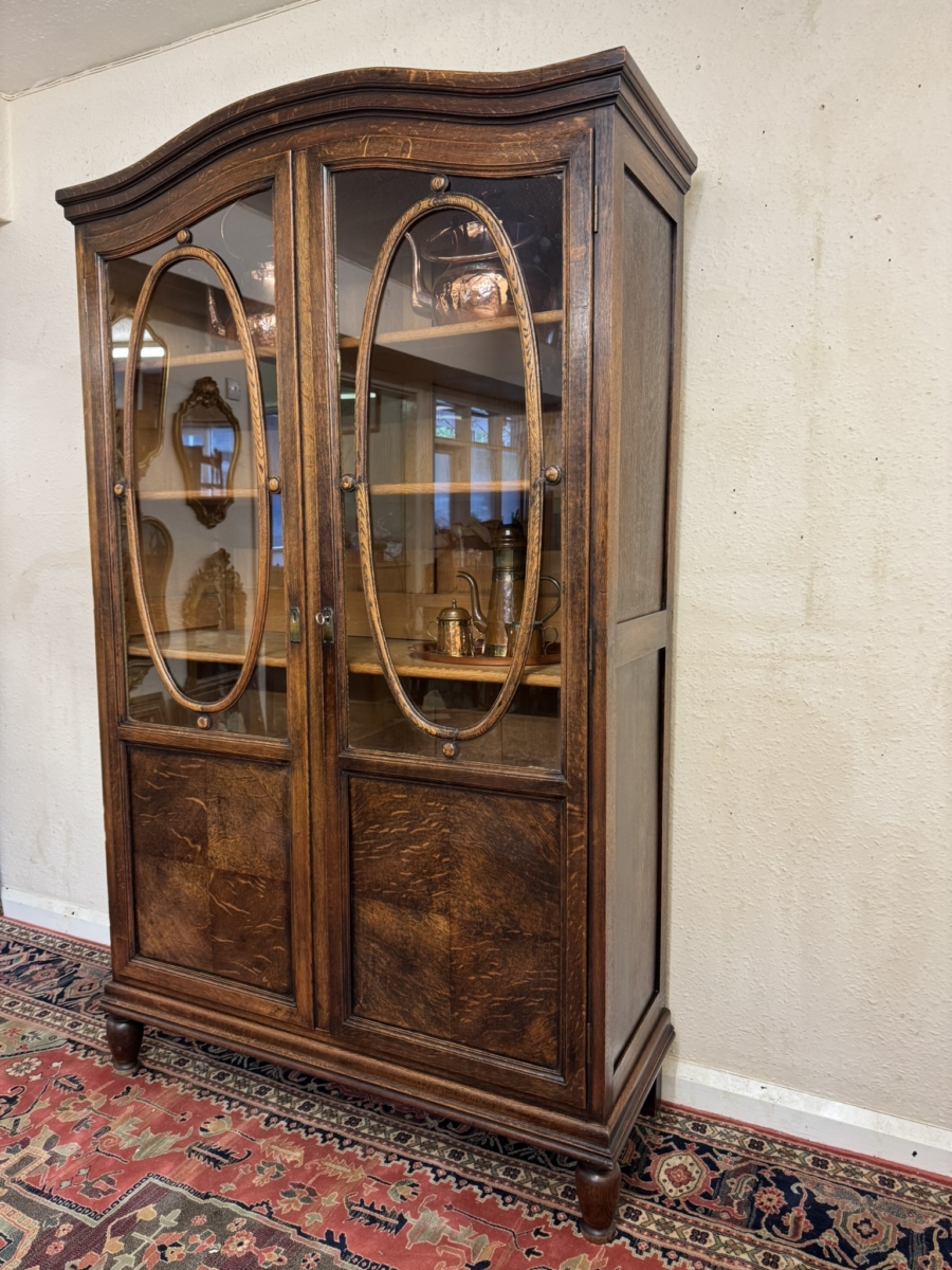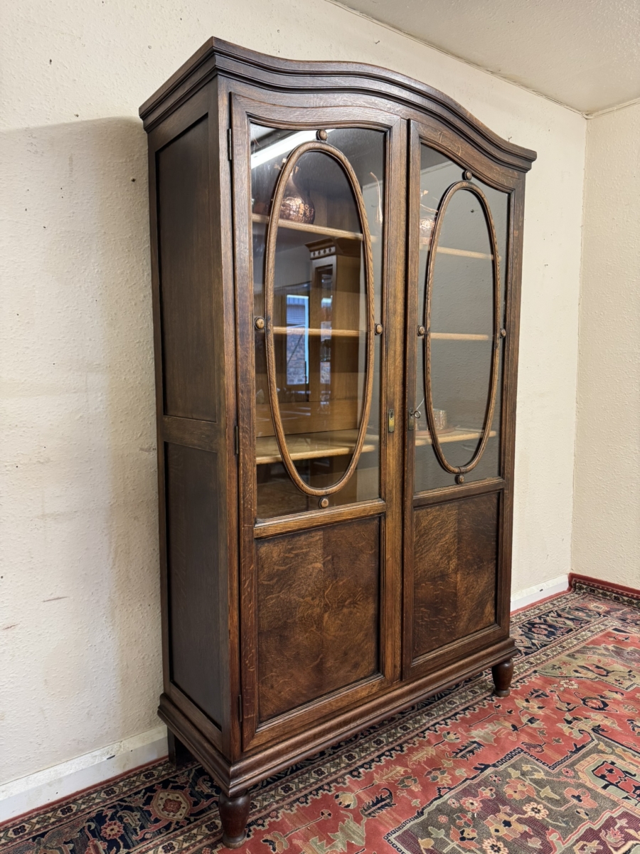 This fabulous bookcase dates circa 1920. The curved over sailing top sits above a pair of lockable doors, each door having a top glazed section with a quartered panel below. The doors open to reveal four adjustable and removable shelves. Recessed panelled sides and standing on two turned feet to the front.