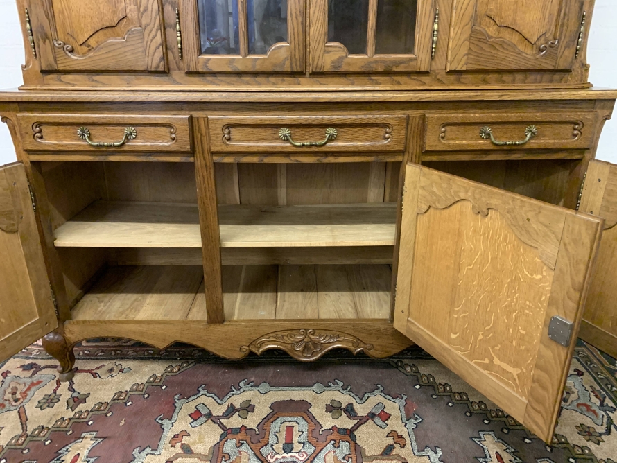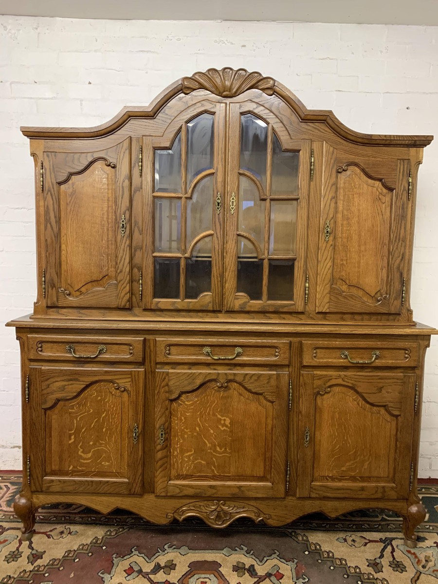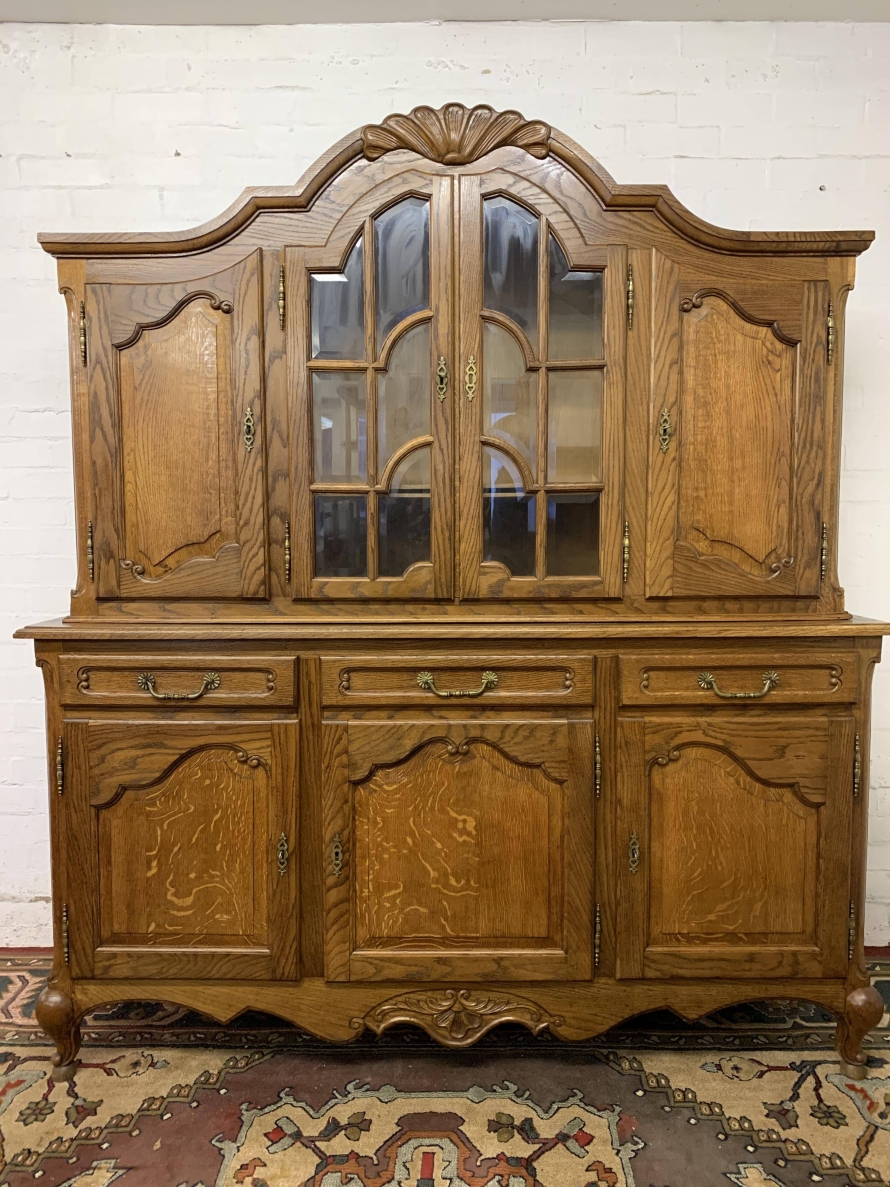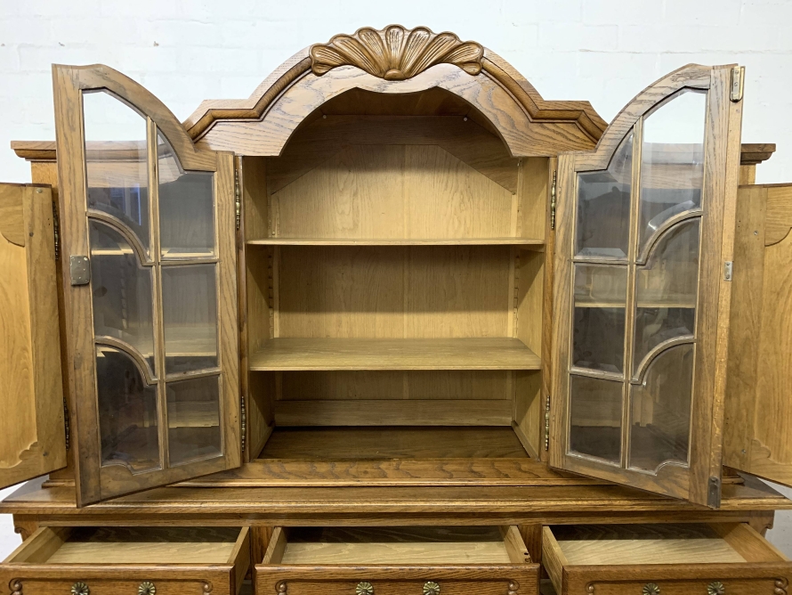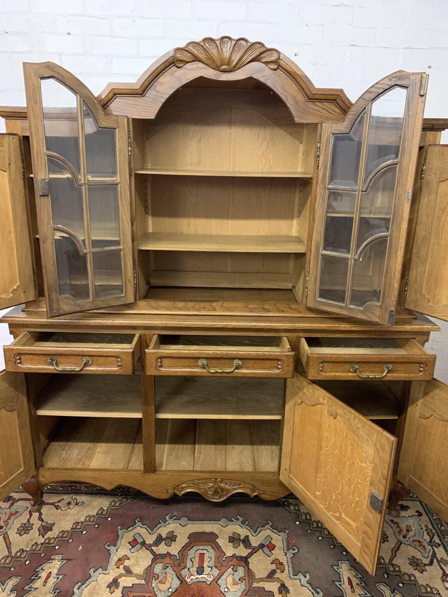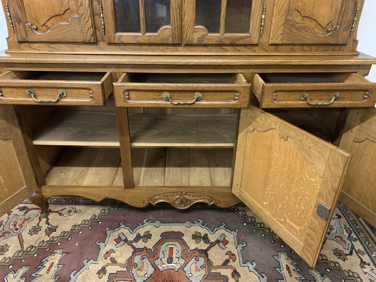 The shaped top rises to a central decorative carving. Below are a pair of central glazed lockable doors, each door having decorative hinges brass escutcheon and bevelled glass. The doors open to reveal two adjustable and removable shelves. The glazed doors are flanked by a pair of shaped recess panelled lockable doors, brass hinges and decorative escutcheons. The left-hand door opens to reveal two adjustable and removable shelves, the right-hand door opening to reveal one adjustable and removable shelf. The bottom section consists of three good size drawers, each drawer having an ornate brass handle. Below are three recessed panelled lockable cupboard doors. The doors open to reveal a removable shelf and offer ample storage. Recessed panelled sides, shaped skirt with ornate central carving, this fantastic item stands on two carved cabriole legs to the front. Please note this item is an excellent condition