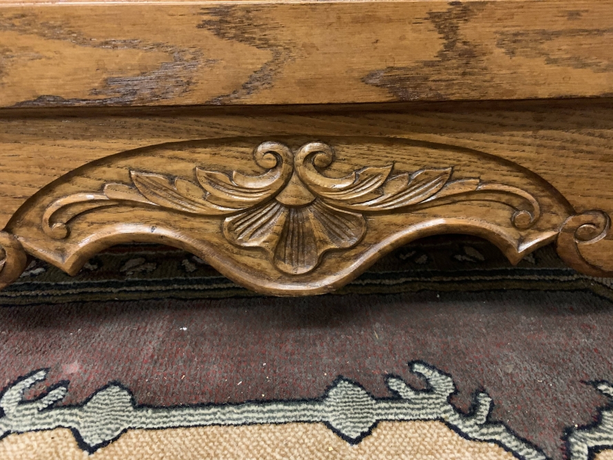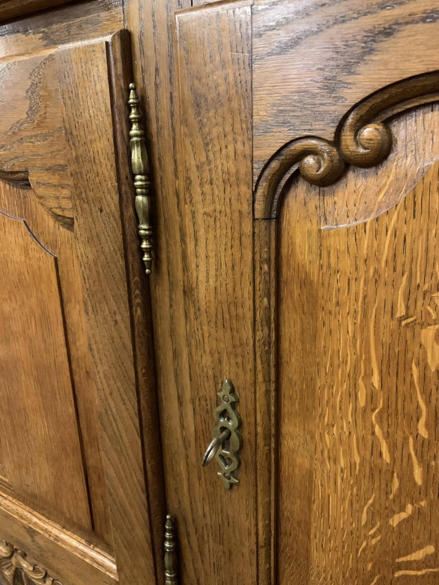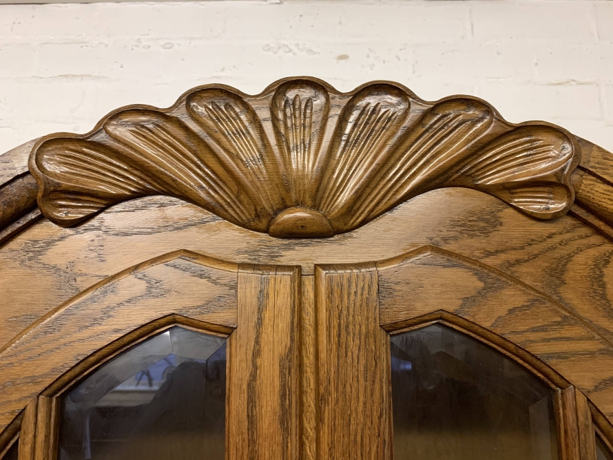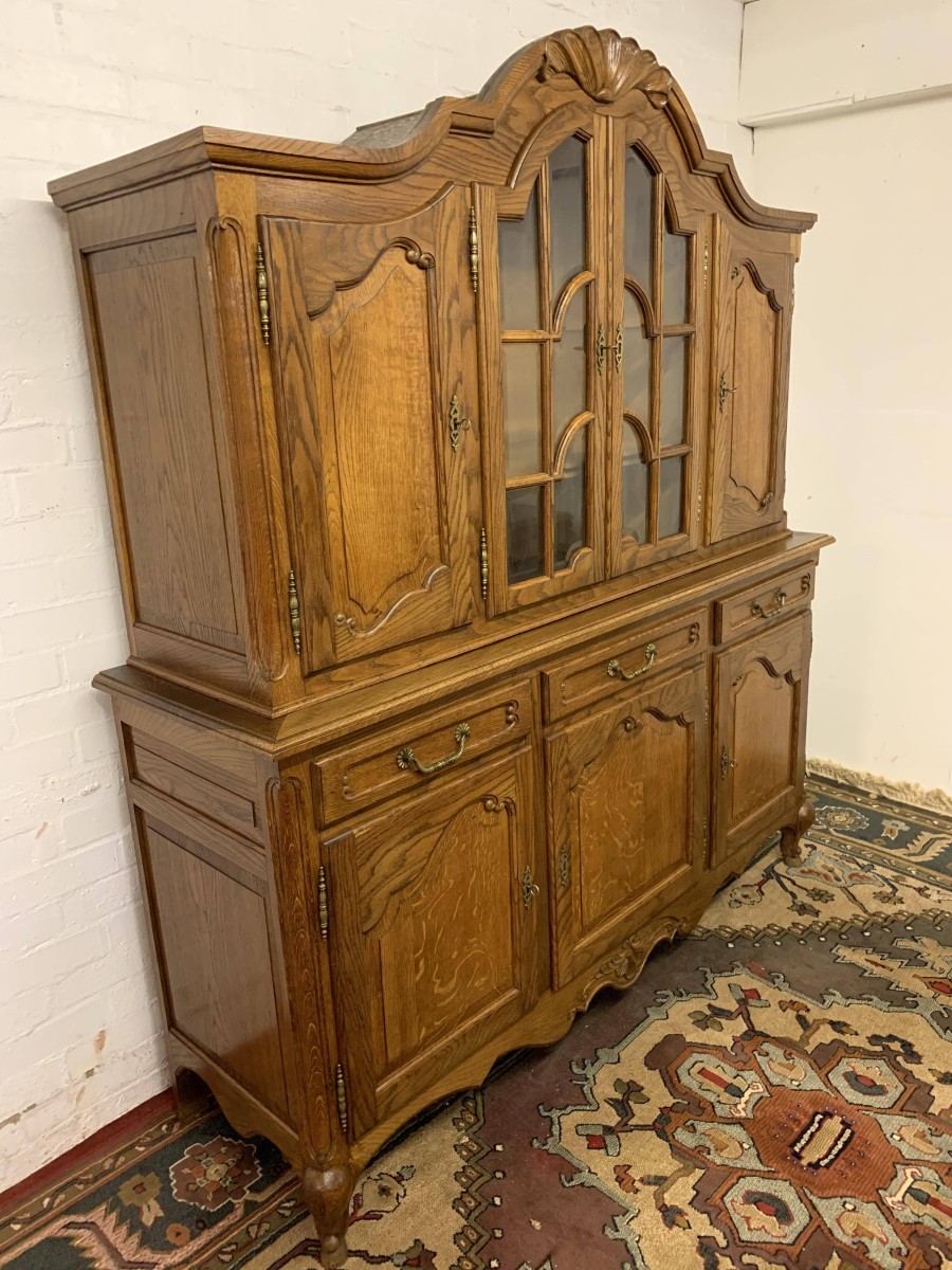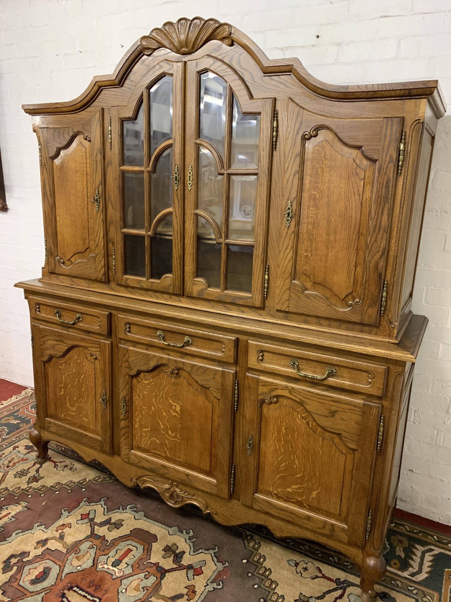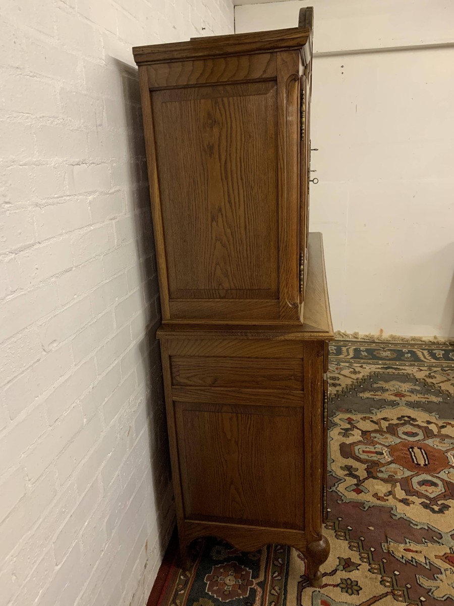 The shaped top rises to a central decorative carving. Below are a pair of central glazed lockable doors, each door having decorative hinges brass escutcheon and bevelled glass. The doors open to reveal two adjustable and removable shelves. The glazed doors are flanked by a pair of shaped recess panelled lockable doors, brass hinges and decorative escutcheons. The left-hand door opens to reveal two adjustable and removable shelves, the right-hand door opening to reveal one adjustable and removable shelf. The bottom section consists of three good size drawers, each drawer having an ornate brass handle. Below are three recessed panelled lockable cupboard doors. The doors open to reveal a removable shelf and offer ample storage. Recessed panelled sides, shaped skirt with ornate central carving, this fantastic item stands on two carved cabriole legs to the front. Please note this item is an excellent condition
