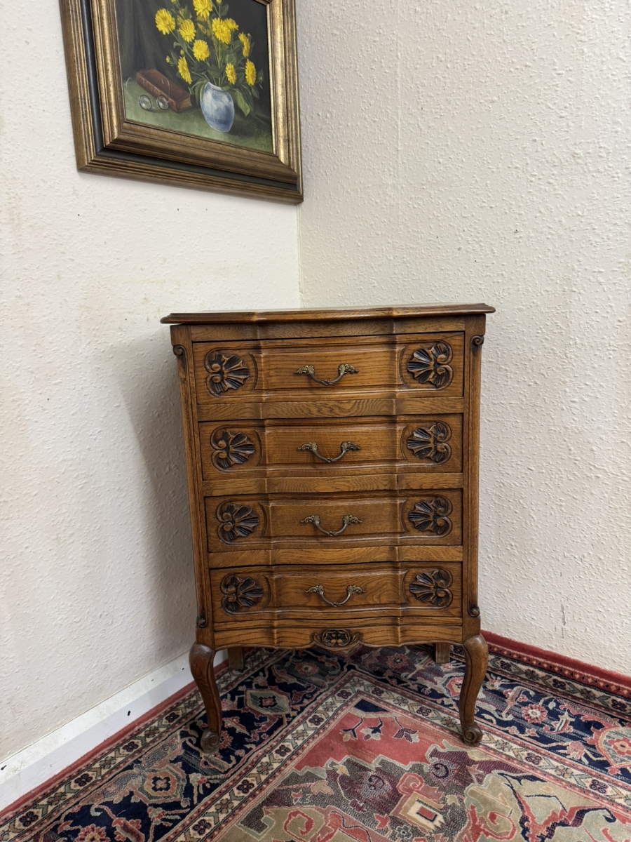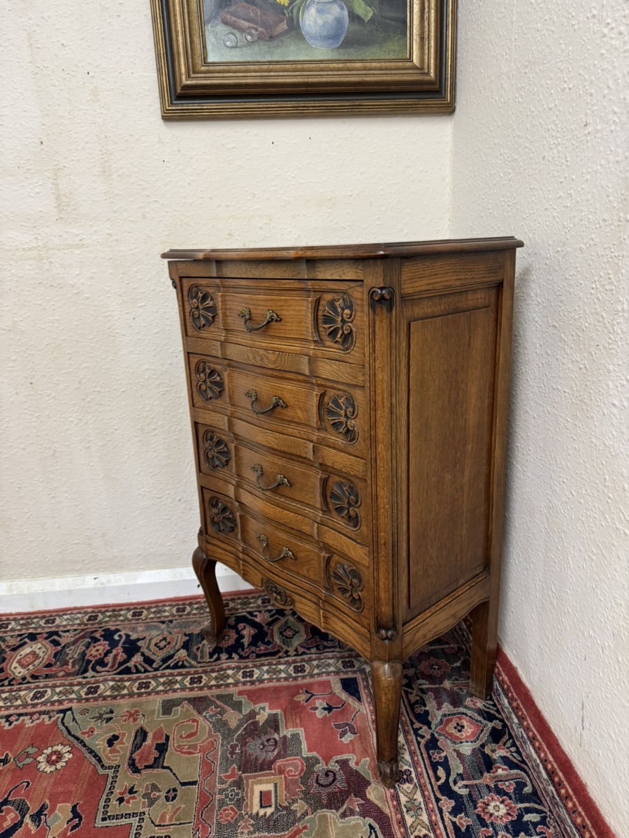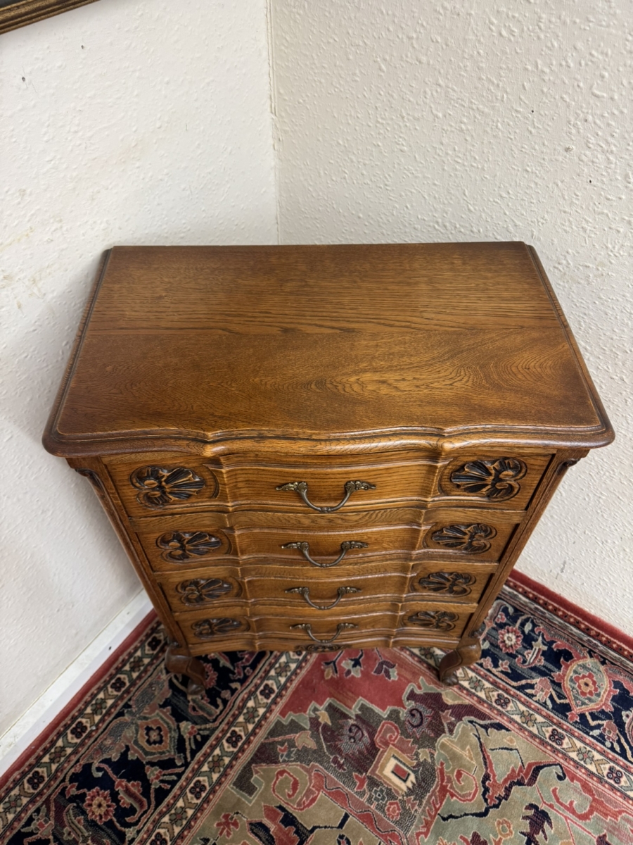 This fine chest made in striking solid oak is in excellent condition. The shaped over sailing top sits above four shaped and carved drawers, each drawer having a gilt shaped handle. Fielded panelled sides, shaped skirt with central carving and standing on two cabriole shaped legs to the front.