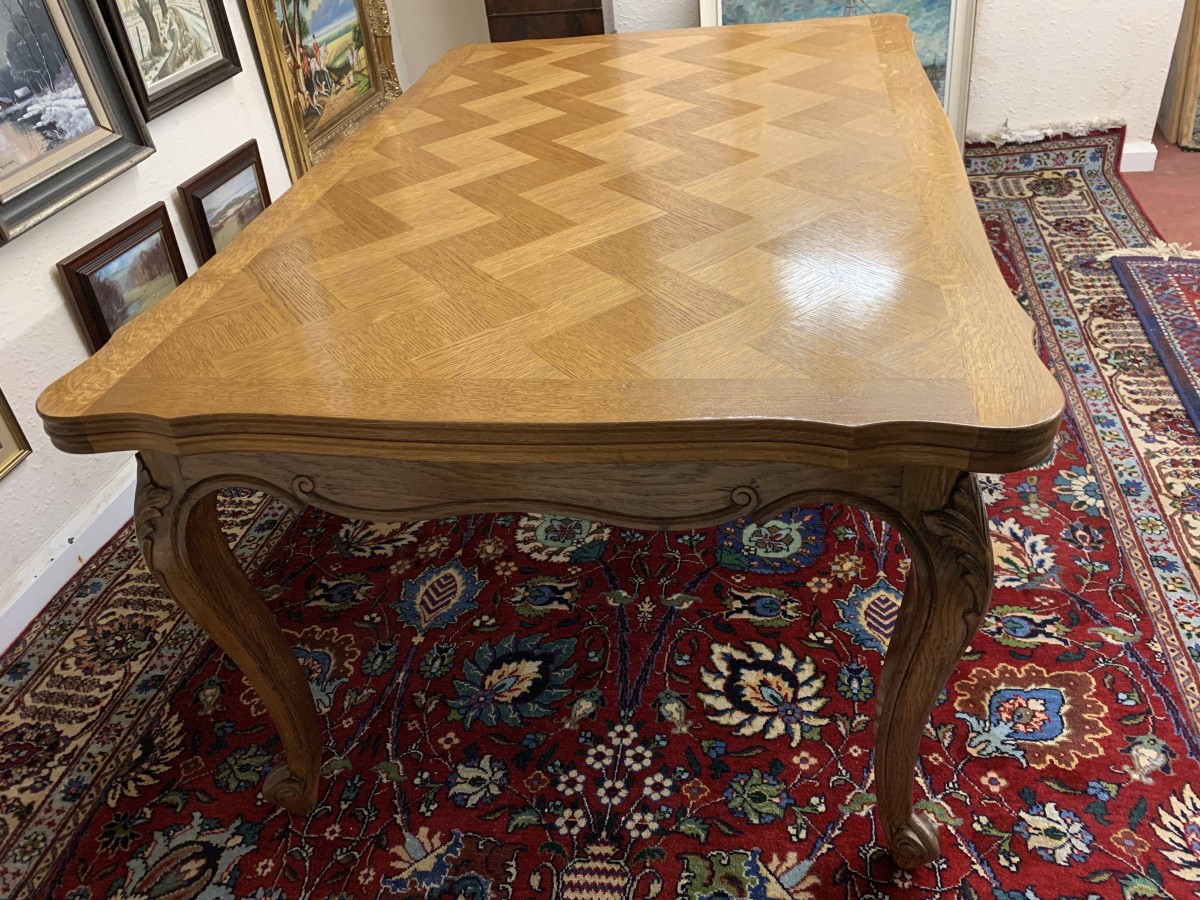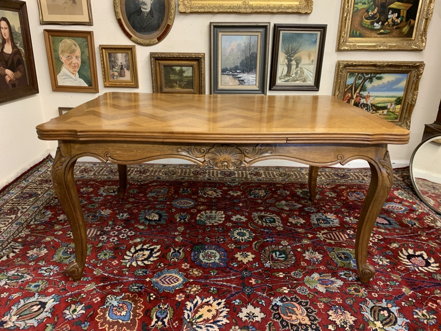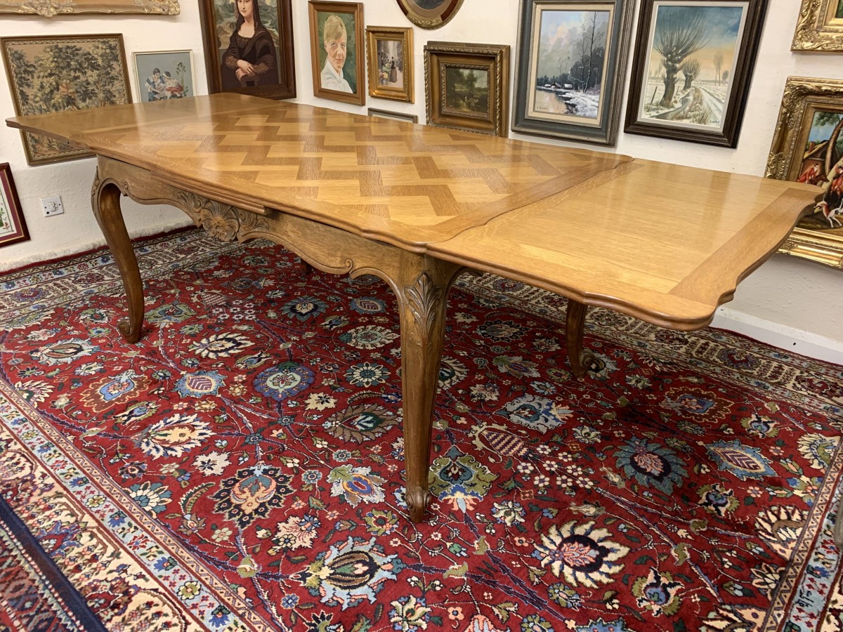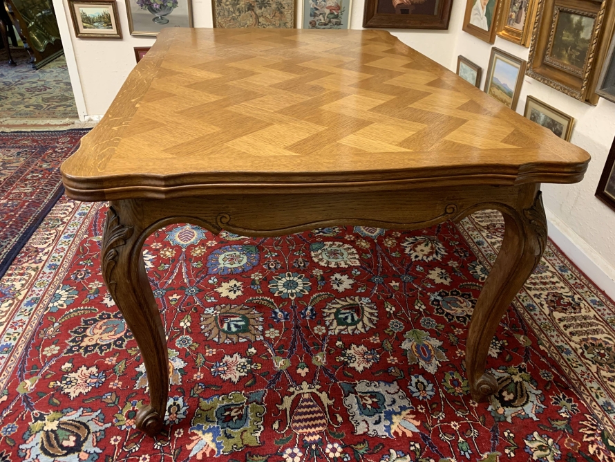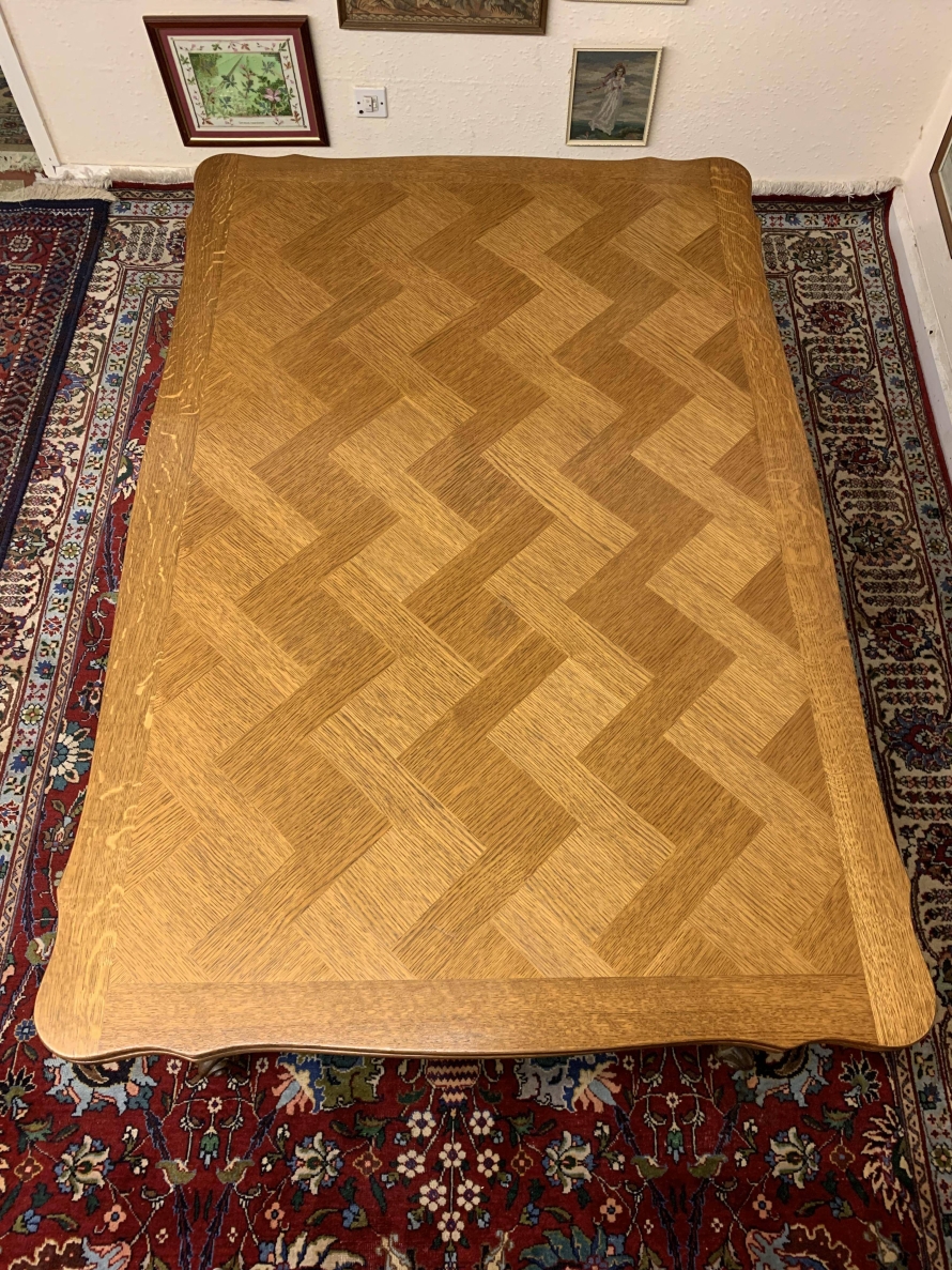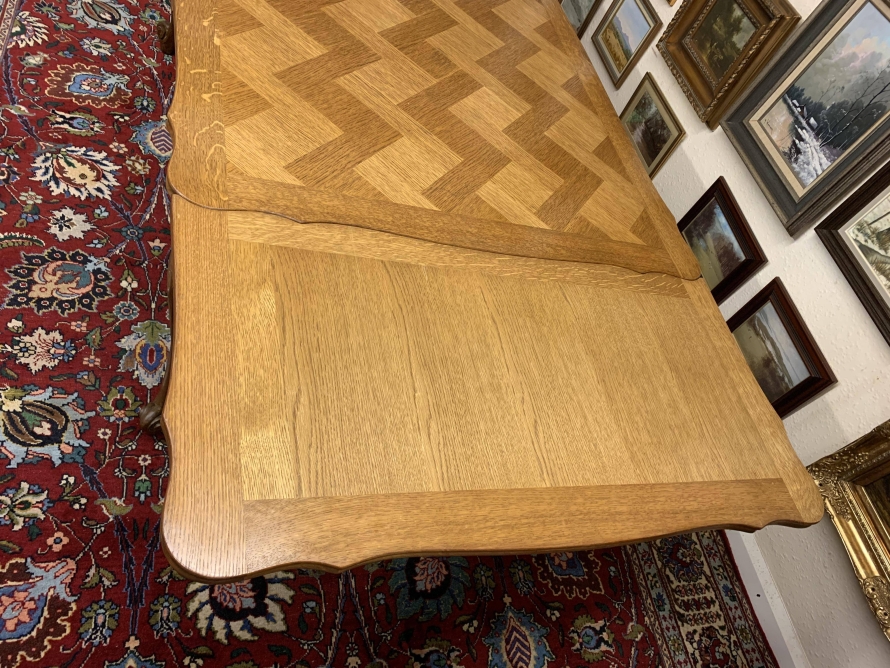 The table is made of solid oak and is in excellent condition.The shaped top has parquetry decoration. The two extendable leaves are housed at either end of the table. Shaped carved skirt this fabulous extending table sits on four elegant carved cabriole shaped legs.