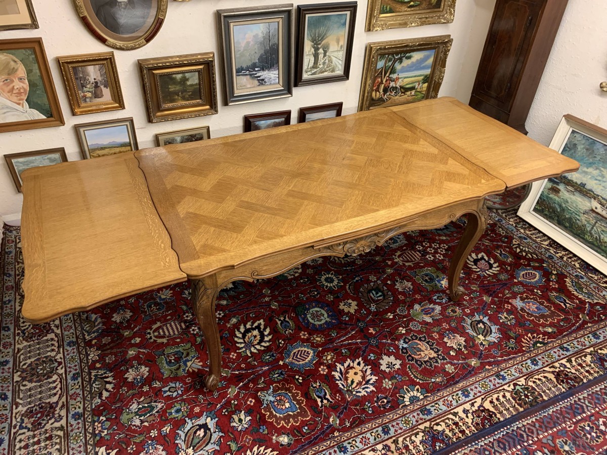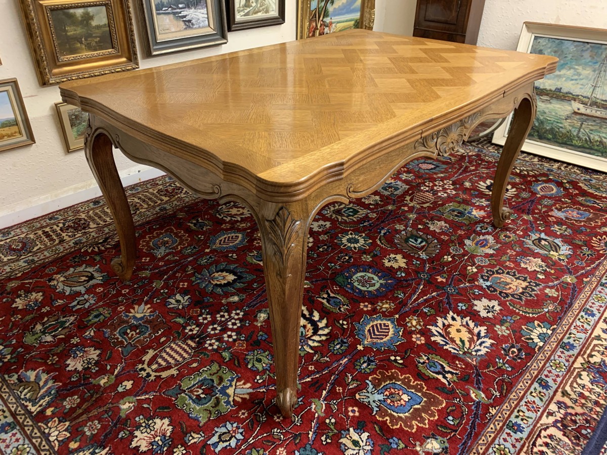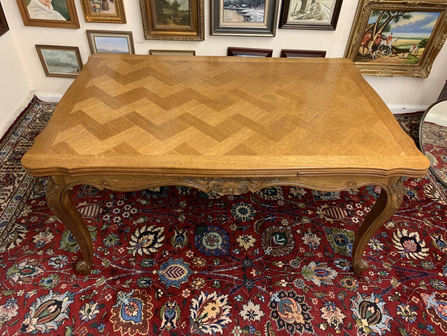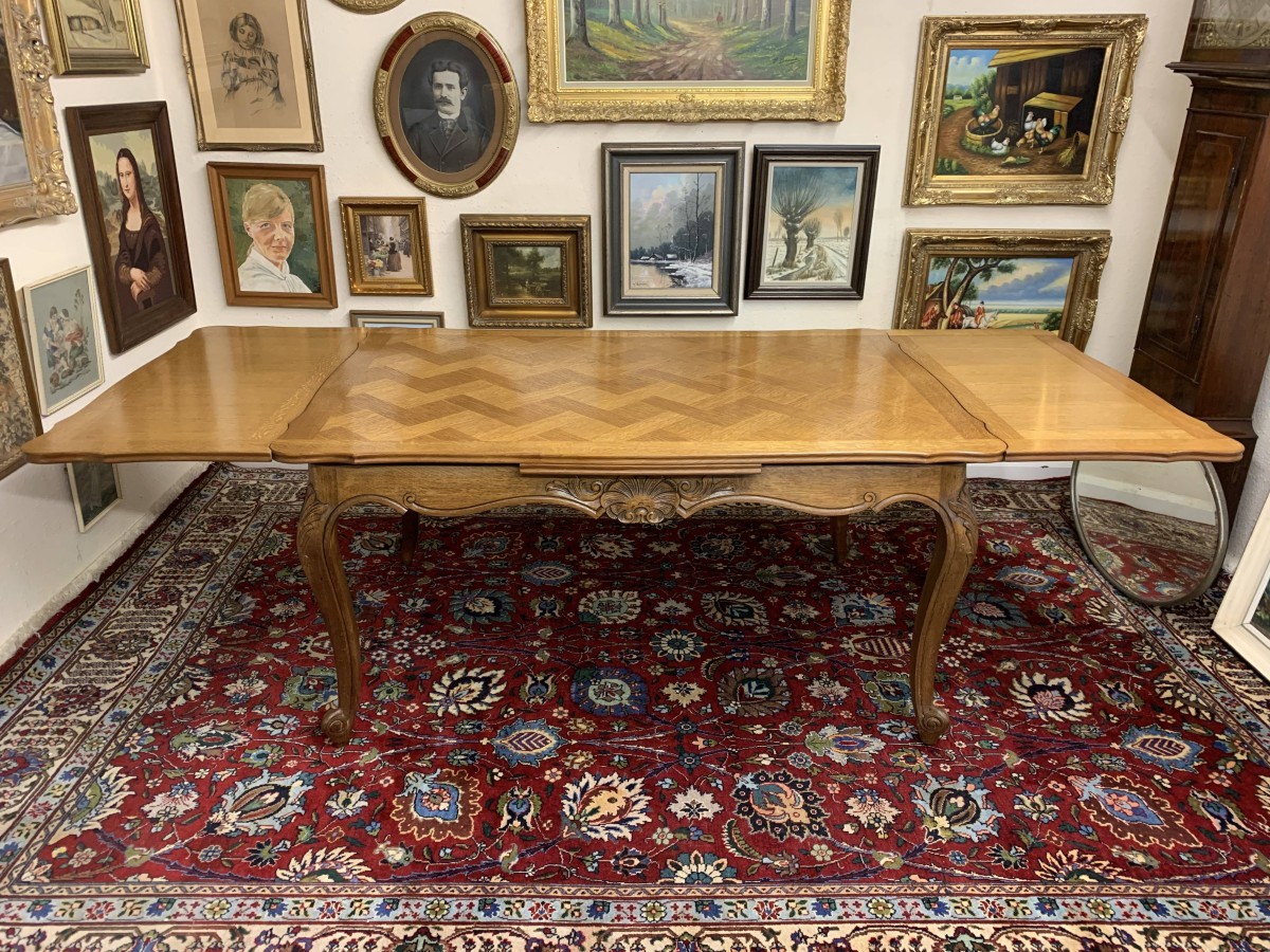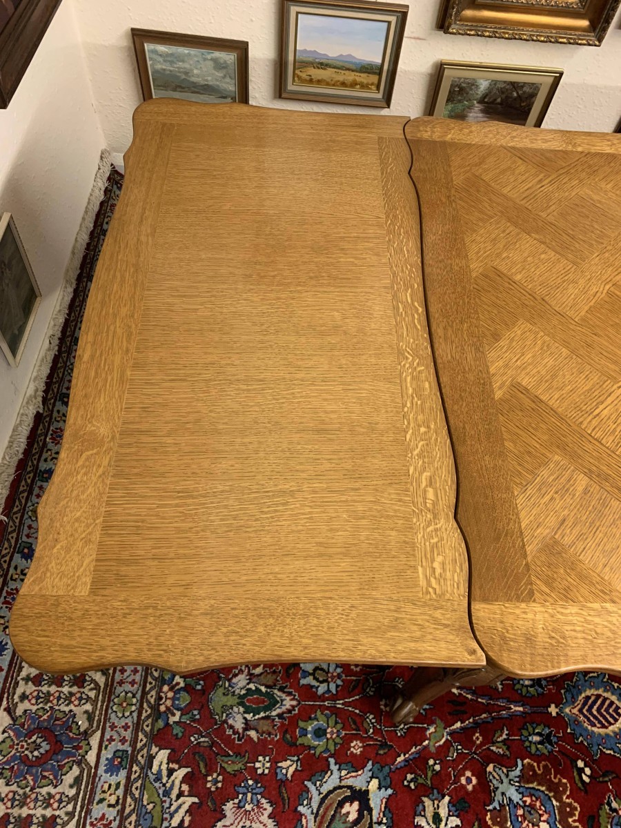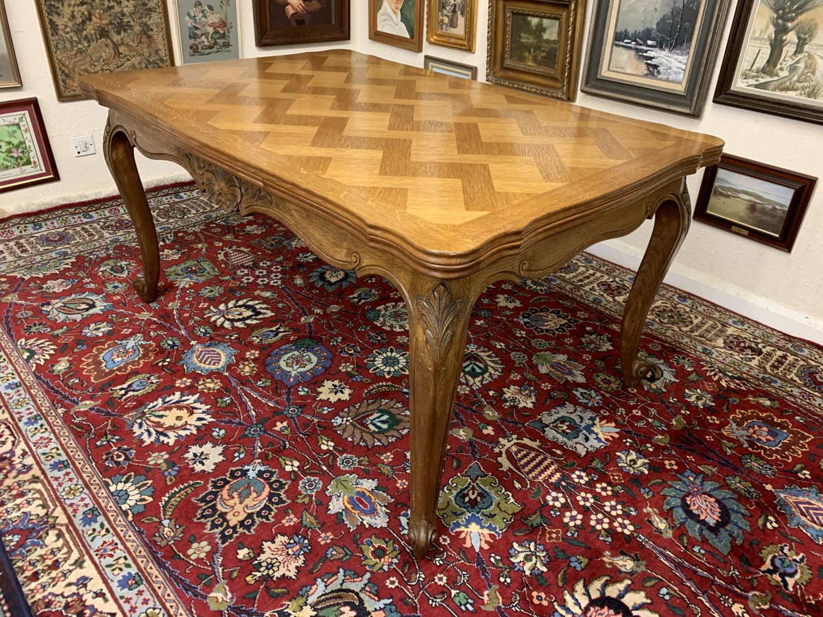 The table is made of solid oak and is in excellent condition.The shaped top has parquetry decoration. The two extendable leaves are housed at either end of the table. Shaped carved skirt this fabulous extending table sits on four elegant carved cabriole shaped legs.