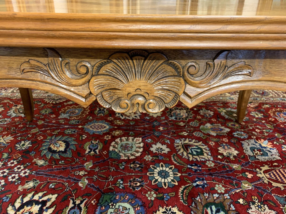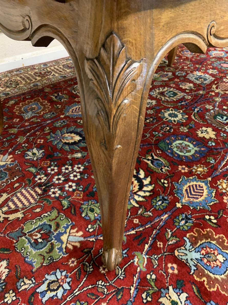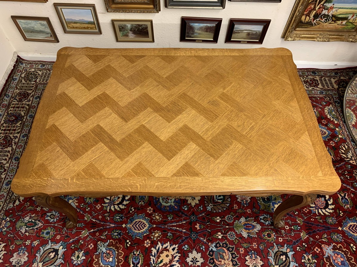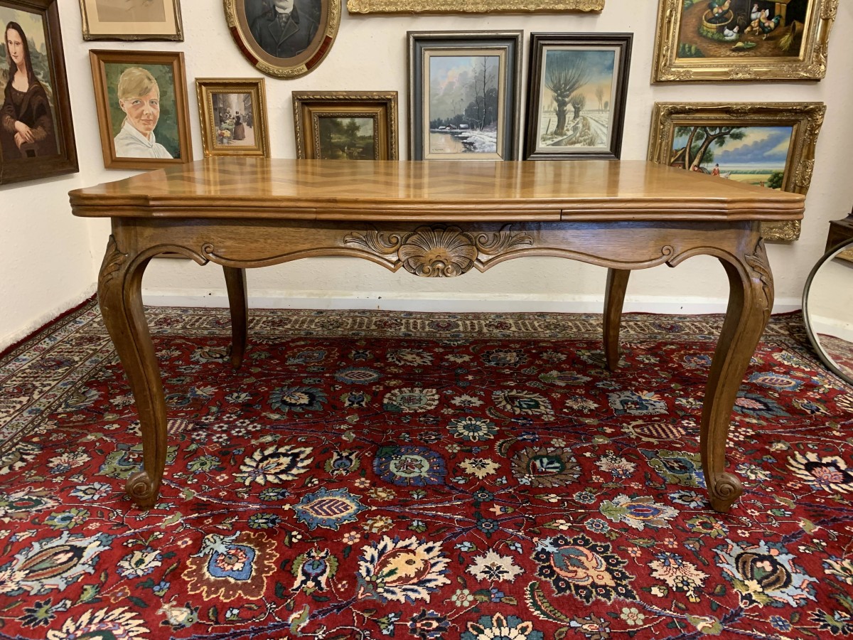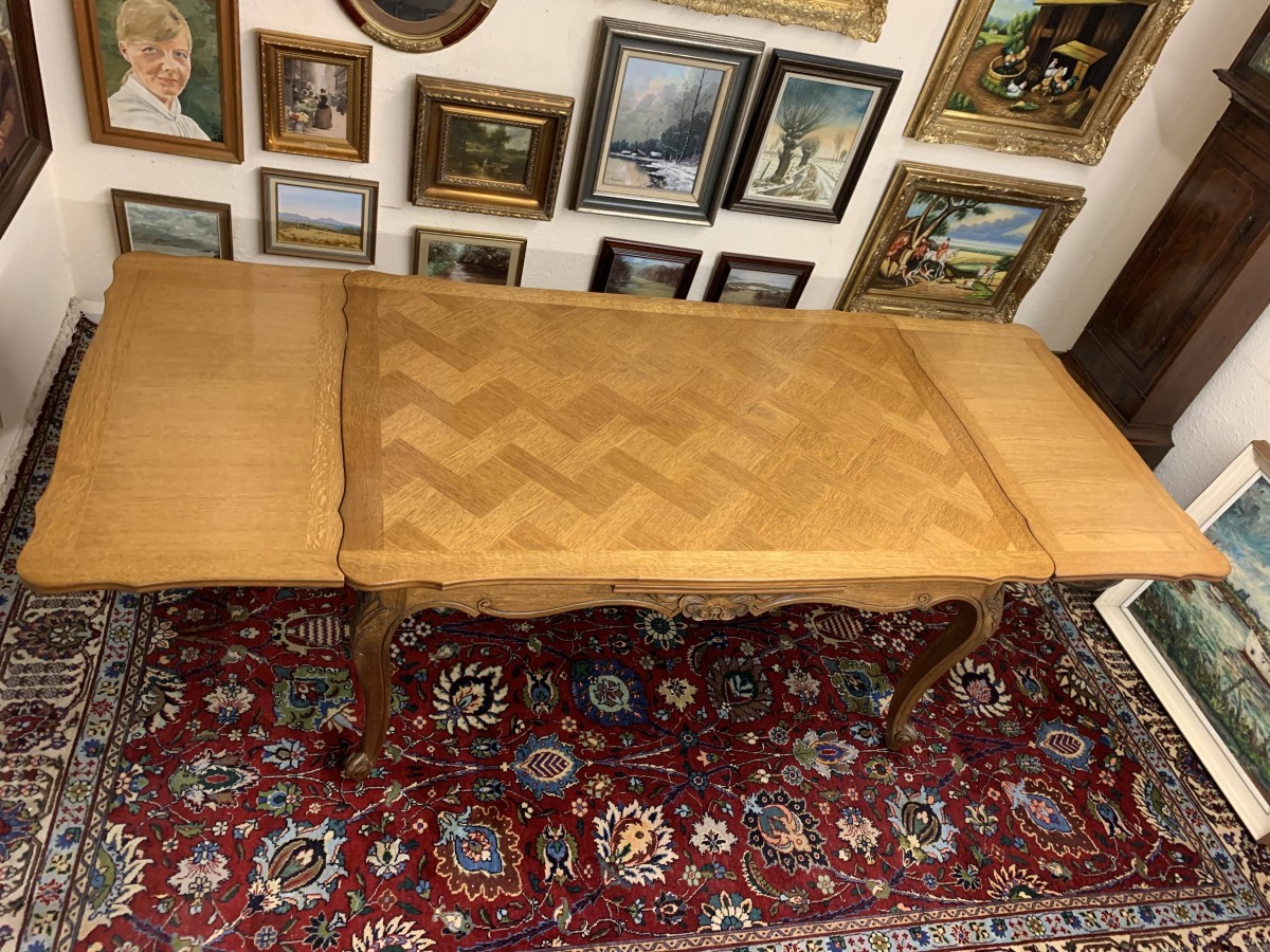 The table is made of solid oak and is in excellent condition.The shaped top has parquetry decoration. The two extendable leaves are housed at either end of the table. Shaped carved skirt this fabulous extending table sits on four elegant carved cabriole shaped legs.