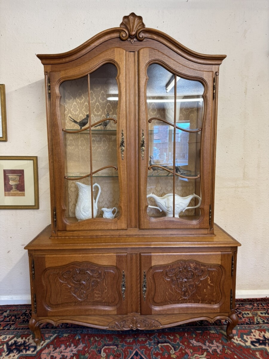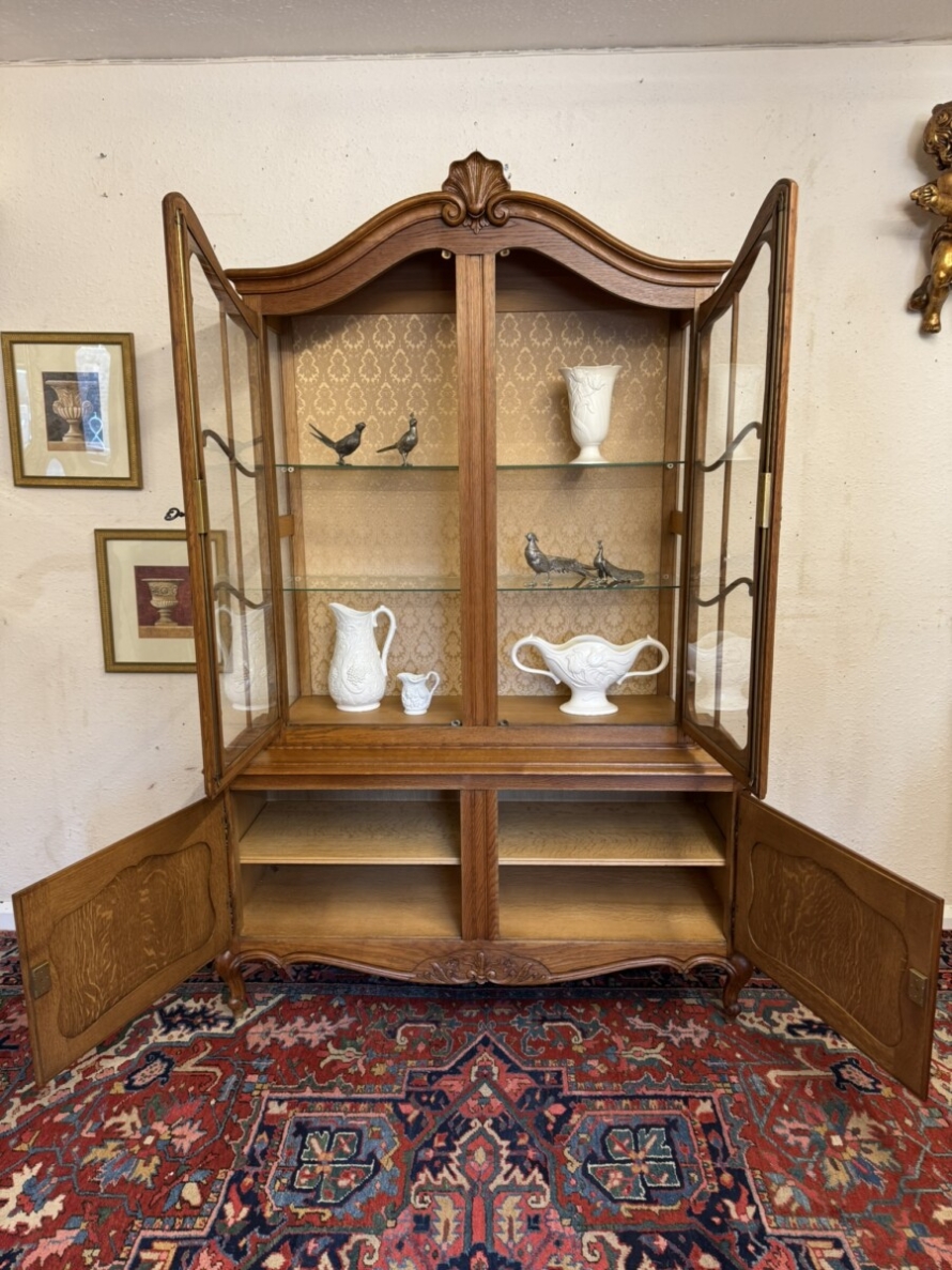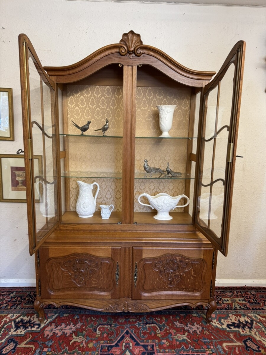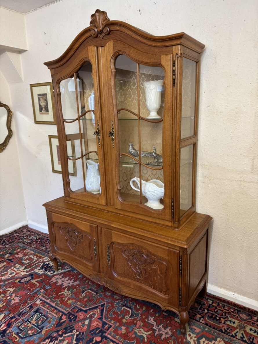 The curved oversailing top rises to a central carved crest, below are a pair of lockable glazed doors, each door having brass hinges, brass escutcheon, key and wood barring decoration. The doors open to reveal two removable glass shelves. For added display viewing the cabinet top has glazed sides. The base section has two carved recessed panelled lockable doors, each door having brass hinges and brass escutcheon. The doors open to reveal a removable wooden shelf. Recessed panelled sides, shaped skirt with decorative central carving and standing on two carved cabriole shaped legs to the front.